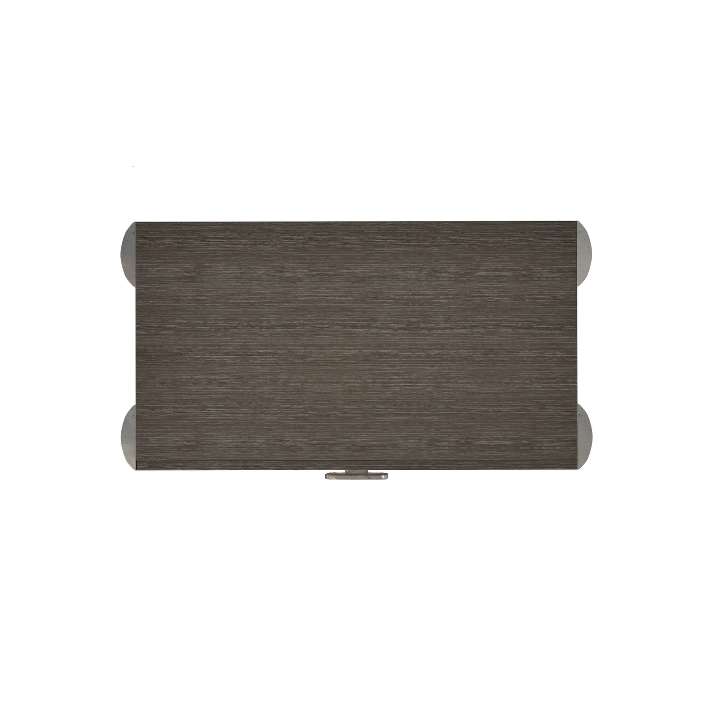 The deep Porcini finish on the Prado nightstand is balanced with the gleam of textured and shaped cast aluminum legs. The drawer box appears to float between the supports and offers a single drawer. A two-port USB charging system is included on the back of the case.
