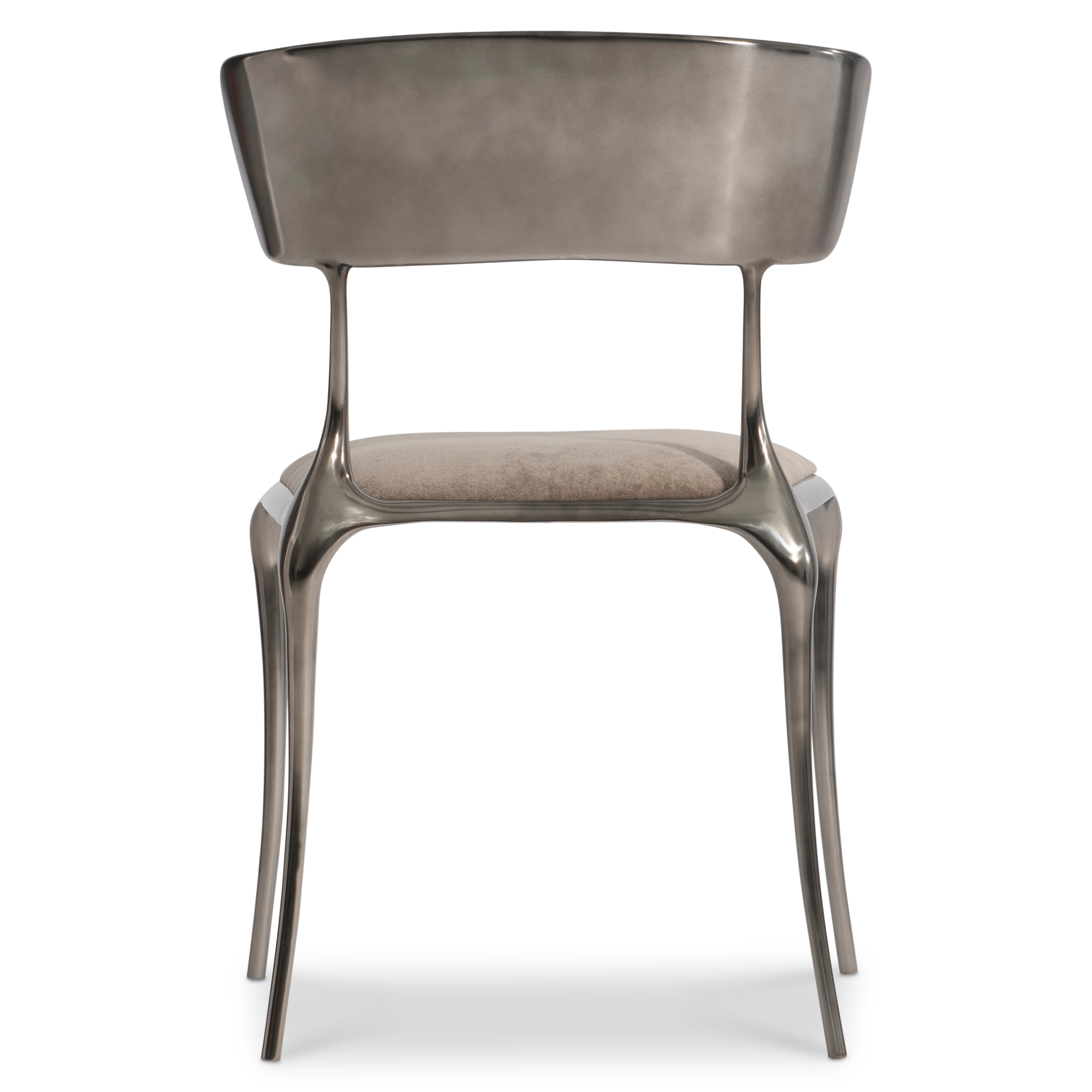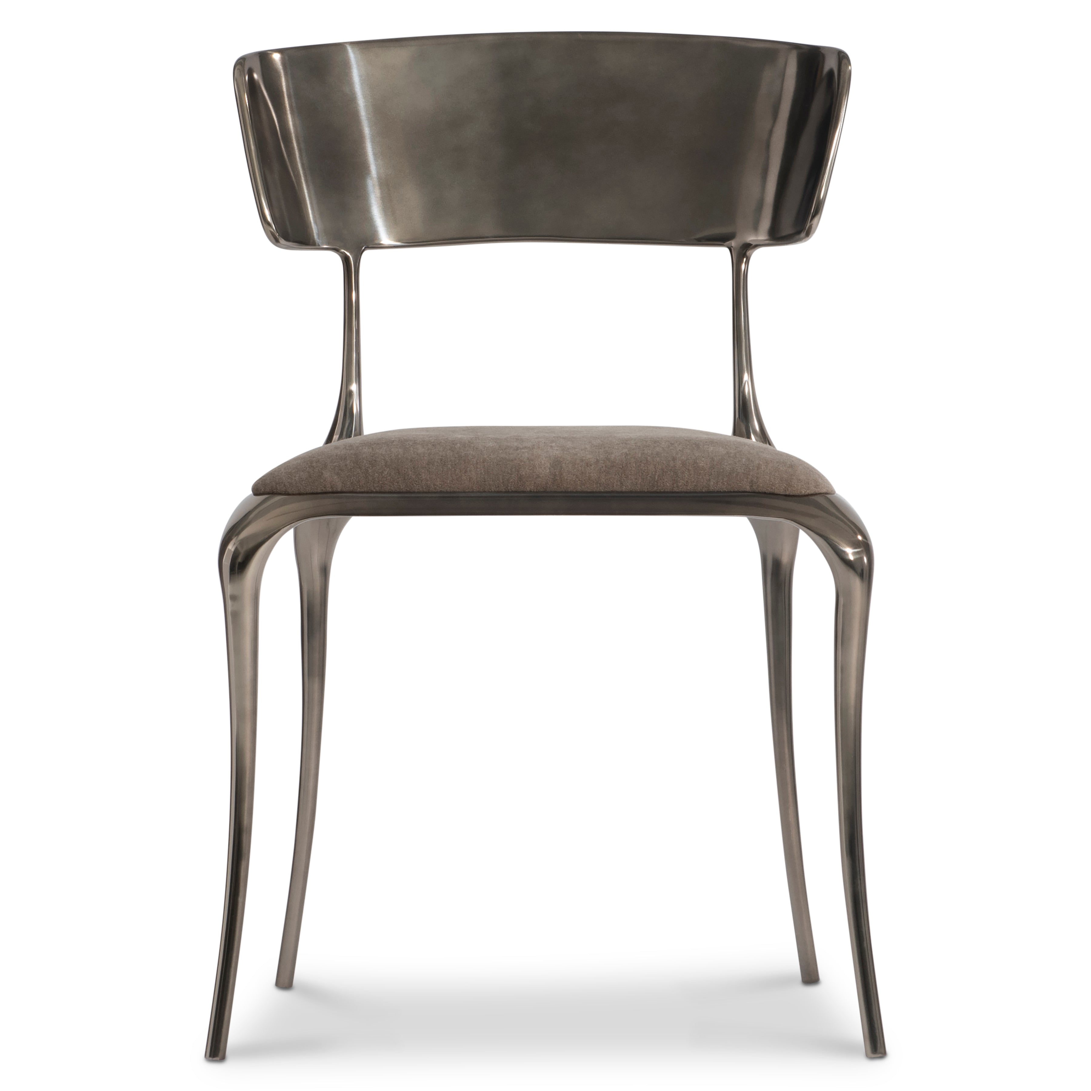 The classic Klismos design gets a sleek, modern update in the Pravo side chair. A curvaceous profile flows in a warm bronzed metal with a rounded back and shapely legs. Comfort is also provided with an upholstered seat.