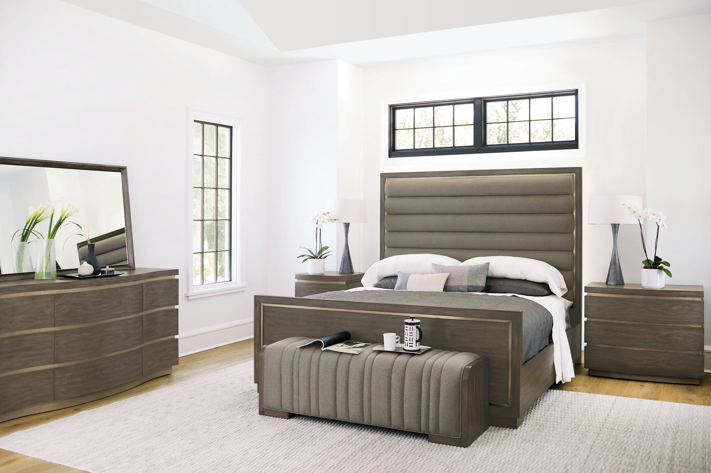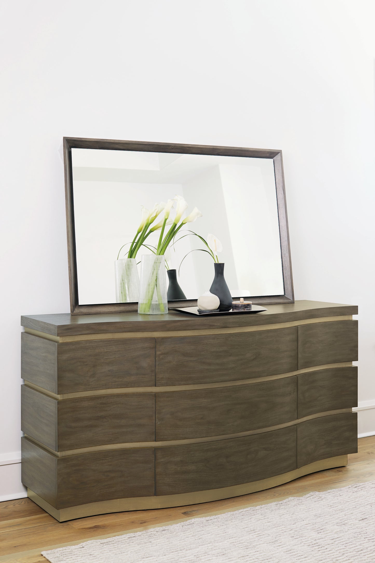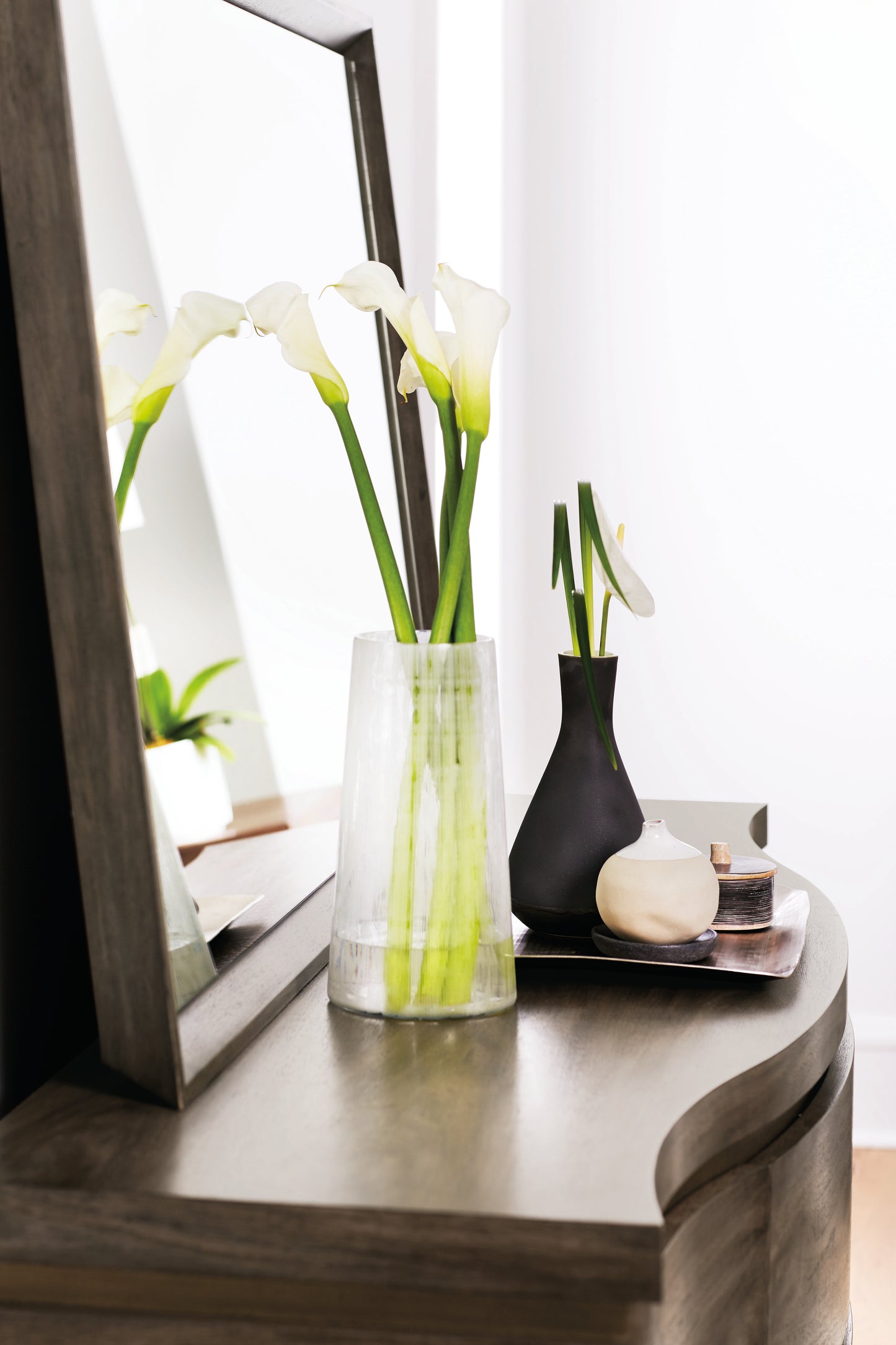 The Profile mirror balances a sleek form with a natural finish, delivering rustic modern style. The frame is crafted from flat-cut walnut veneers featuring crossfire, which is mottling or flash that occurs beneath the grain. The casual Warm Taupe finish is low-sheen with an open wood grain that emphasizes the natural color and character of the veneer. Floating mirrored glass adds dimension and depth.