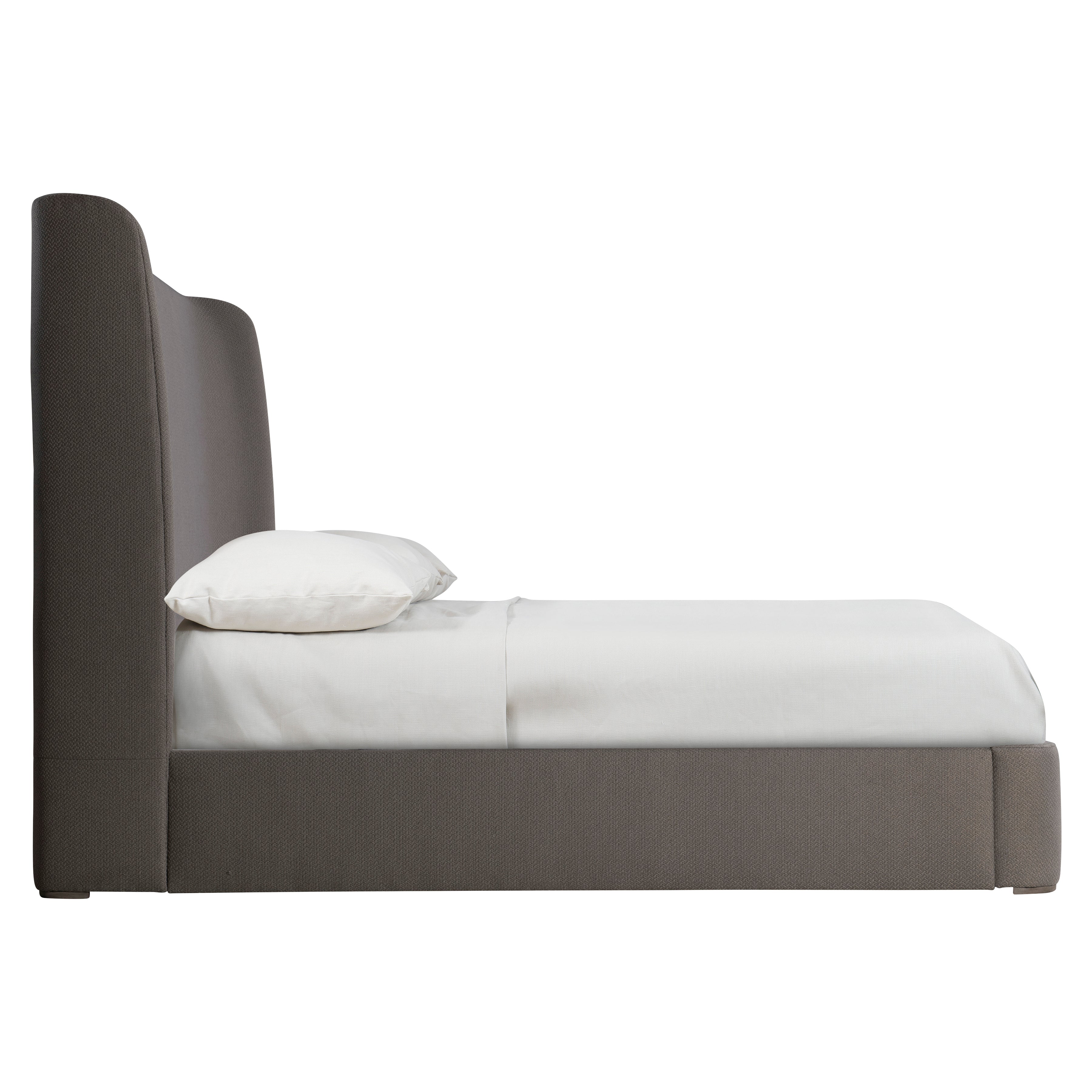 The Puro bed takes a traditional shelter design to new heights for comfort and style. The fully upholstered headboard wraps around at the corners and is supported by exposed wood feet in Smoke finish. Fully upholstered footboard and side rails continue the comfort story for a gorgeously inviting look.