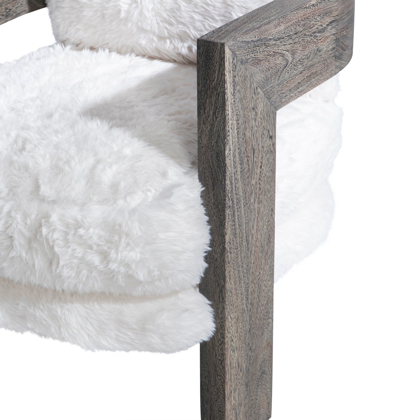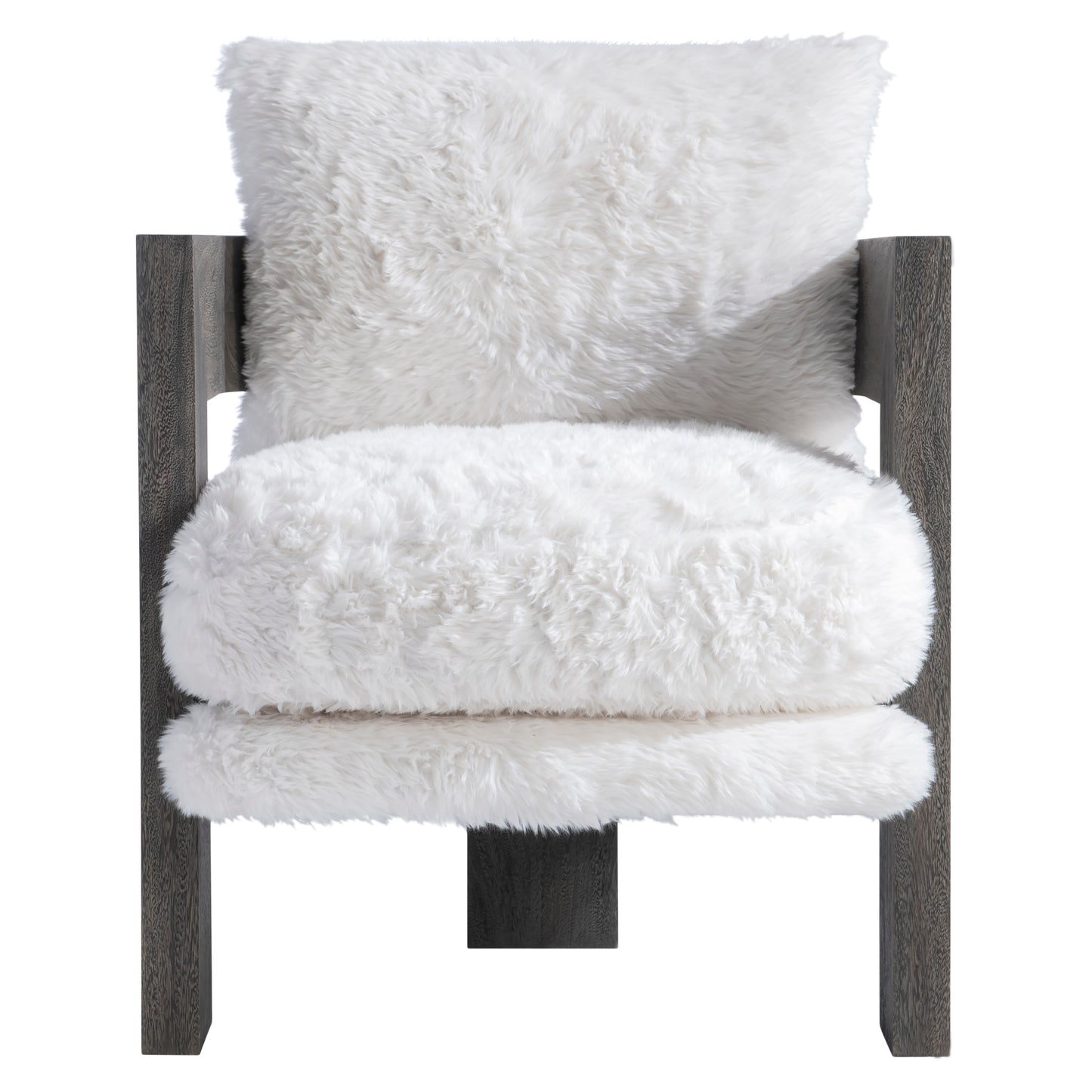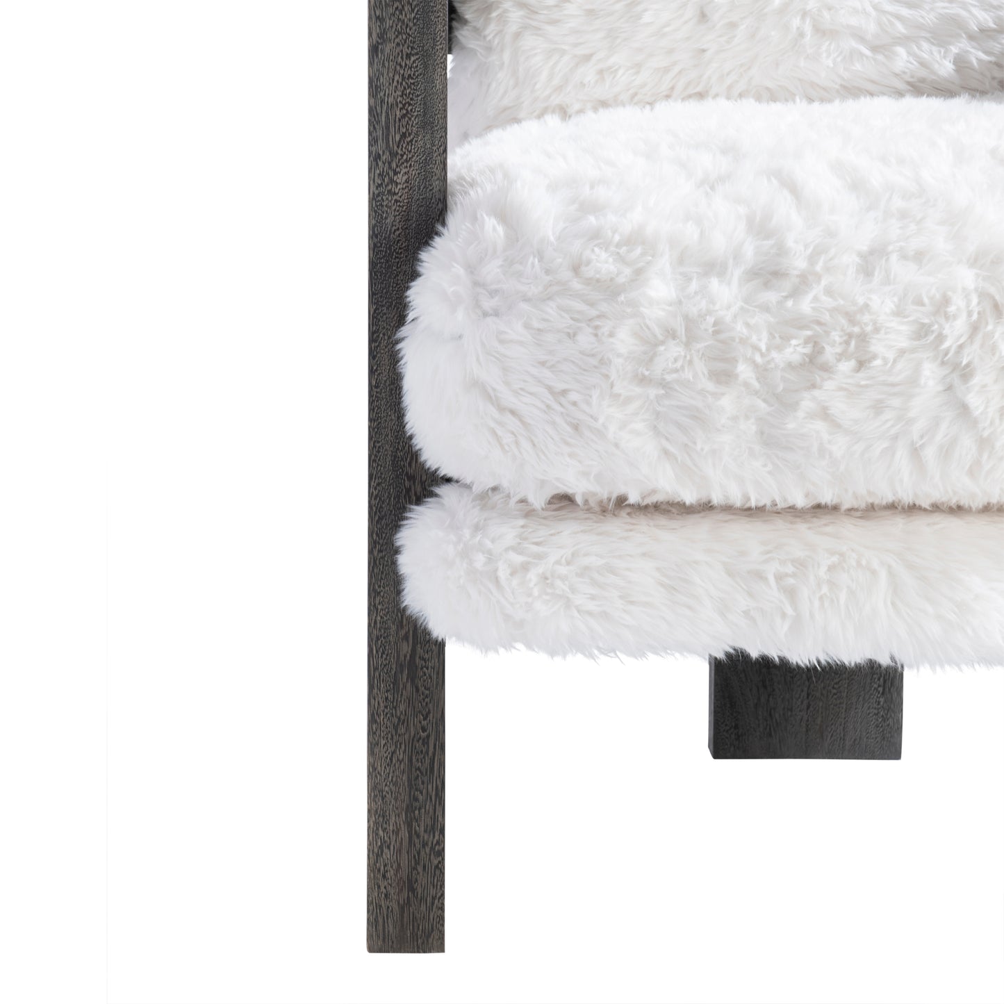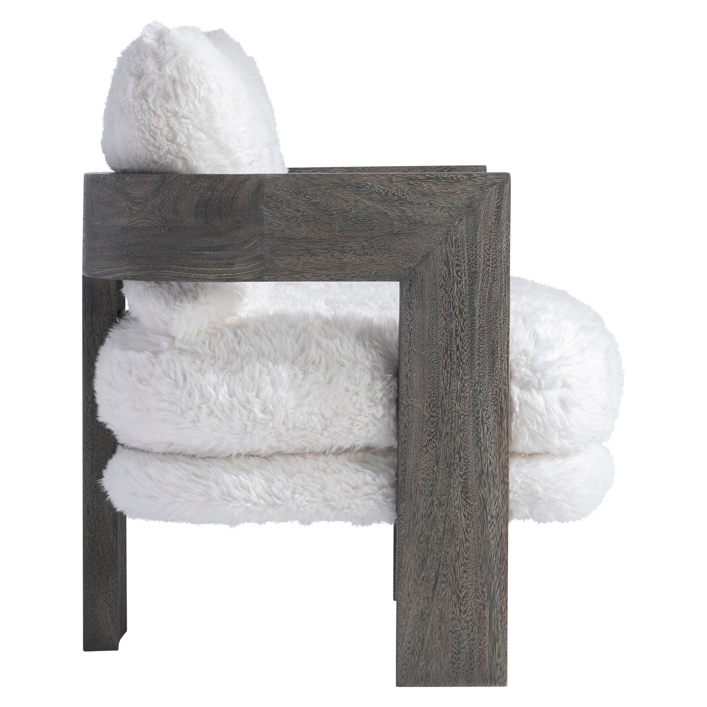 The Renny chair is a unique and modern design with an exposed wood frame that wraps around the seat and back. Three wide legs flow to the floor, creating an organic look. Texture is key, with the wood balancing the softness of the plush fabric. Available only in Smoked Truffle finish.