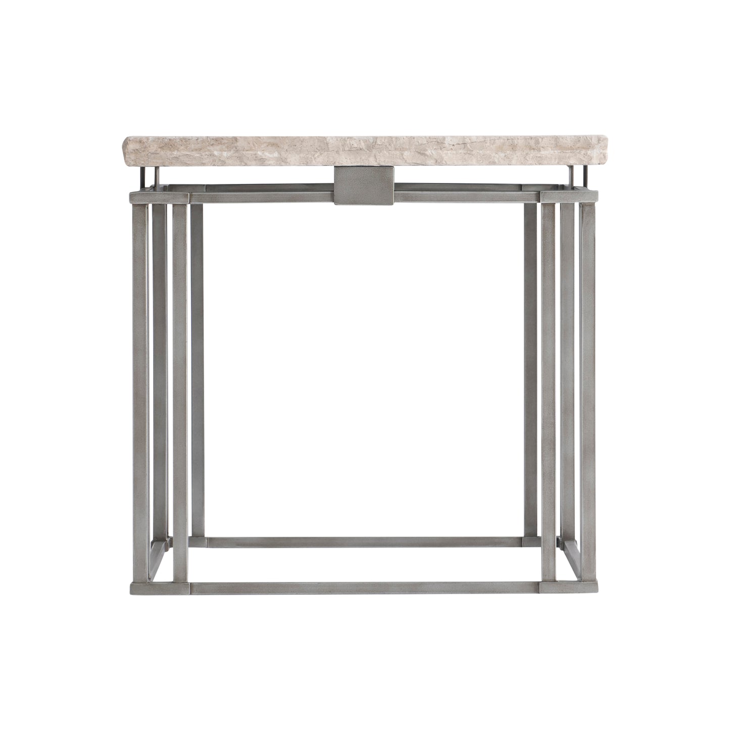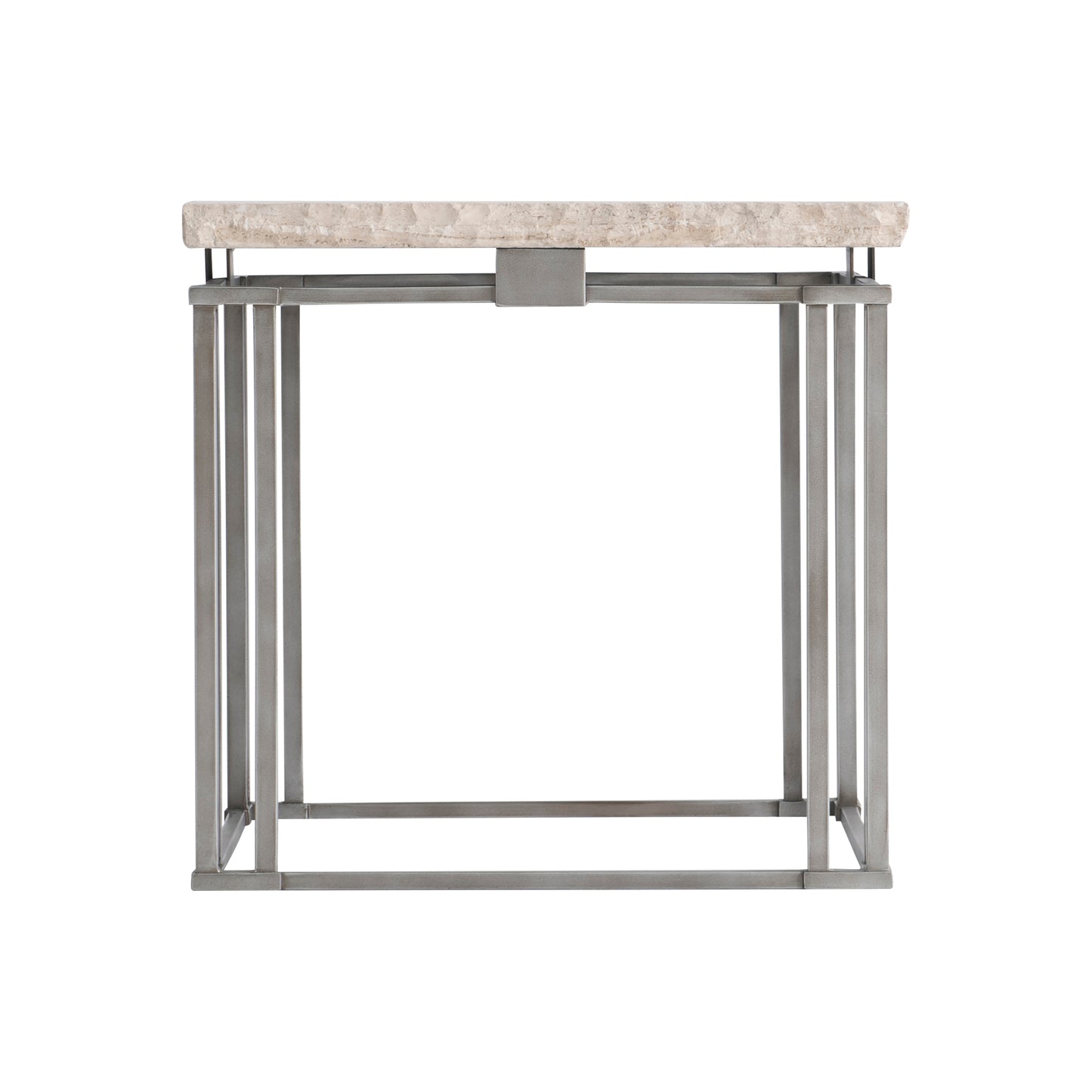 The Riverton side table's design finds its inspiration in the Arts and Crafts period, with simple lines that celebrate form and style. Metal bars interlock for the base, allowing a honed Bianco Travertine laminated stone top to float above the frame.