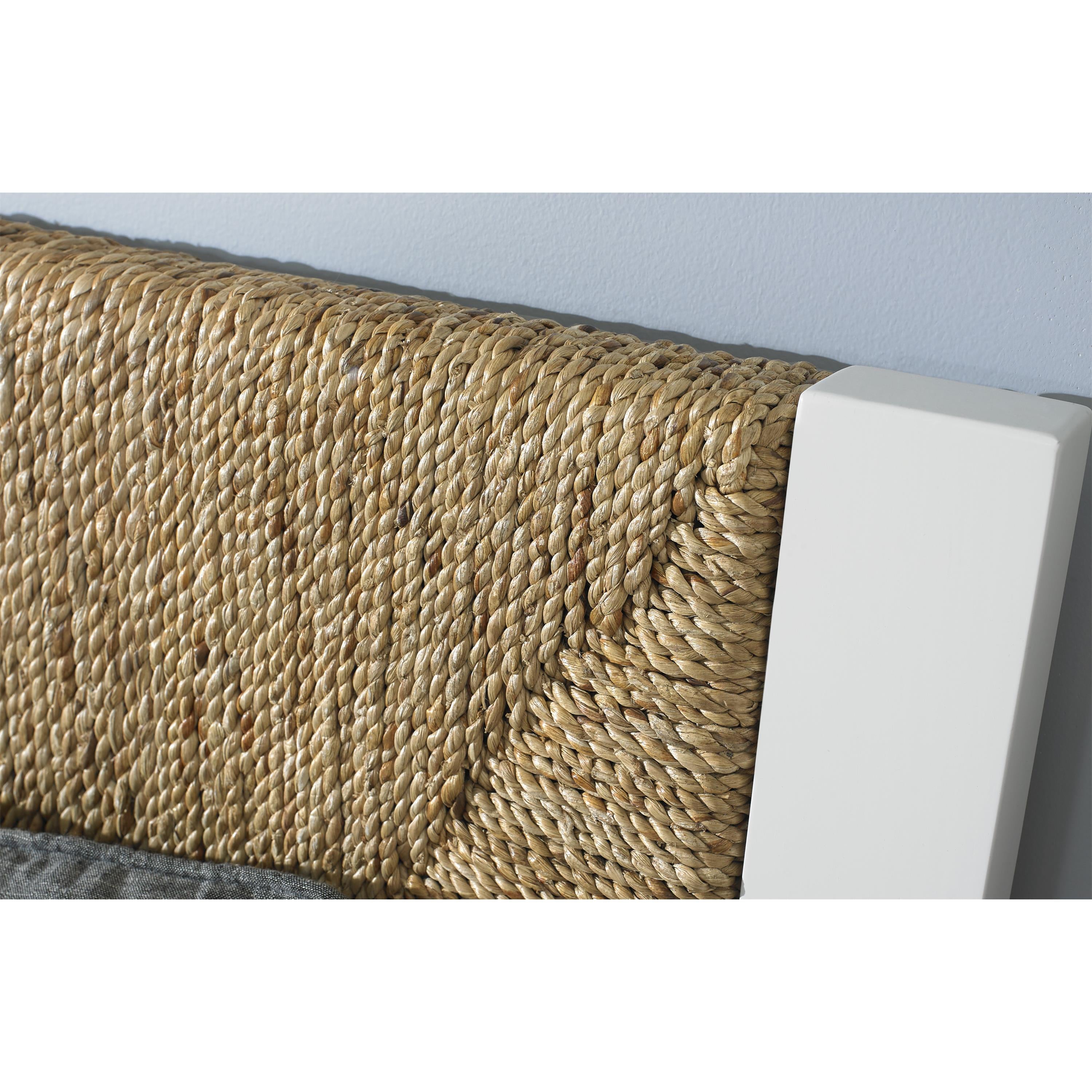 • Contrasting white square posts frame the mitered pattern woven rush panel