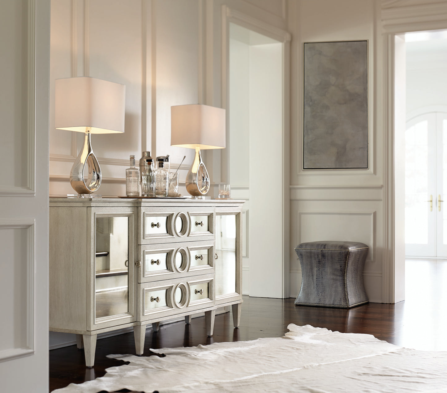 Fine craftsmanship, unique materials, and modern styling characterize the eclectic Bernhardt Interiors collection. With a compact size and an elegant design, the Roscoe leather ottoman is the perfect accent for the luxe interior. The sides curve gently inward to form an hourglass shape, accentuated by refined nailhead trim. From a variety of fine leathers and finishes, this piece may be customized to suit any room.