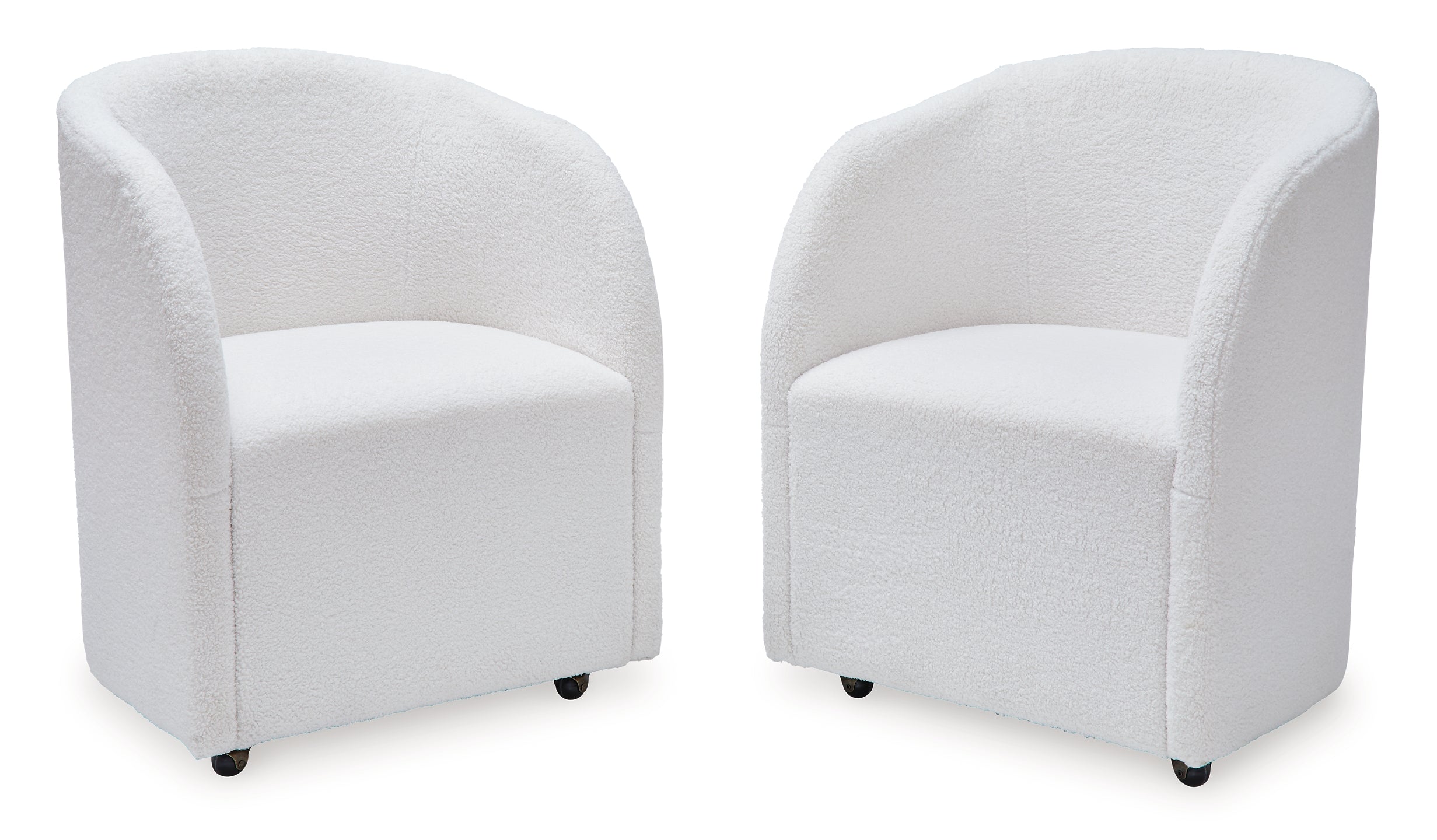 Inspired by art deco design, this fully upholstered dining chair makes a lasting impression in a simply stunning way. Its magnificent curved silhouette is enhanced with a neutral boucle upholstery that’s so pleasing to the palate. This is the piece you’ve been looking for to elevate your contemporary decor whether you’re dining, listening to your latest playlist or binge-watching with friends. Plus, it’s set on casters so it’s easy to move around.