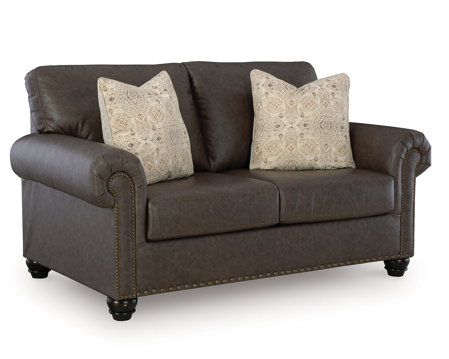 This loveseat marries classic character with a contemporary attitude. Love the timeless look of leather? Its take on deep brown faux leather is versatile enough to pair with styles from traditional to modern, at a price that won’t break the bank. Details like nailhead trim and roll arms polish off the piece with flair.