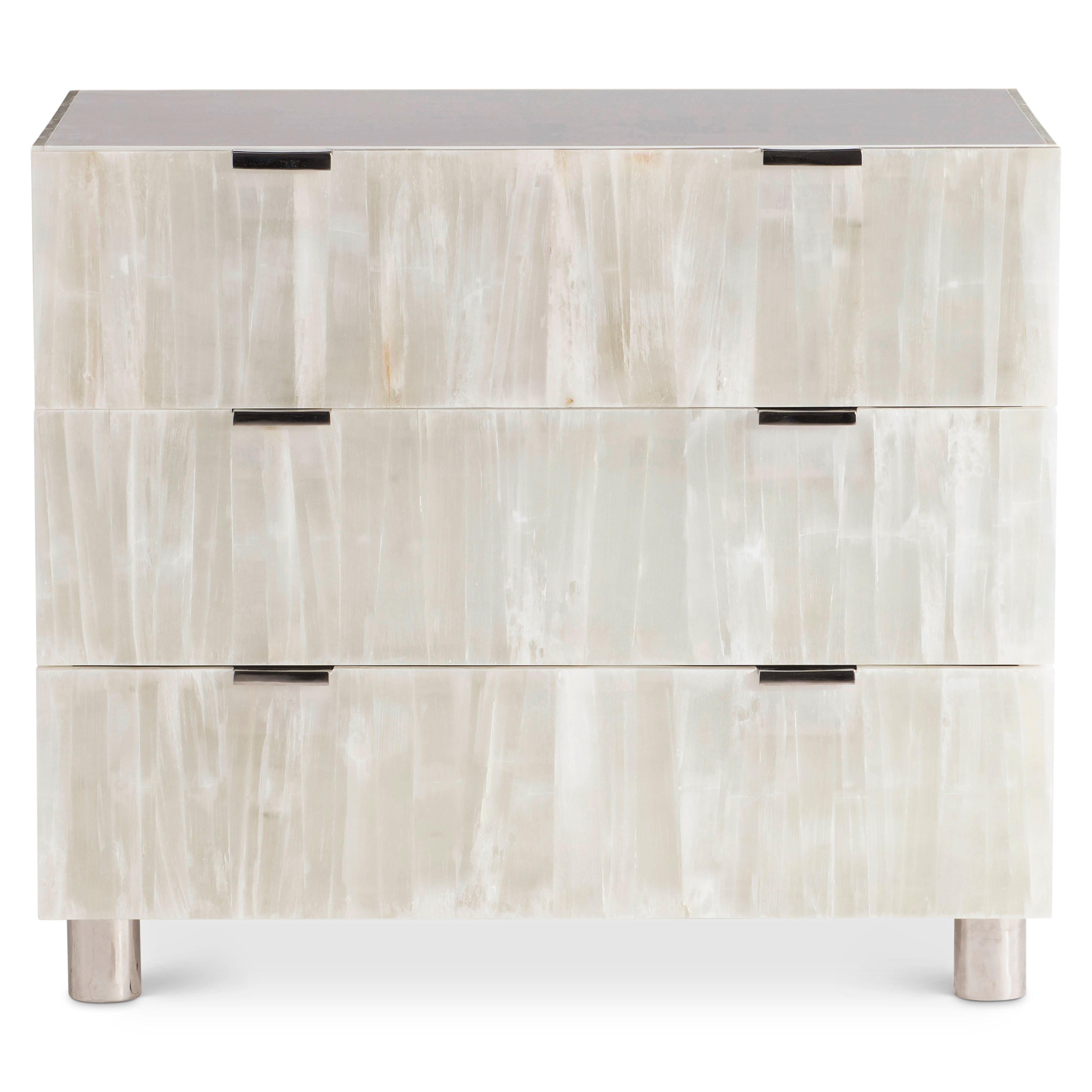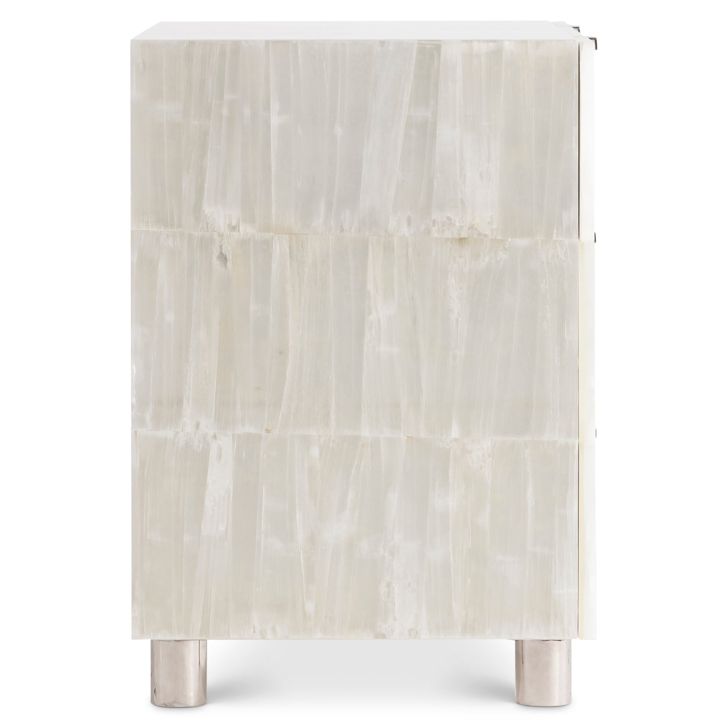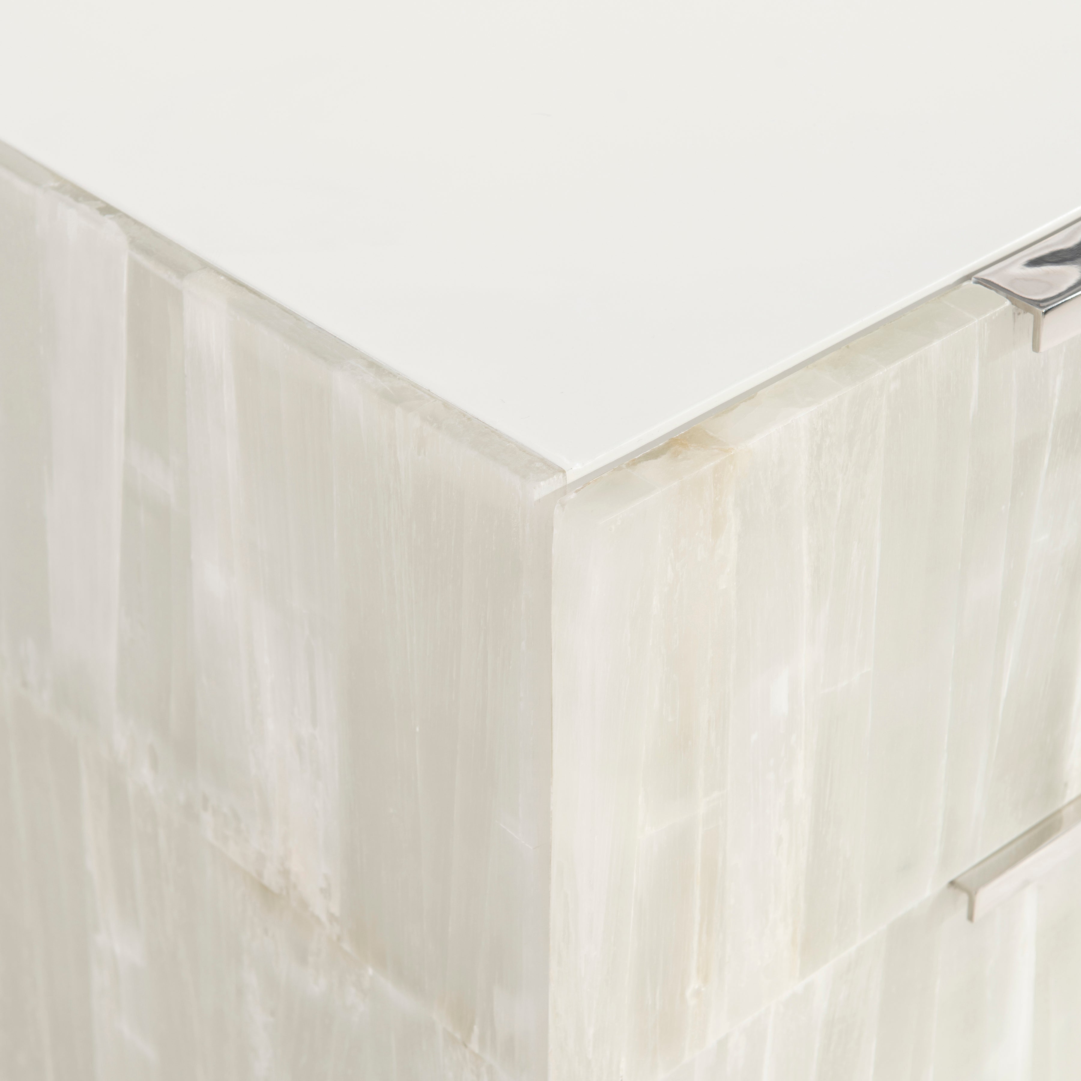 Selenite crystals wrap the Salka nightstand, adding a soft glow of shape and style. The top and interior are finished with white lacquer, while the drawers are accented with polished stainless steel hardware. The back features an A+C USB charging system.