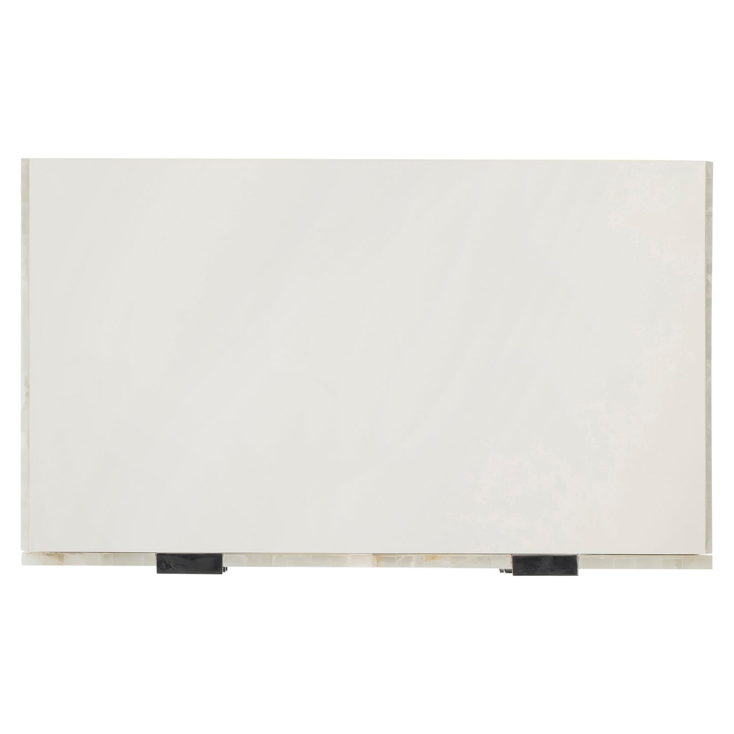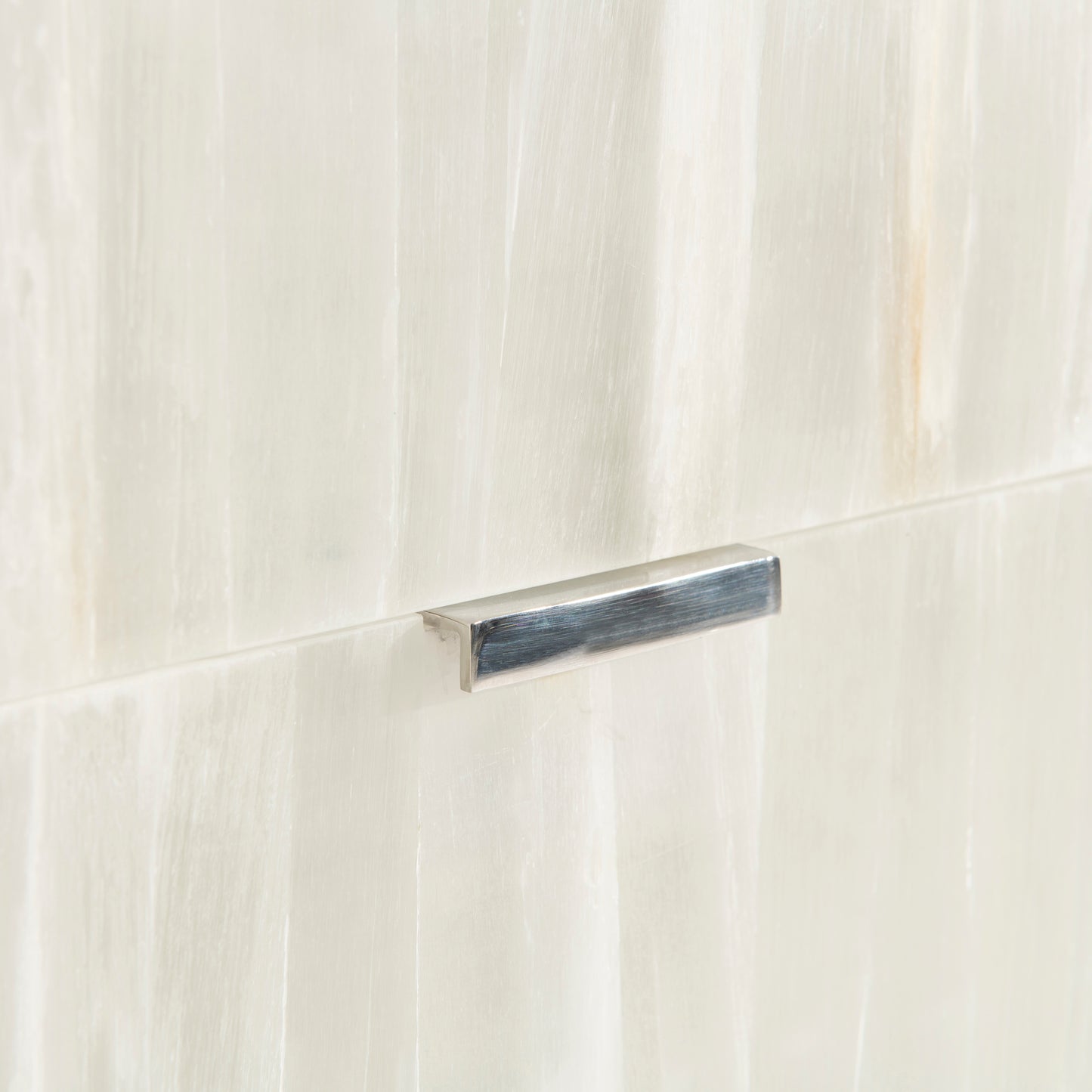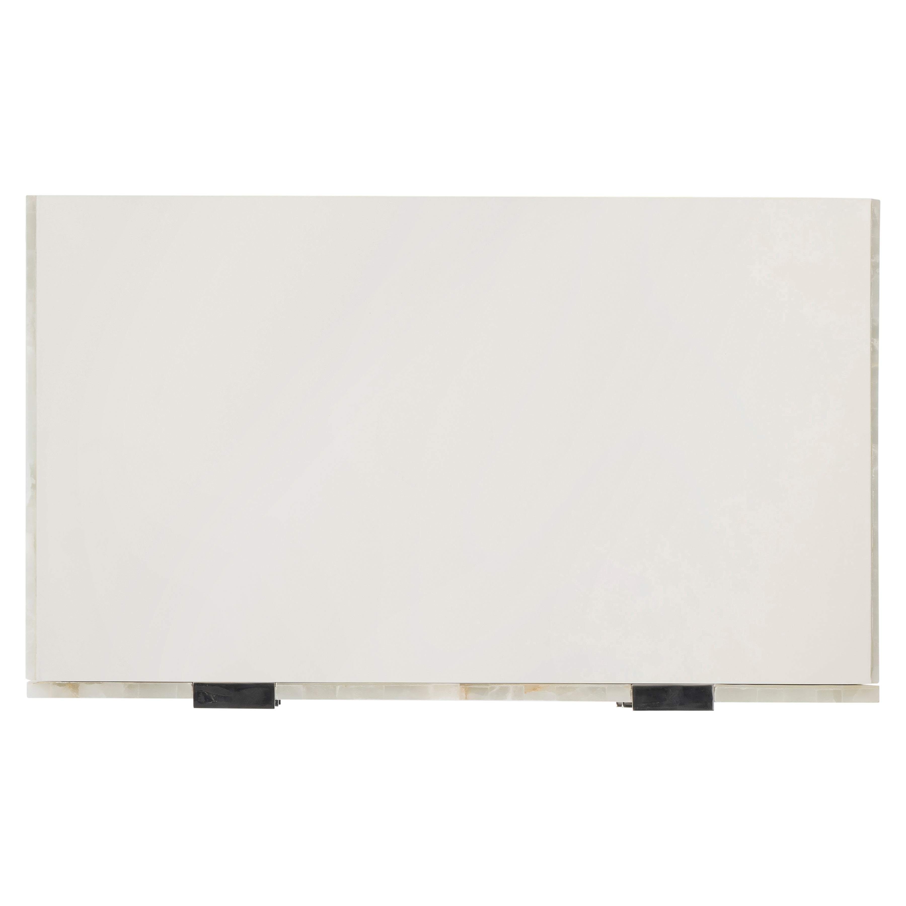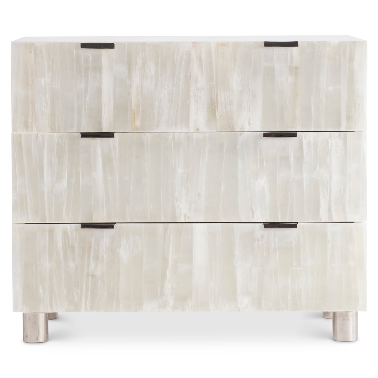 Selenite crystals wrap the Salka nightstand, adding a soft glow of shape and style. The top and interior are finished with white lacquer, while the drawers are accented with polished stainless steel hardware. The back features an A+C USB charging system.