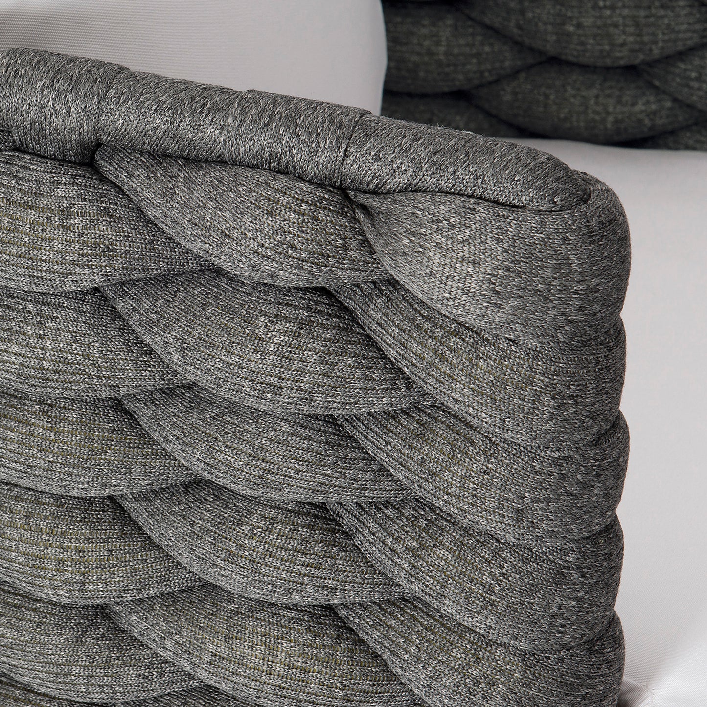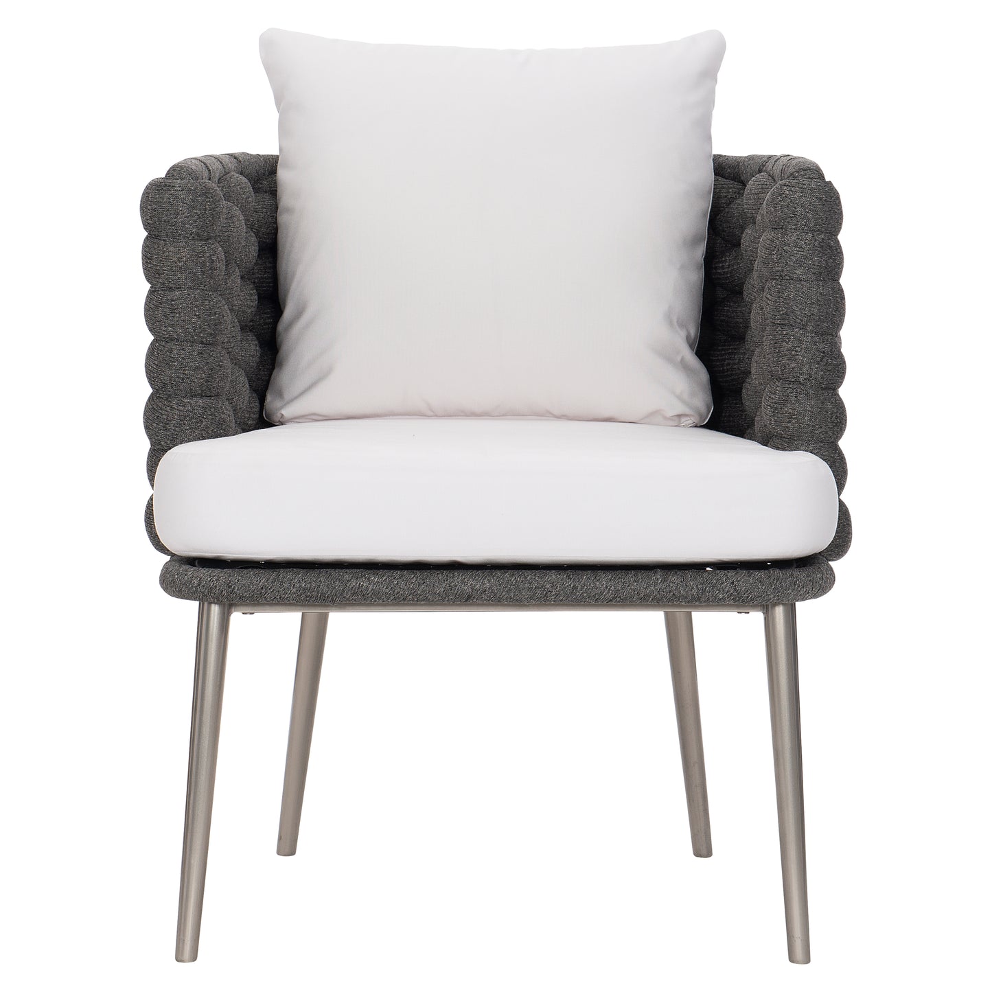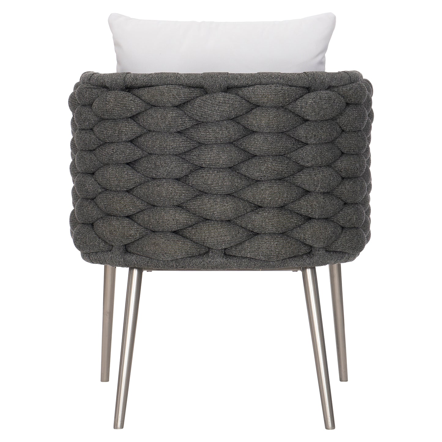 Featuring an all-weather soft-knit sock weave in Cadet Grey wrapped around an aluminum frame, the Santa Cruz arm chair offers luxurious comfort and modern appeal with an organic touch. The barrel-shaped seat rests on delicate but strong Silver Mist powder-coated stainless steel splayed and tapered legs. A comfortable cushion and back pillow are soft and inviting.