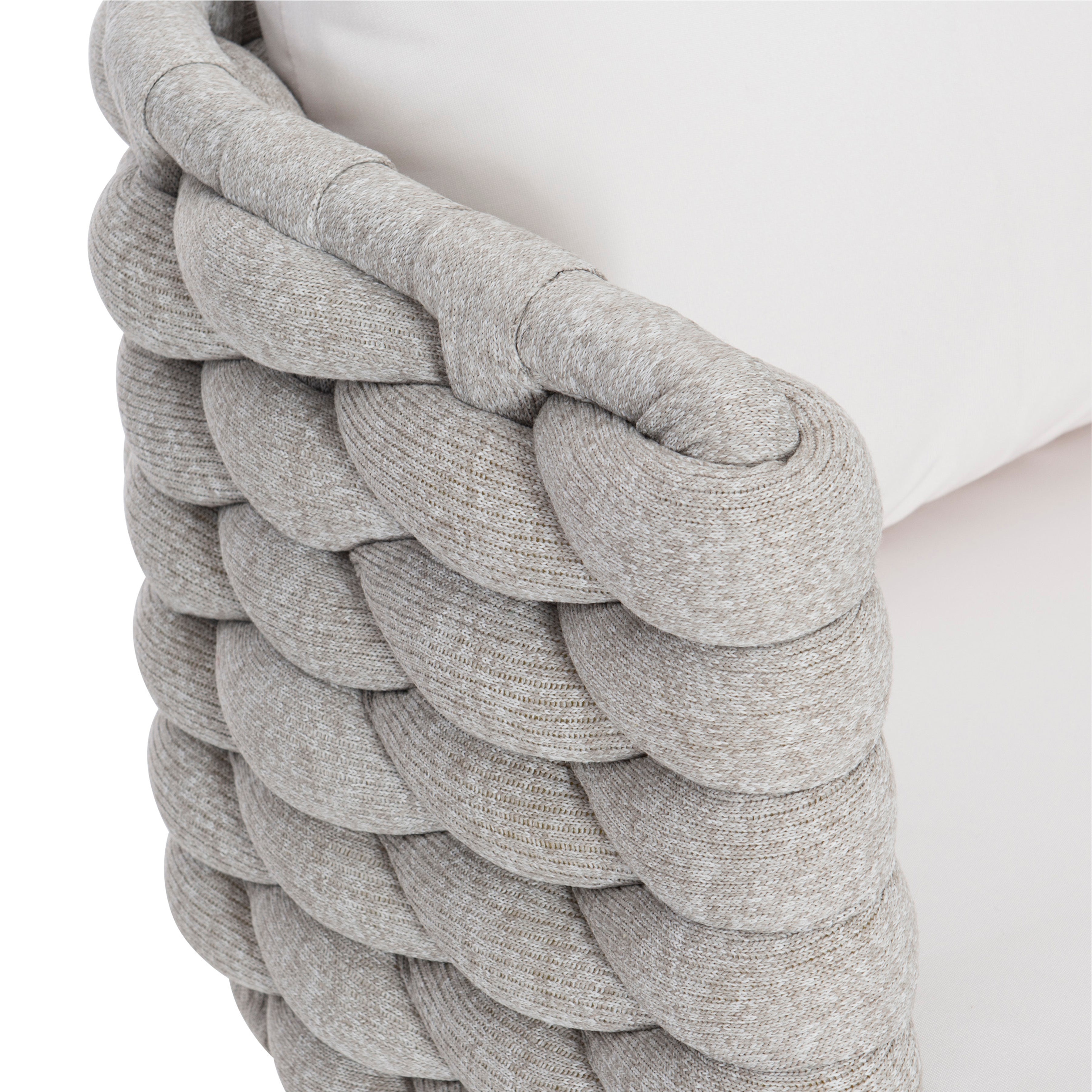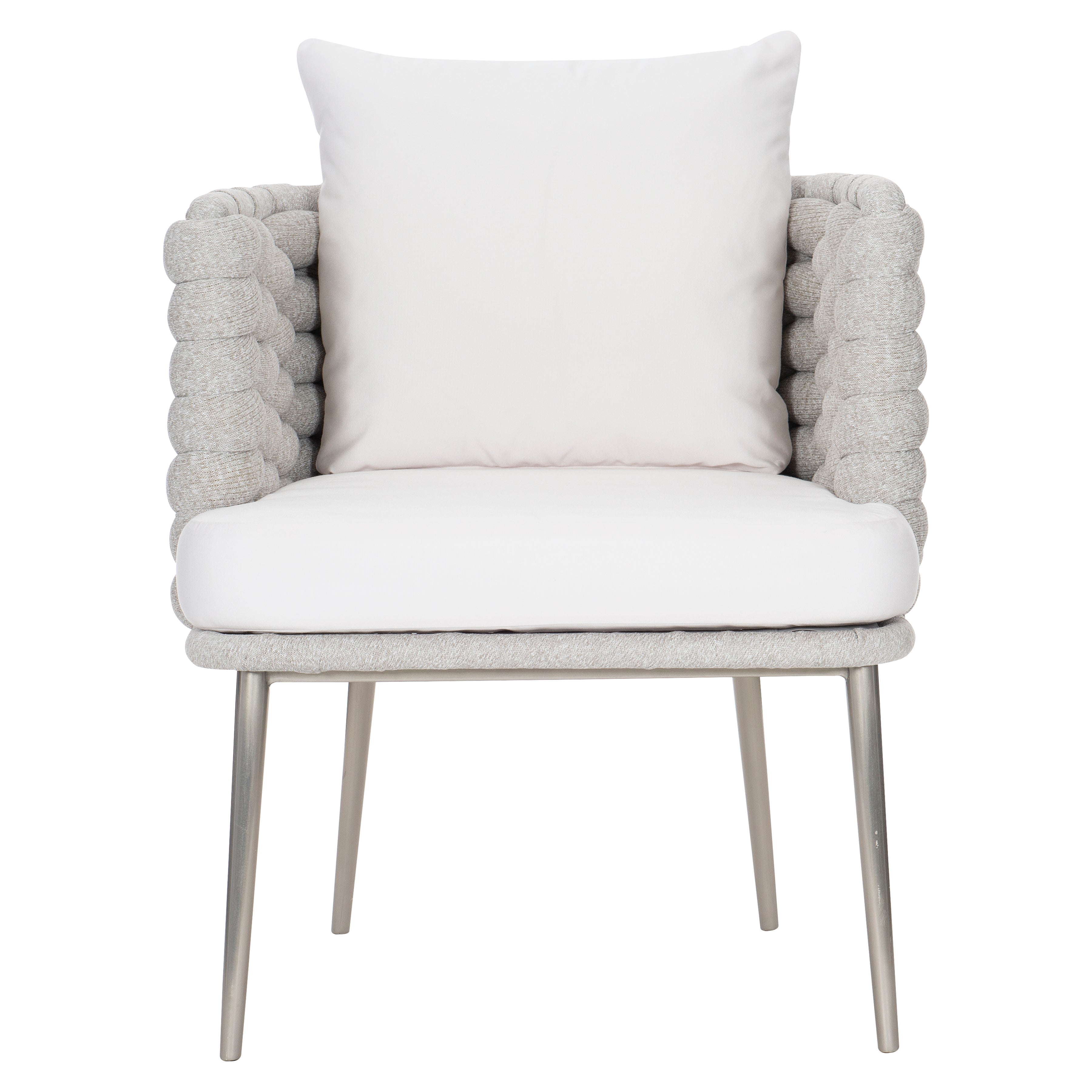 Featuring an all-weather soft-knit sock weave in Nordic Grey wrapped around an aluminum frame, the Santa Cruz arm chair offers luxurious comfort and modern appeal with an organic touch. The barrel-shaped seat rests on delicate but strong Silver Mist powder-coated stainless steel splayed and tapered legs. A comfortable cushion and back pillow are soft and inviting.
