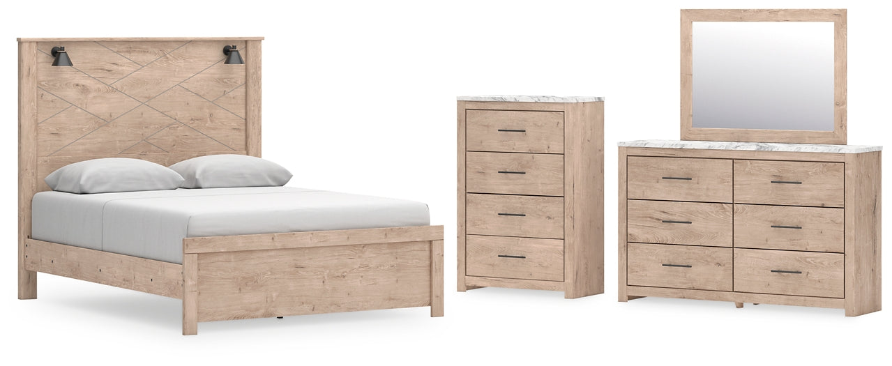Cool, clean and casually modern. This bedroom package’s light natural finish and faux Calcutta marble tops set the tone for your calming sanctuary. Large linear drawer pulls add dimension and authenticity, while the abstract headboard design brings a fresh look to the set.
