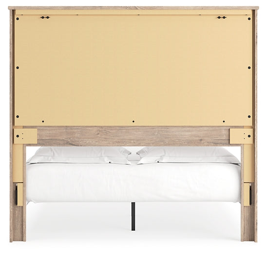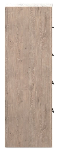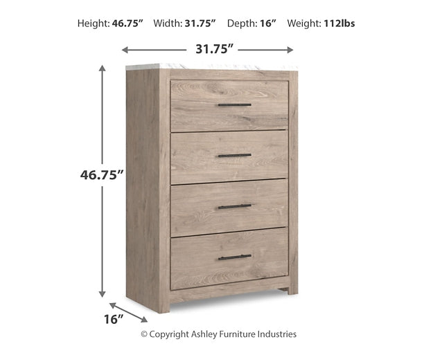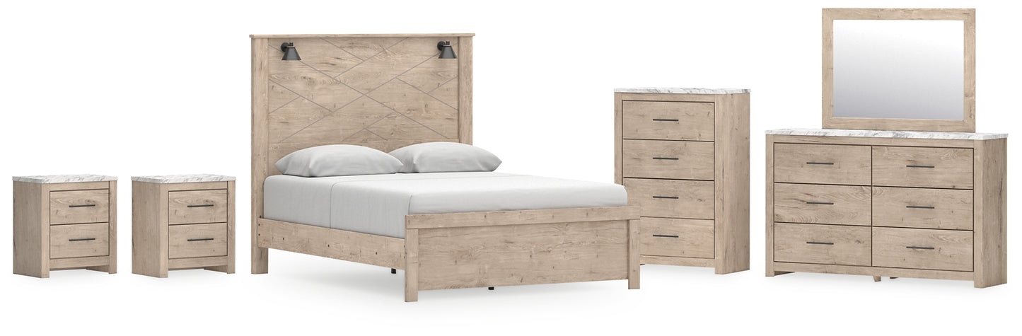 Cool, clean and casually modern. This bedroom package’s light natural finish and faux Calcutta marble tops set the tone for your calming sanctuary. Large linear drawer pulls add dimension and authenticity, while the abstract headboard design brings a fresh look to the set.