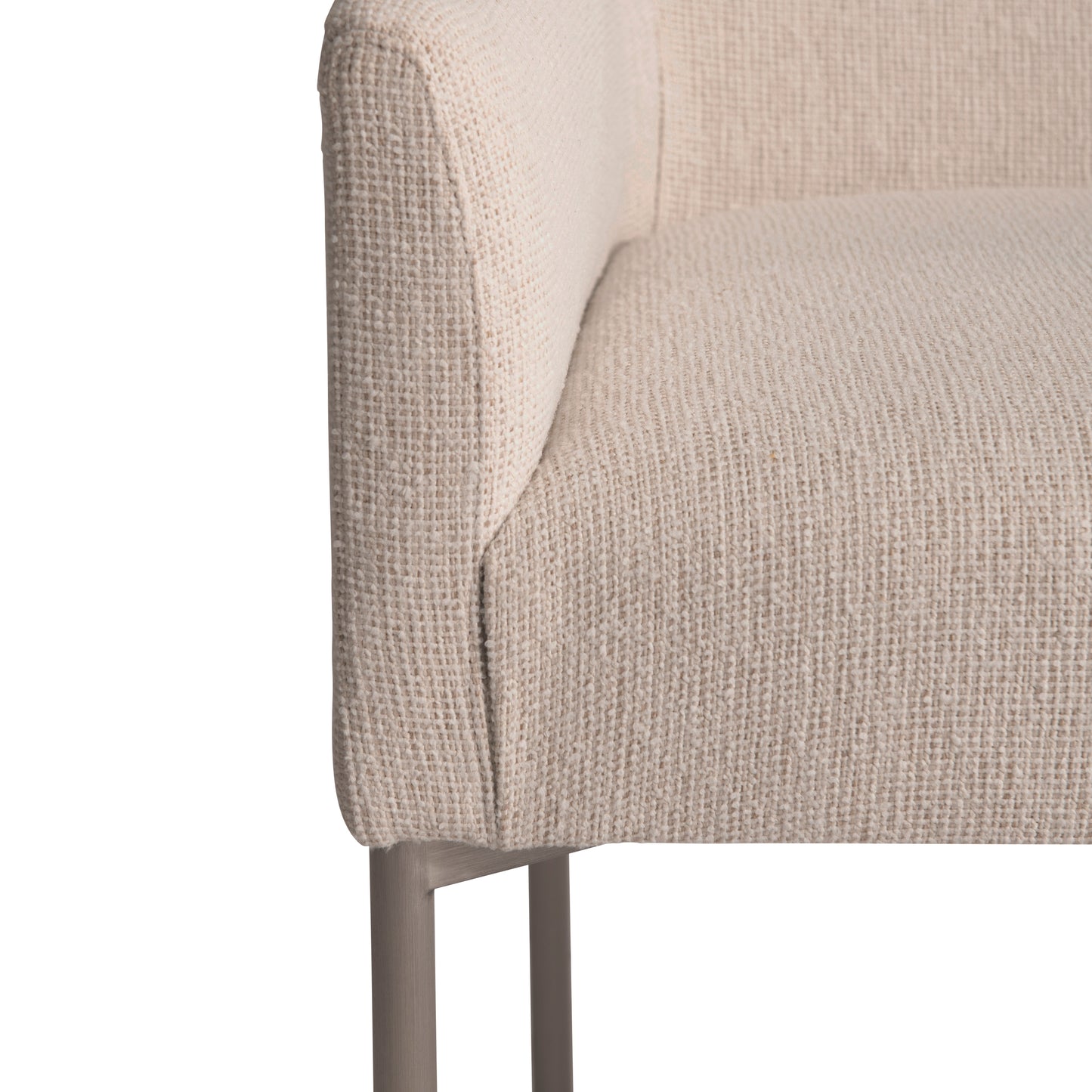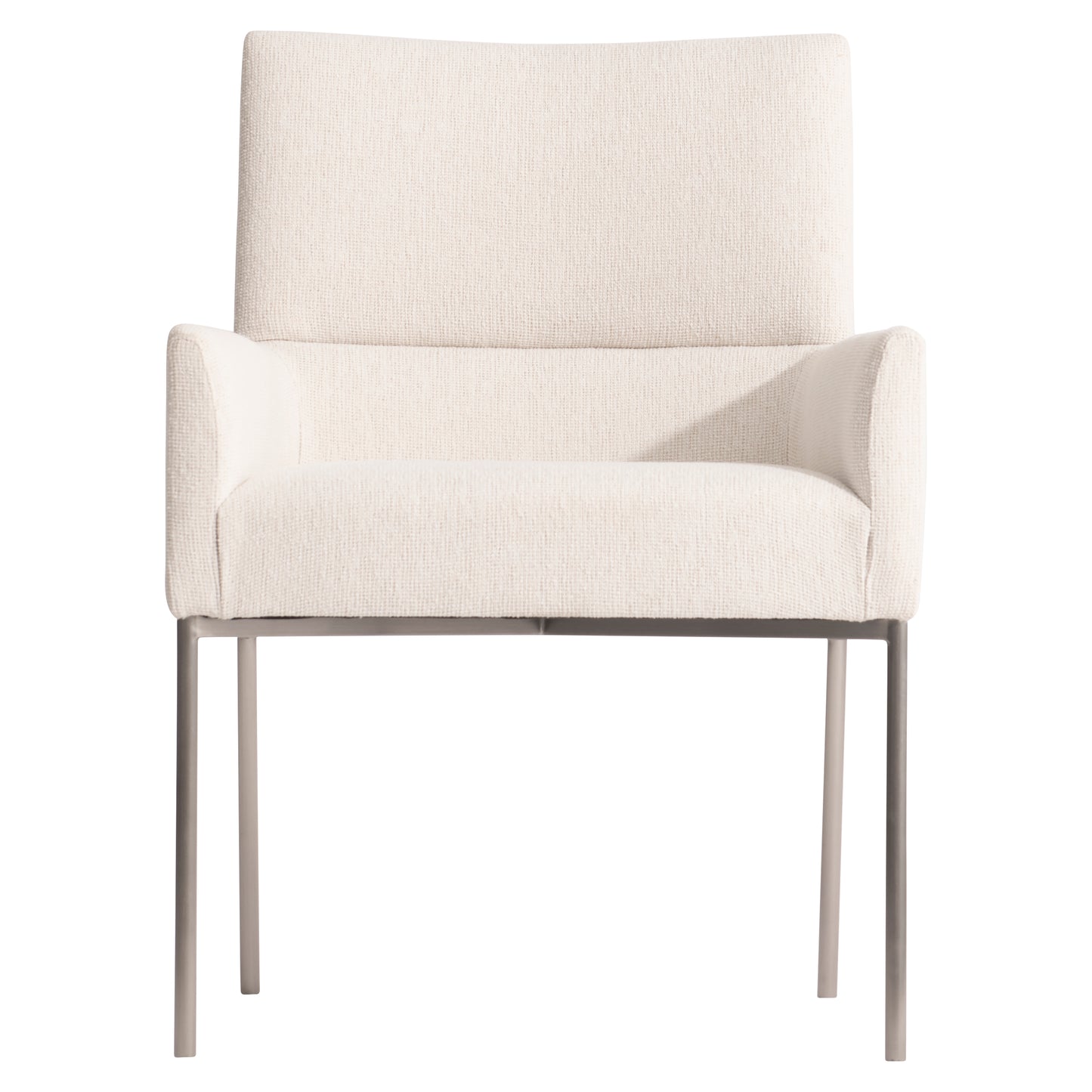 Minimalist design offers an elevated style for the Sereno arm chair. The upholstered seat has softly tapered arms and an elegant seaming across the back. It's supported by a metal base of brushed stainless steel metal in Nickel finish.