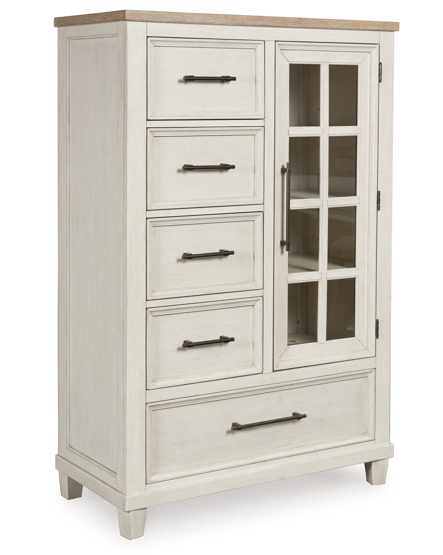 This door chest elevates the art of modern farmhouse design. Its two-tone aesthetic blends antiqued white and light grayish brown for a charming finish. Framed drawer fronts and a windowpane door lend a country feel. Conveying a feeling of relaxed comfort, the chest is sure to carry you away to a dreamy time and place.