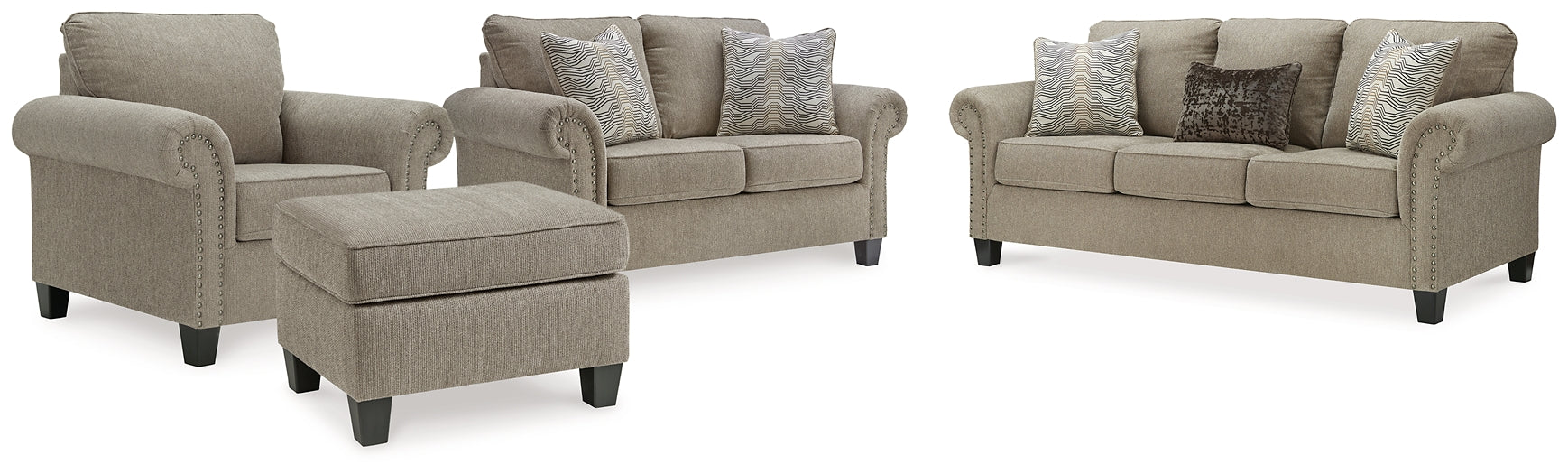 Sporting traditional elements including roll arms with nailhead trim, this upholstery package gives here-and-now relevance to a classic style. The lovely pewter shade of the textured chenille upholstery brings a relaxed sensibility. Mix in contrasting tapered legs for a striking look you're sure to love for years to come.