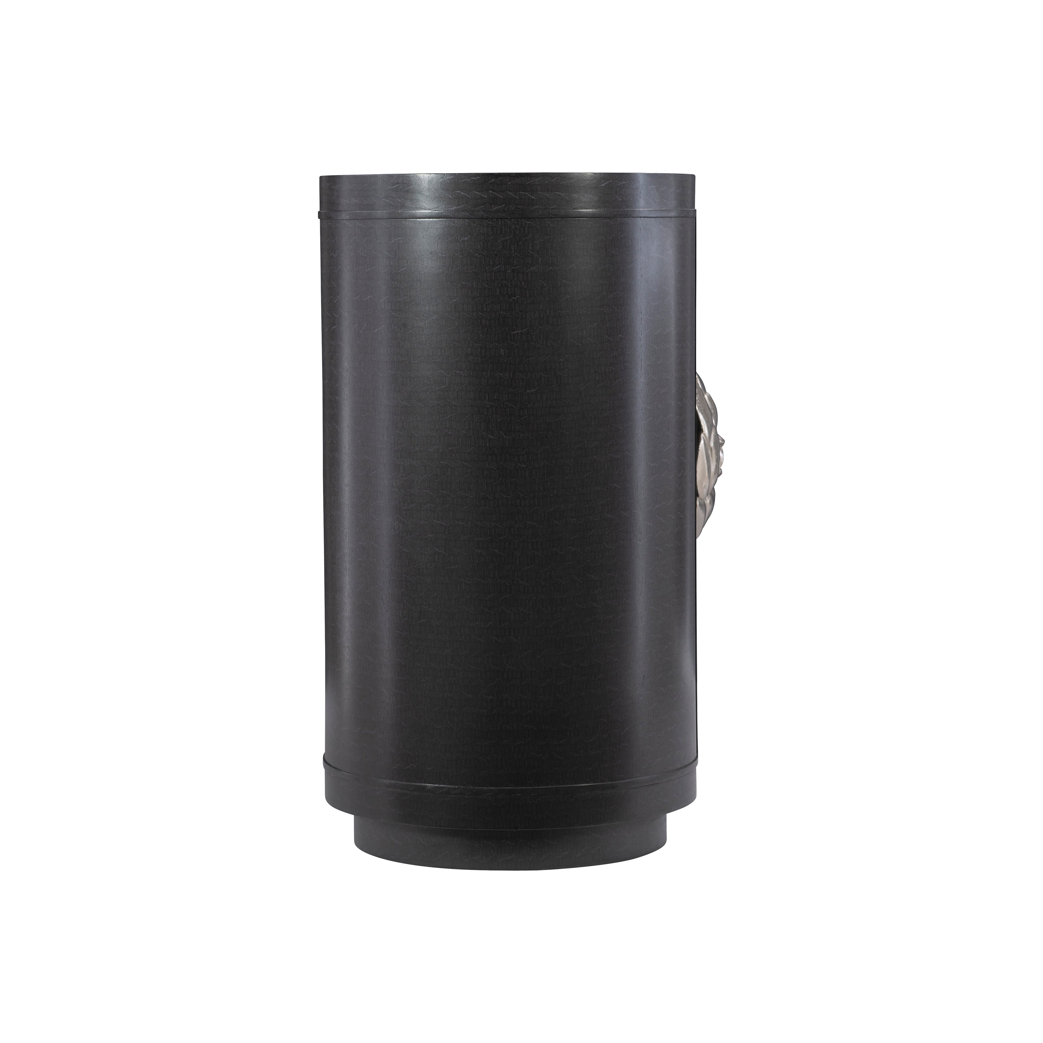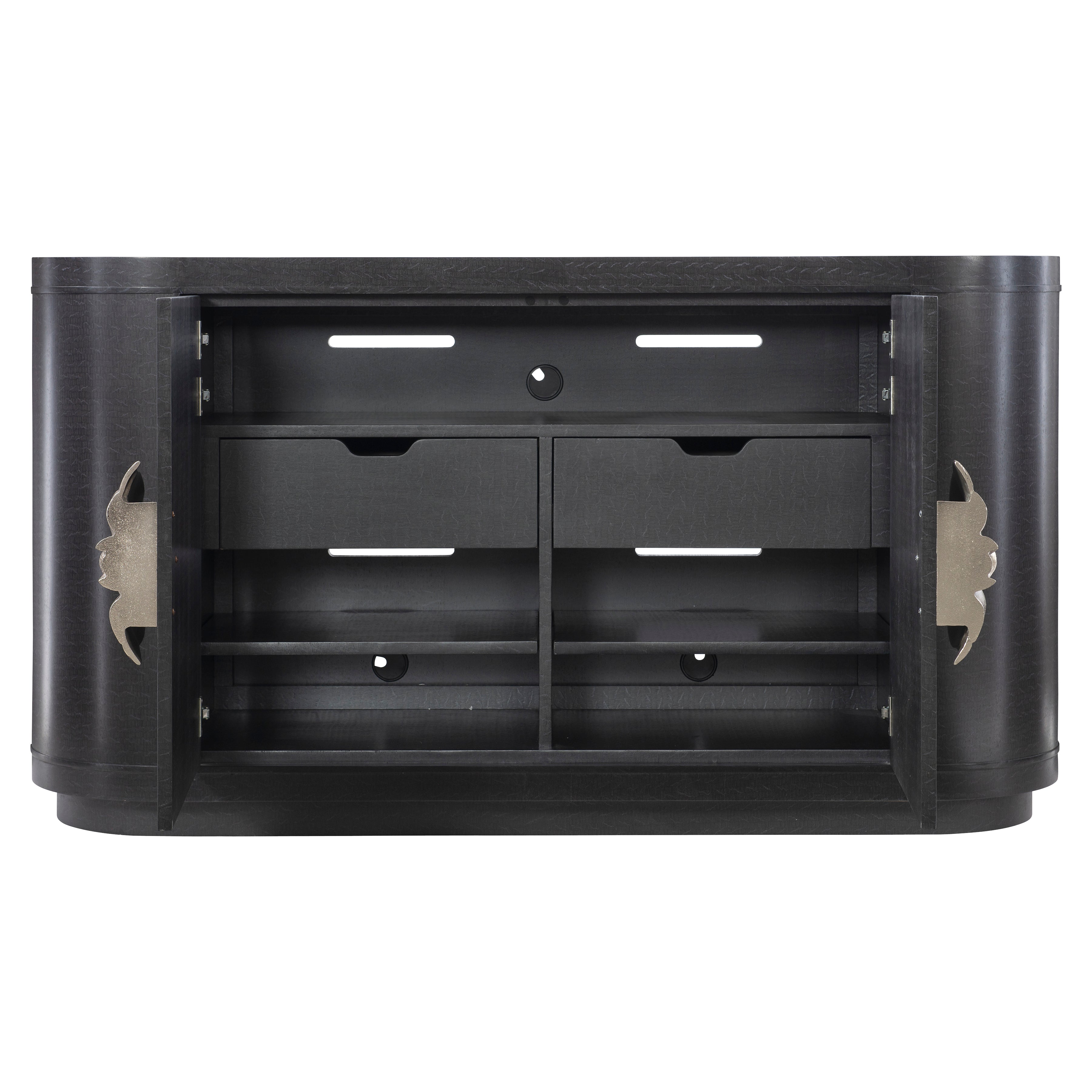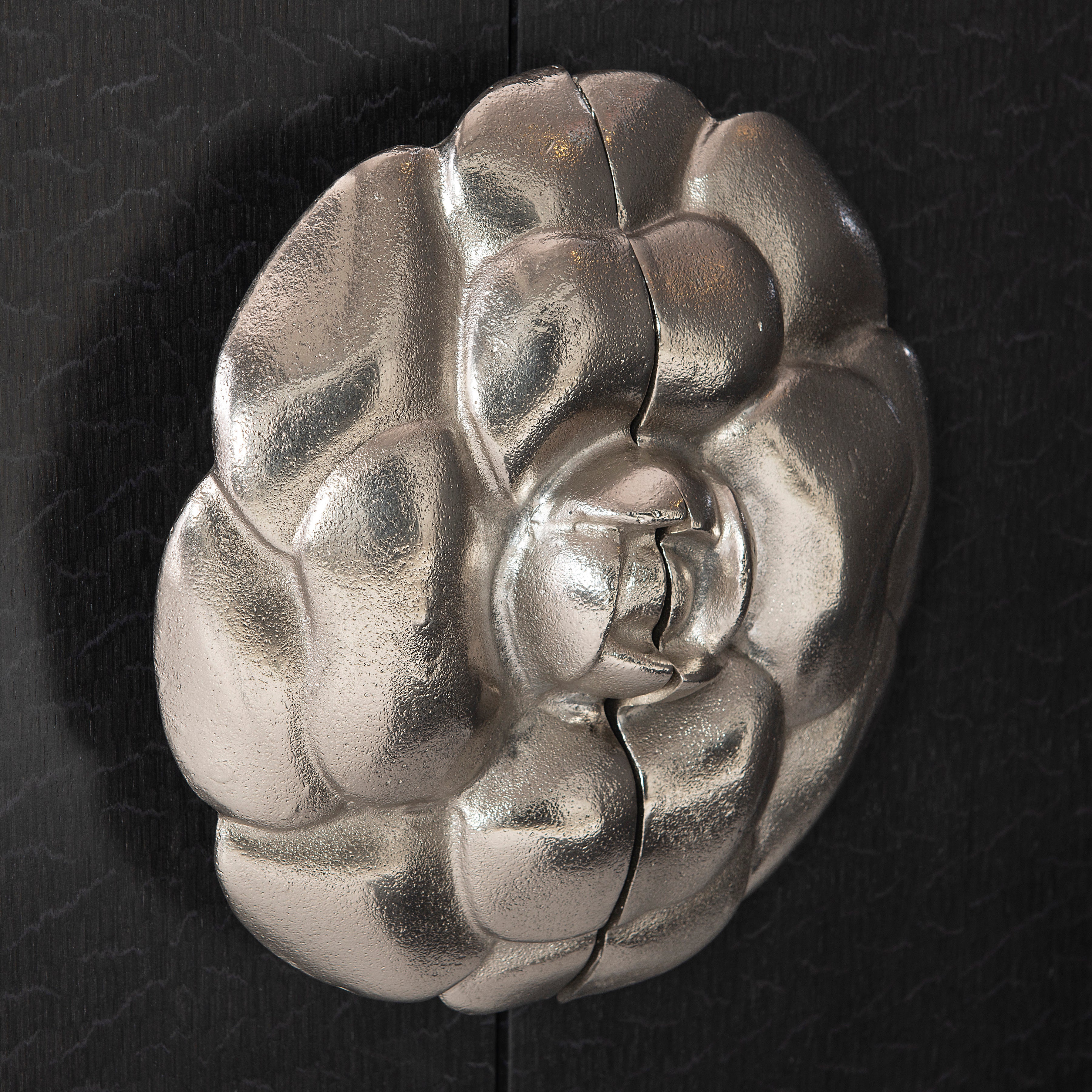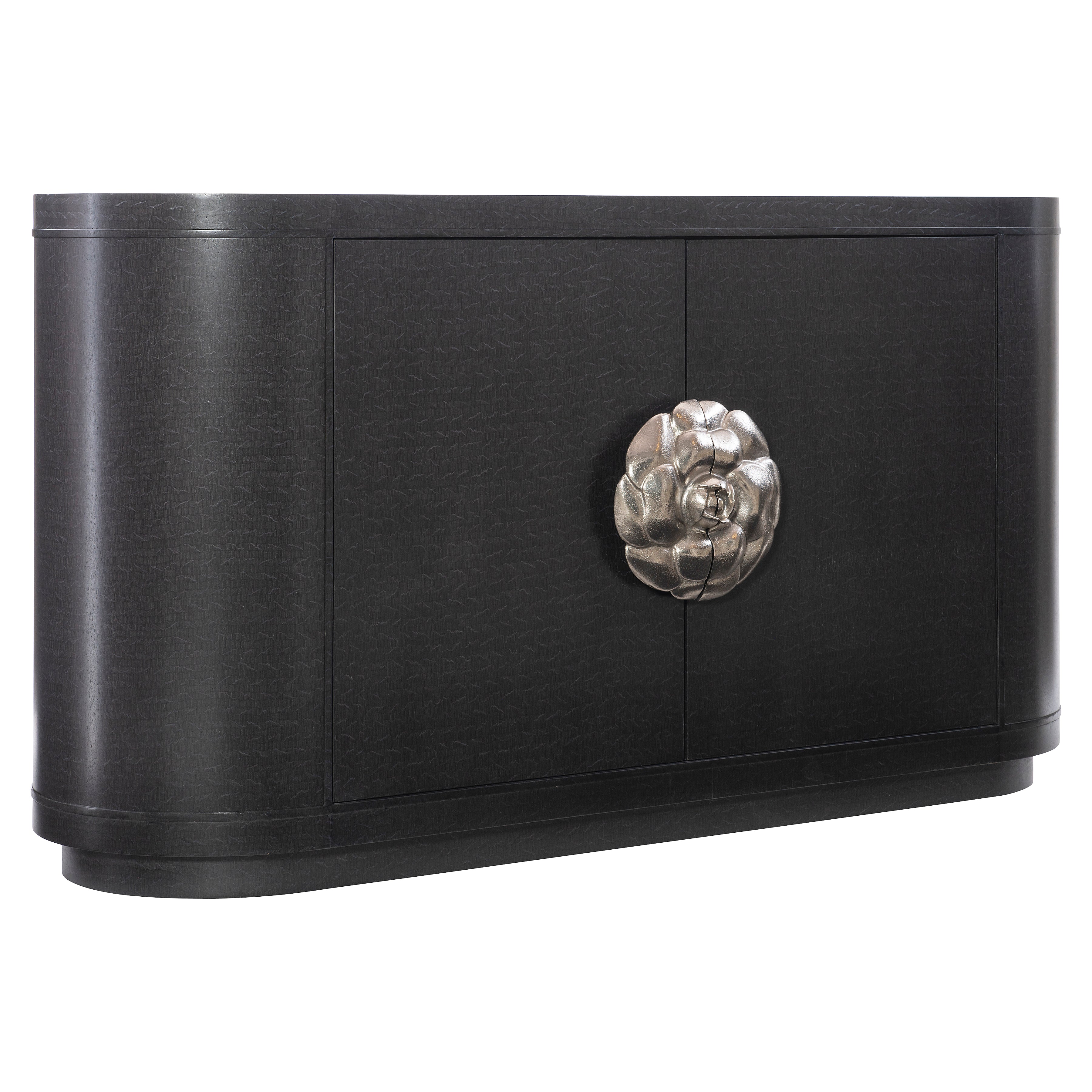 Silhouette is defined by bold contrasts, elegant detailing and a hint of Hollywood Regency glamour. The Silhouette buffet is a study in pattern, texture and subtle curves. Crafted from anigre wood in a dark Onyx finish, its silhouette artfully combines classic style with effortless sophistication. Singular in its design, an oversized camellia-shaped pull in brushed stainless steel makes this piece a standout.