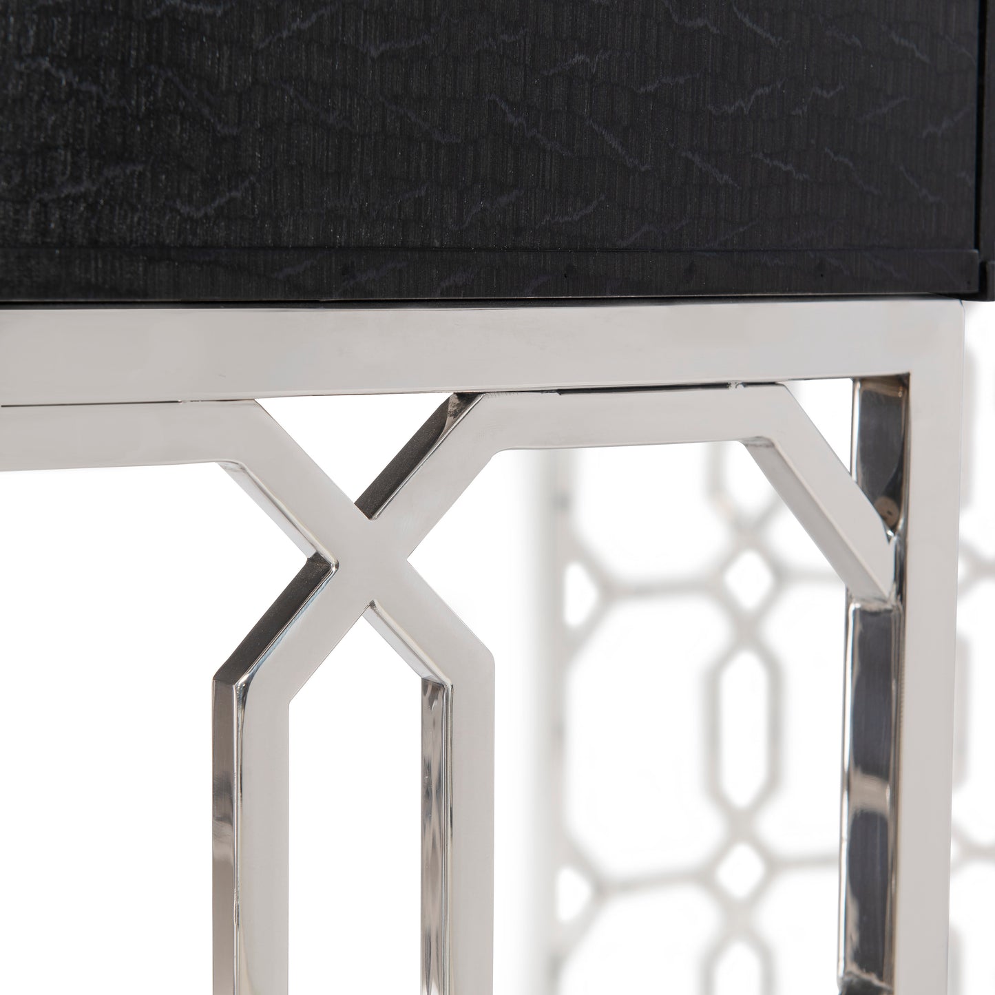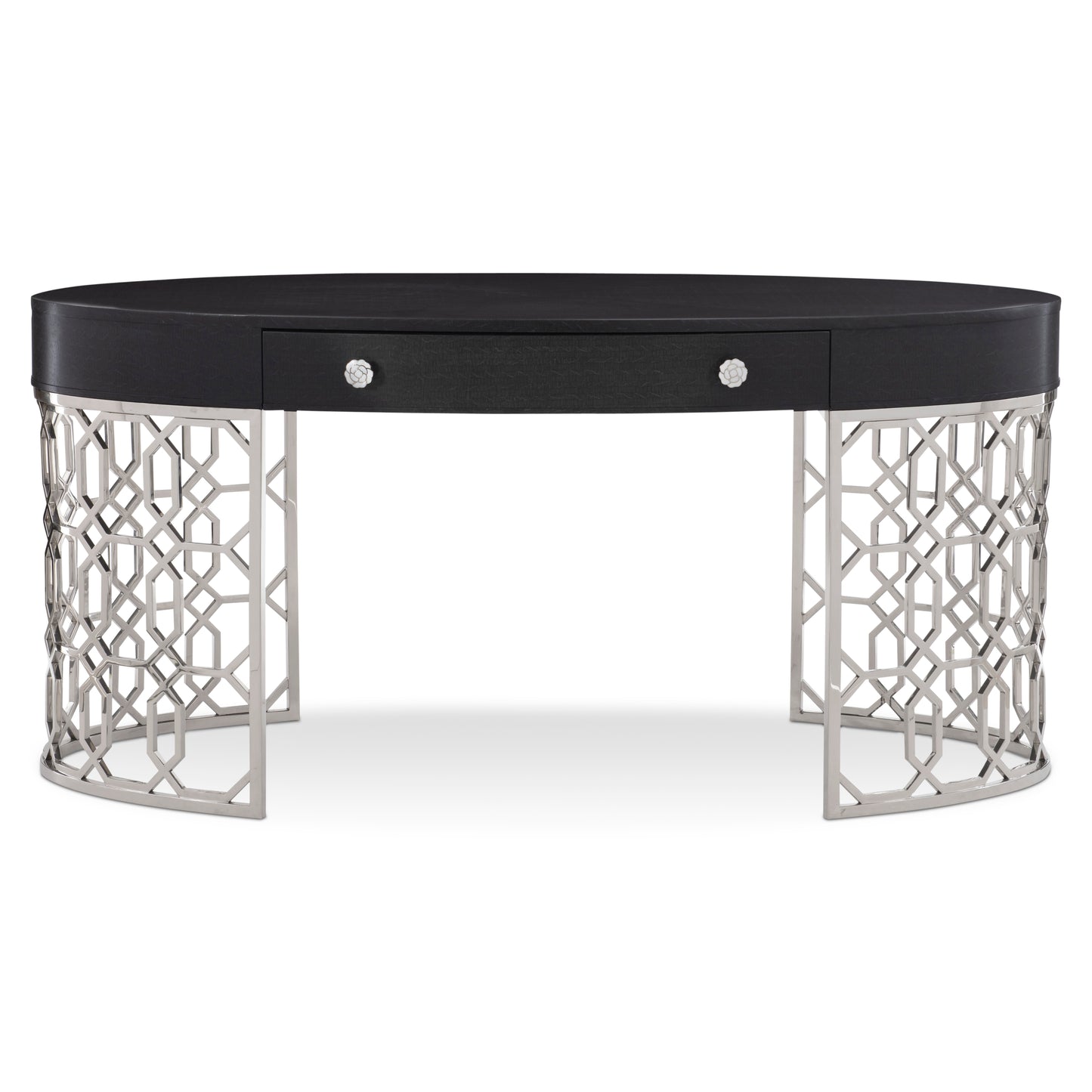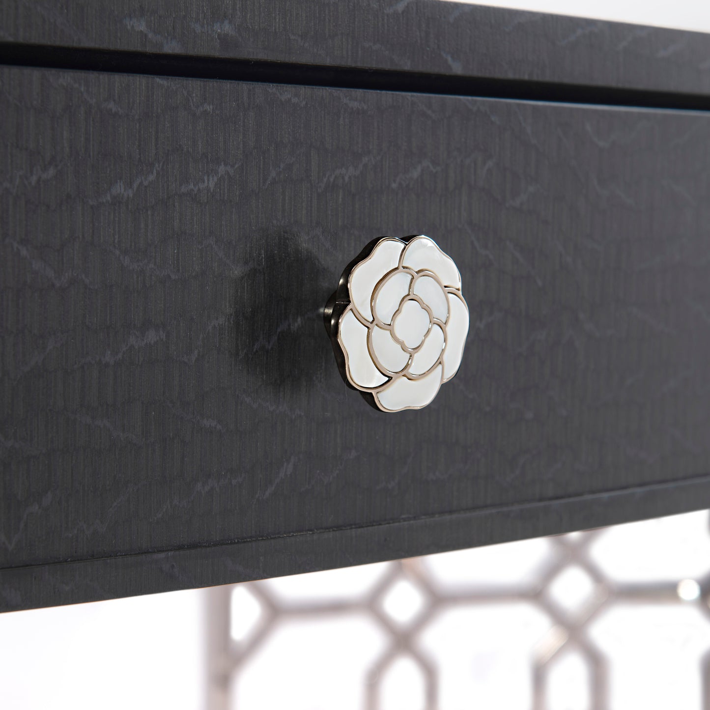 Silhouette is defined by bold contrasts, subtle curves and a hint of Hollywood Regency allure. The glamorous Silhouette desk exudes opulence with dazzling materials and feminine accents. A Figured Onyx finish on the fancy face oval top offers an intriguing texture. The single drawer features elegant floral pulls with inlaid kabebe shells. Crafted from polished stainless steel, two semi-circular columns feature a striking geometric pattern.