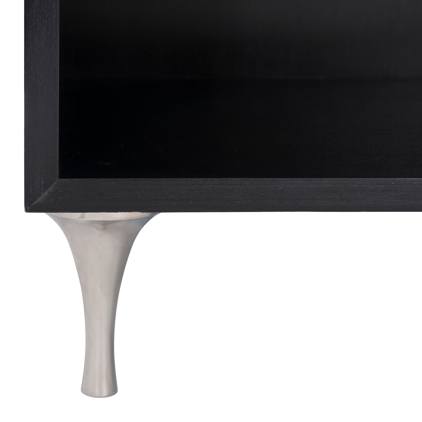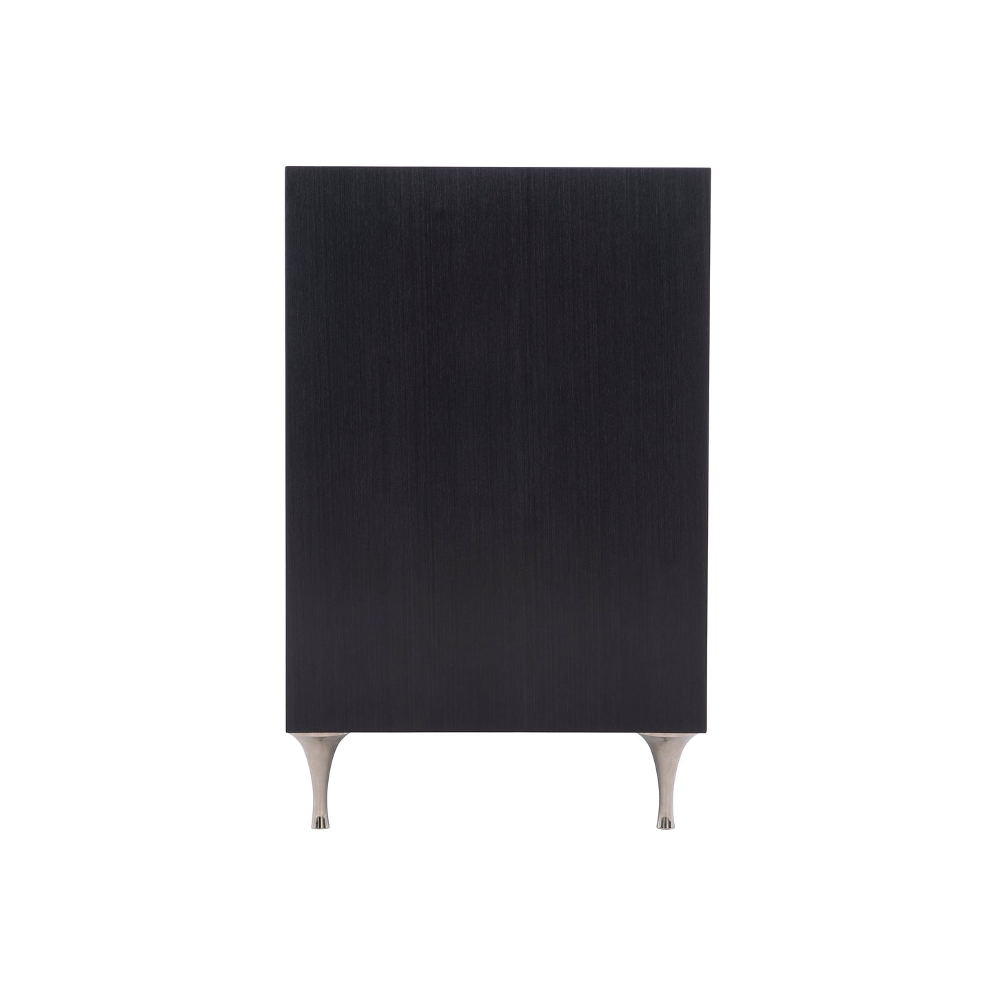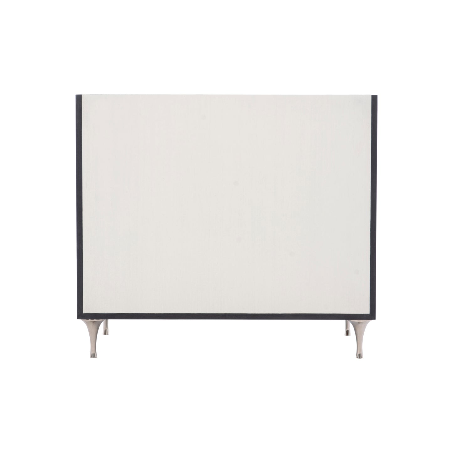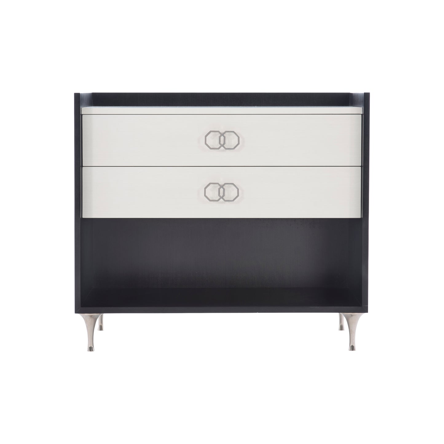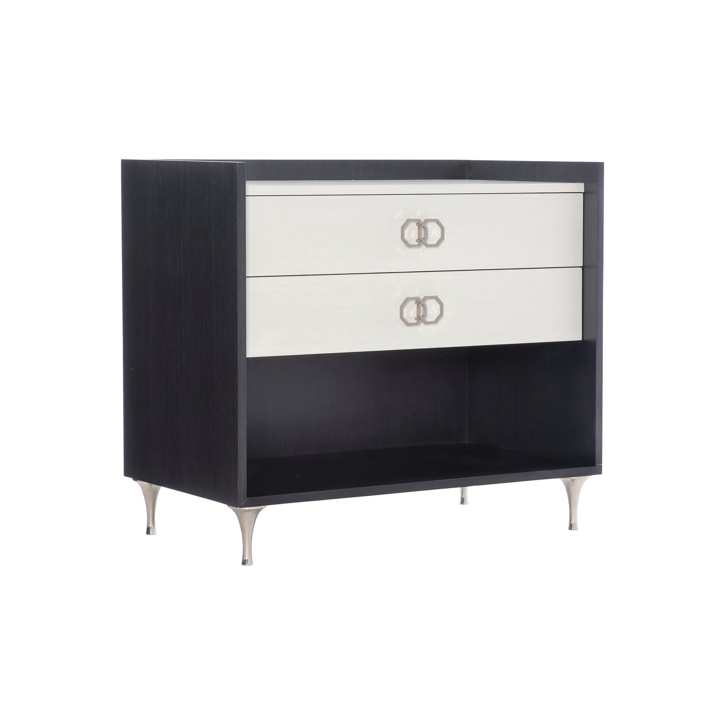 Silhouette is defined by bold contrasts and a hint of Hollywood Regency glamour. The Silhouette nightstand is a modern classic. A chic palette of black and white accentuates the unique design, which features two drawers in Eggshell finish that appear to float within a frame finished in Onyx. Delicate round tapered legs in polished stainless steel match the interlocking octagonal pulls.