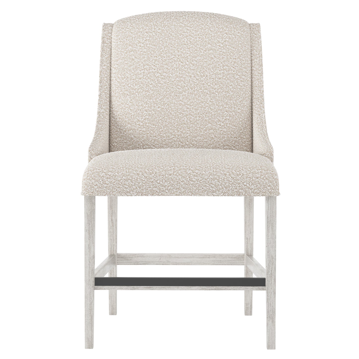 Upholstered inside and outside back. Upholstered seat with single welt. Wire-brushed finish on exposed wood legs and stretchers. Powder-coated Black finish on Steel kick plate on front stretcher. Optional nailhead trim available.