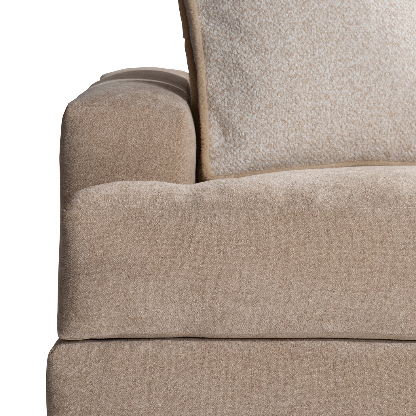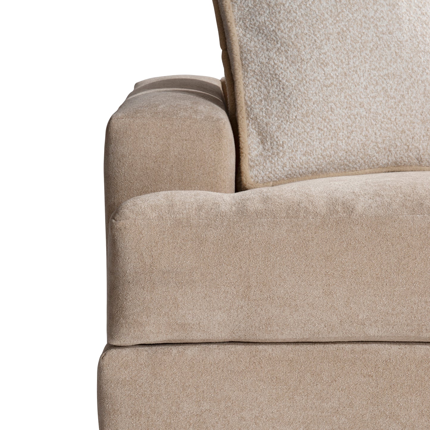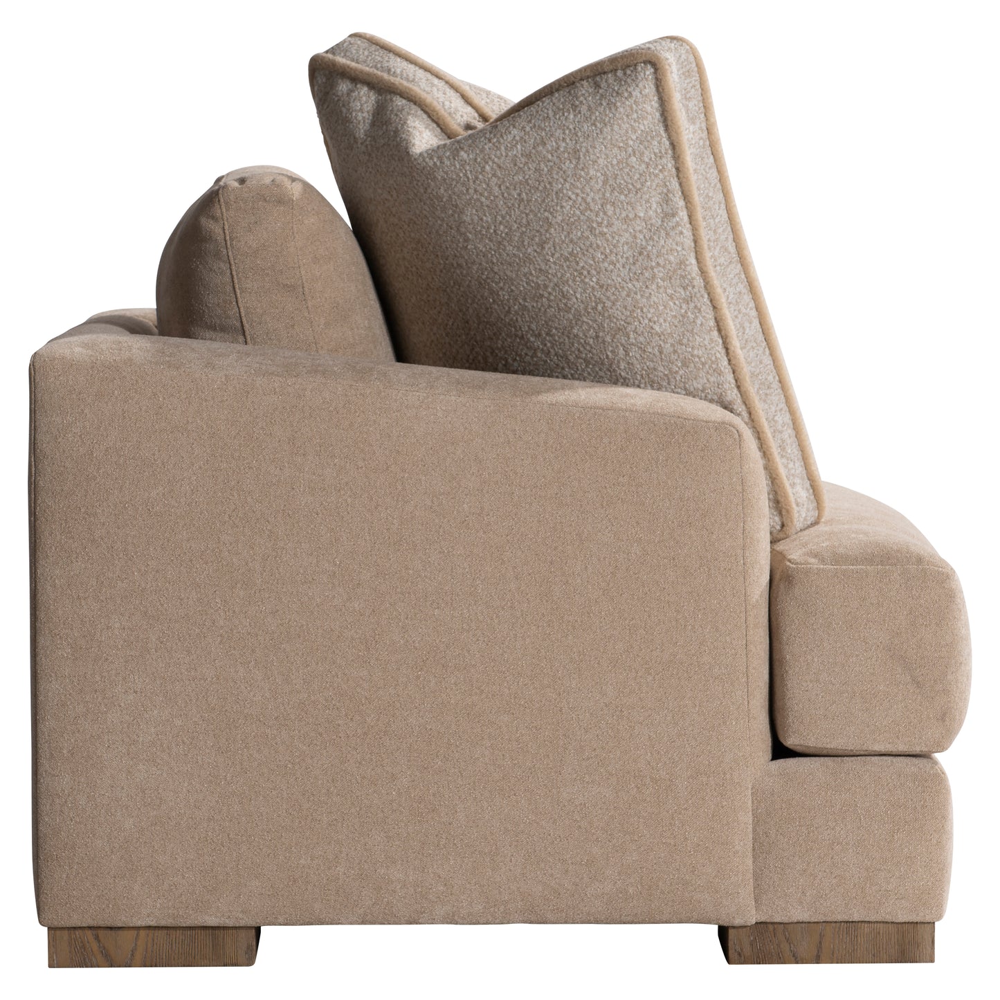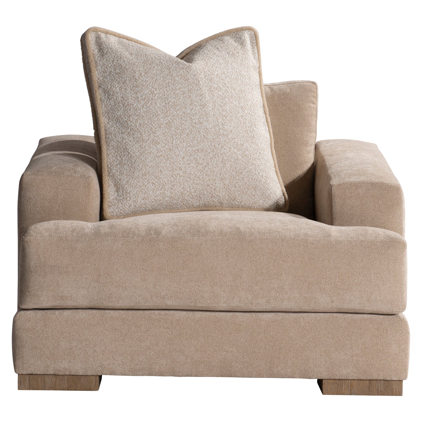 The Solace chair is aptly named, crafting generous comfort from a traditional square club chair design. The deep seat has a T-shaped, Plush feather down cushion and the back pillow has a box-edge border. A curated throw pillow adds style. The frame is set over large, square wooden feet in Playa finish.