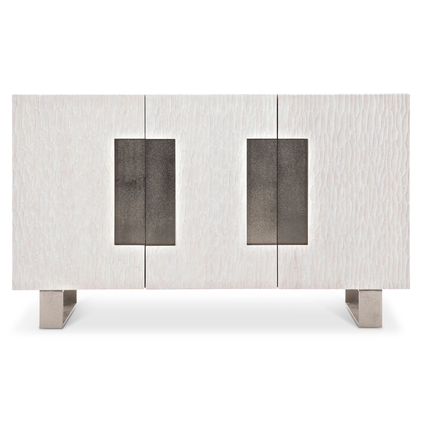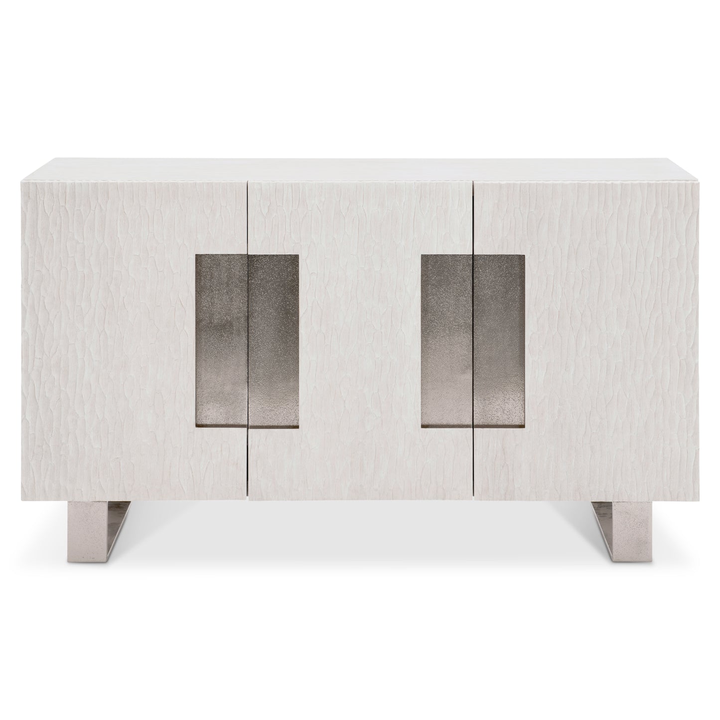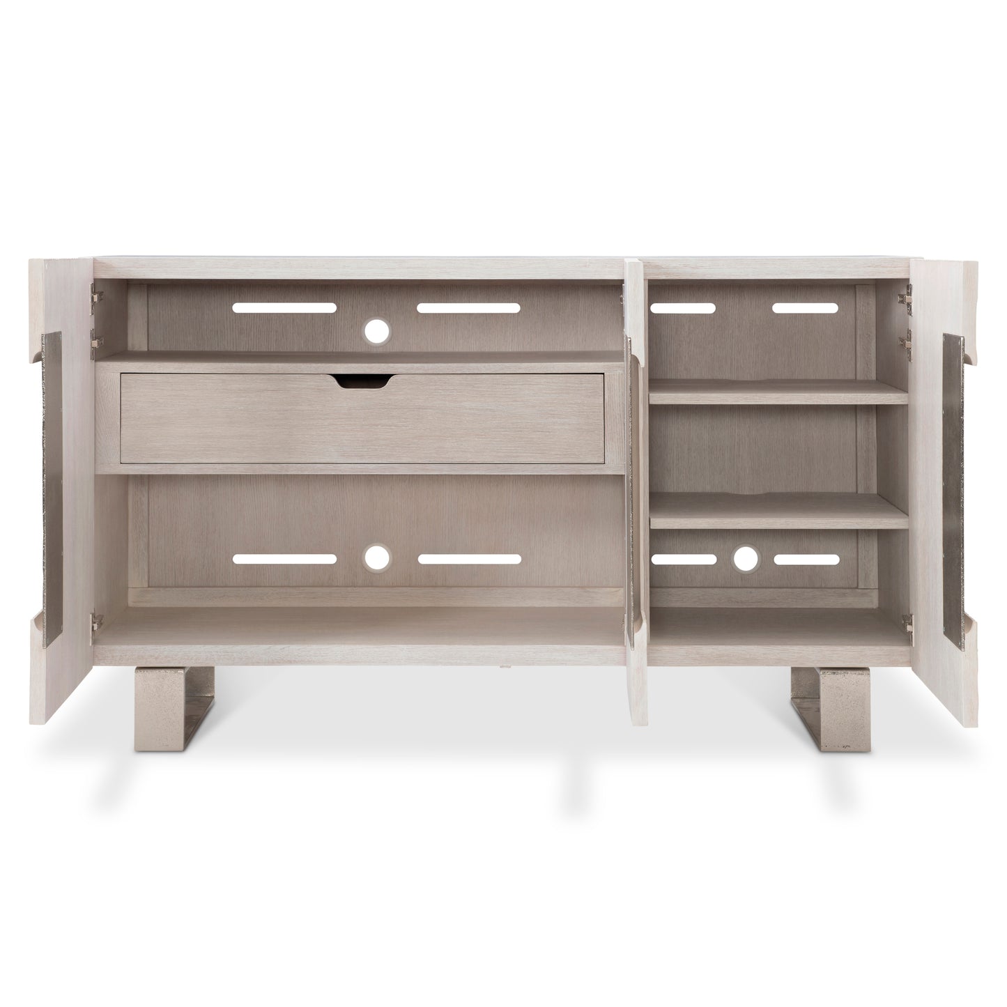 A harmony of simplicity and modernity, texture and neutrals, the Solaria buffet makes the most of form and function. Chiseled resin door fronts in a Weathered Bone finish are the perfect contrast to cast aluminum door panels and legs. The doors open to reveal impeccable storage with shelves and a drawer. The buffet can be used for china and tableware storage or as a media unit.