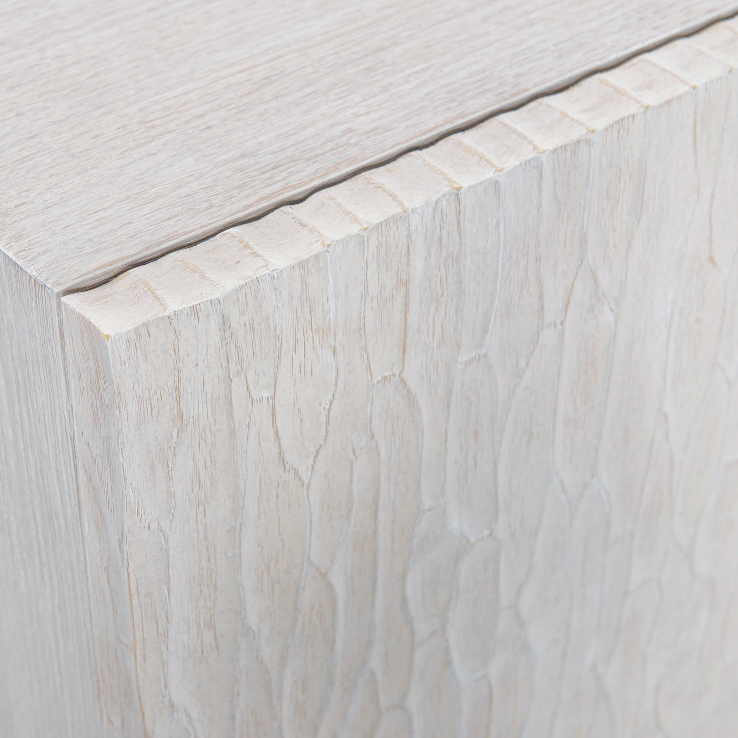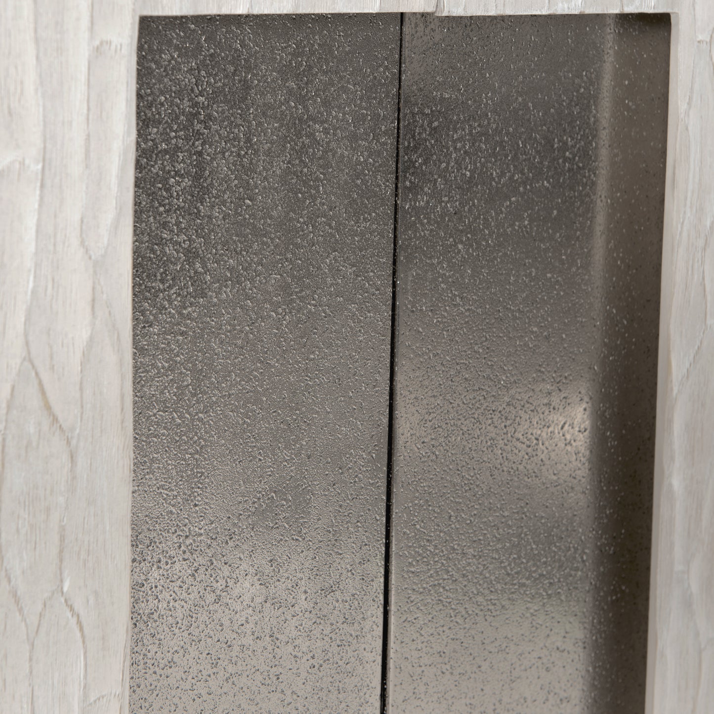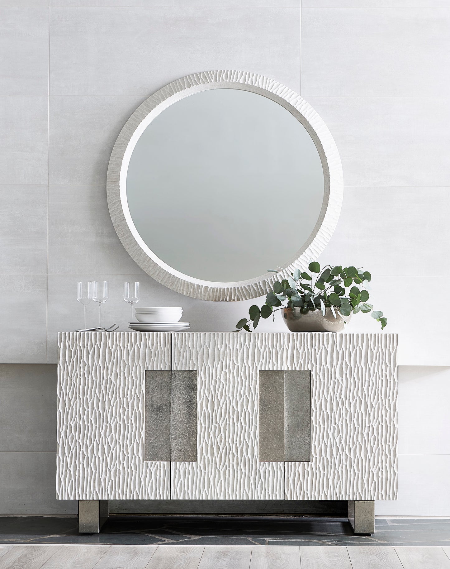 A harmony of simplicity and modernity, texture and neutrals, the Solaria buffet makes the most of form and function. Chiseled resin door fronts in a Weathered Bone finish are the perfect contrast to cast aluminum door panels and legs. The doors open to reveal impeccable storage with shelves and a drawer. The buffet can be used for china and tableware storage or as a media unit.