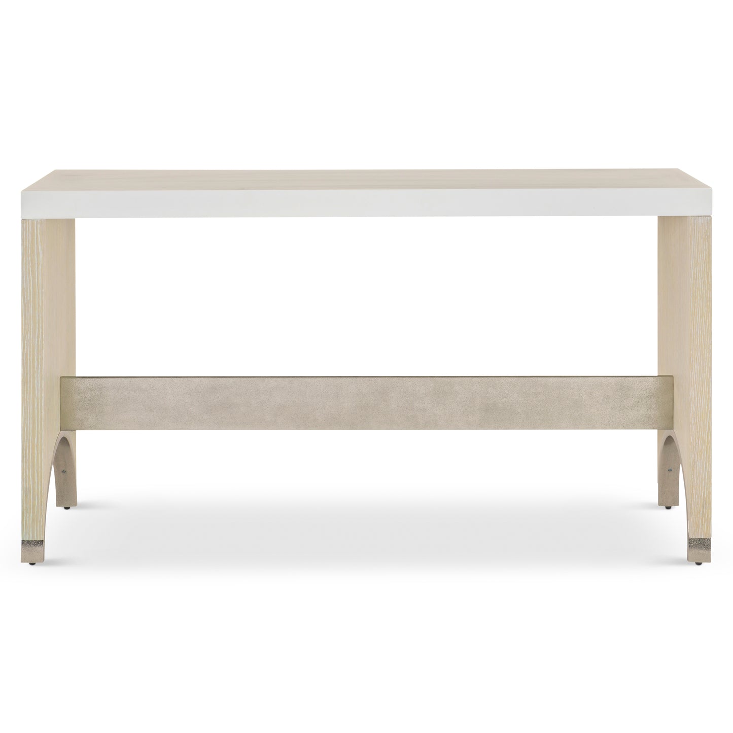 At first glance, the Solaria console table is a tale of simple shaping, but the details offer a more in-depth story. Soft arches are outlined in cast aluminum, with the metal also forming a stretcher from side to side. A wood frame is reminiscent of sand and sea in its Dune finish. A faux stone top in a Fossil finish completes the compelling design.