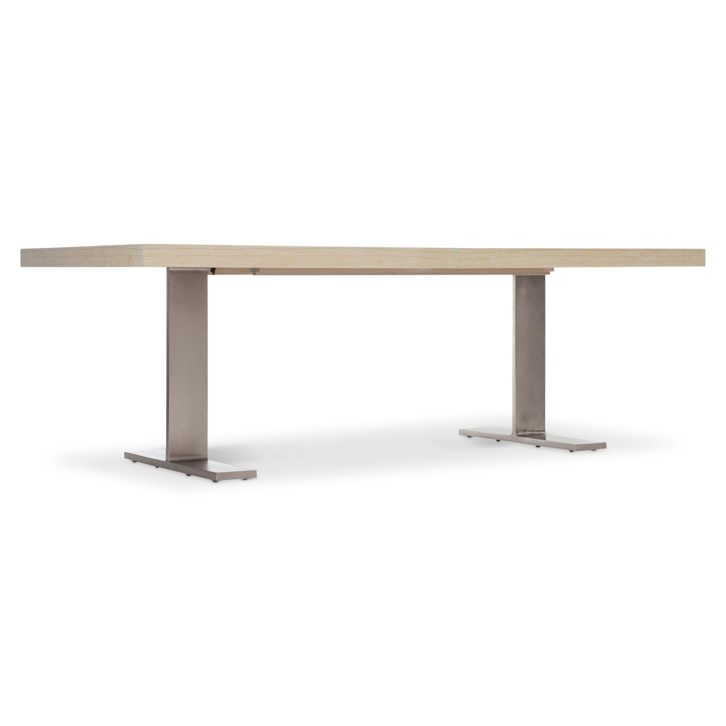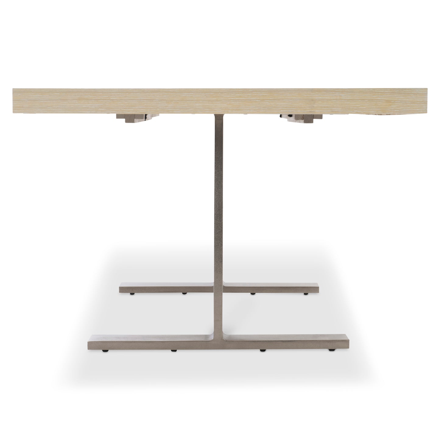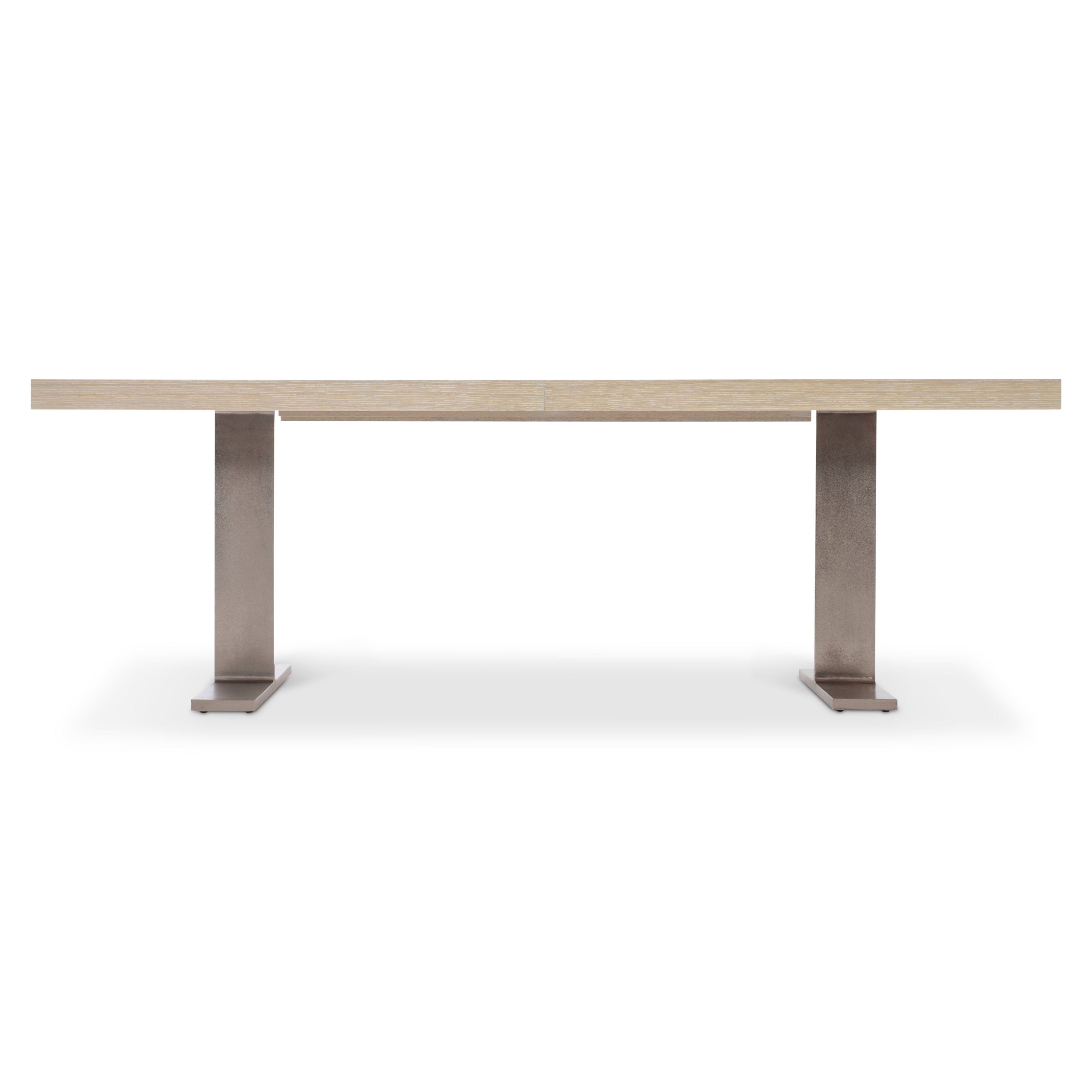 In the Solaria dining table, cast steel legs in a simple T-shape support a clean-lined fancy face top featuring quartered white oak veneers in a Dune finish. The sleek form and elemental materials craft a modern industrial look with roots in Bauhaus forms. The rectangular table extends from 88 inches to 110 inches with the addition of a single leaf.