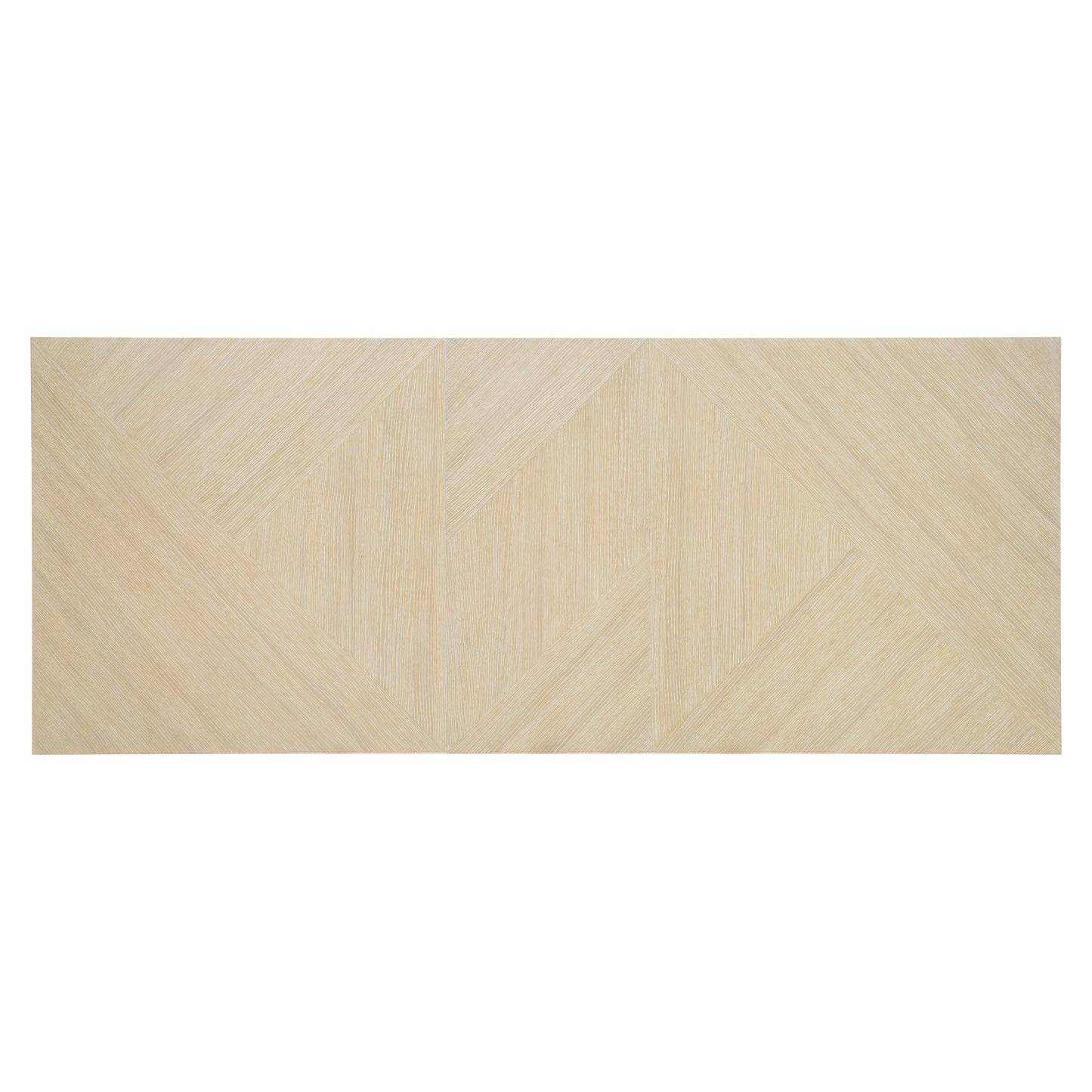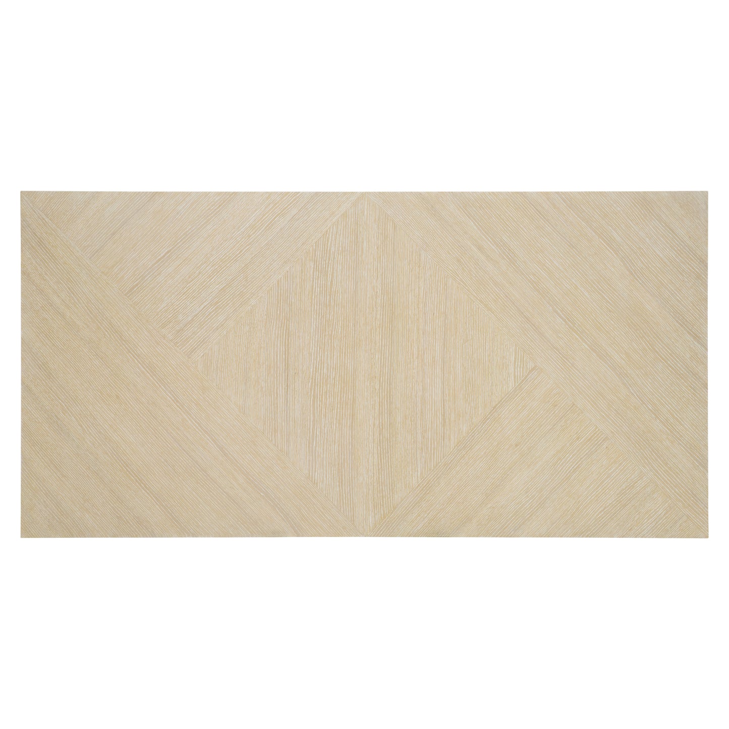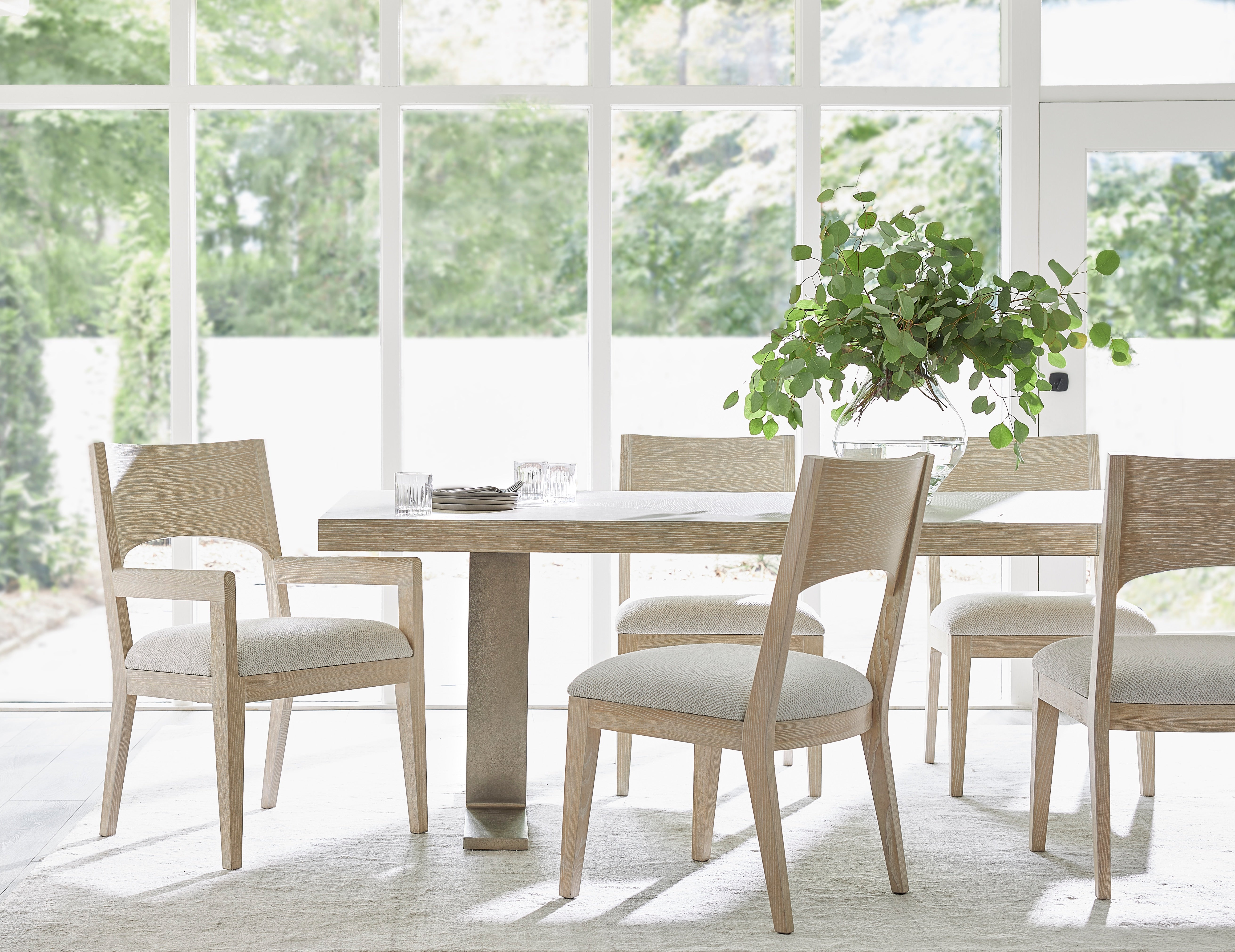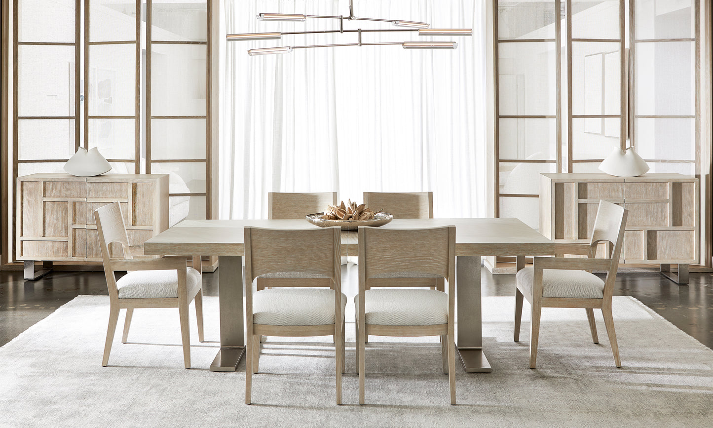 In the Solaria dining table, cast steel legs in a simple T-shape support a clean-lined fancy face top featuring quartered white oak veneers in a Dune finish. The sleek form and elemental materials craft a modern industrial look with roots in Bauhaus forms. The rectangular table extends from 88 inches to 110 inches with the addition of a single leaf.