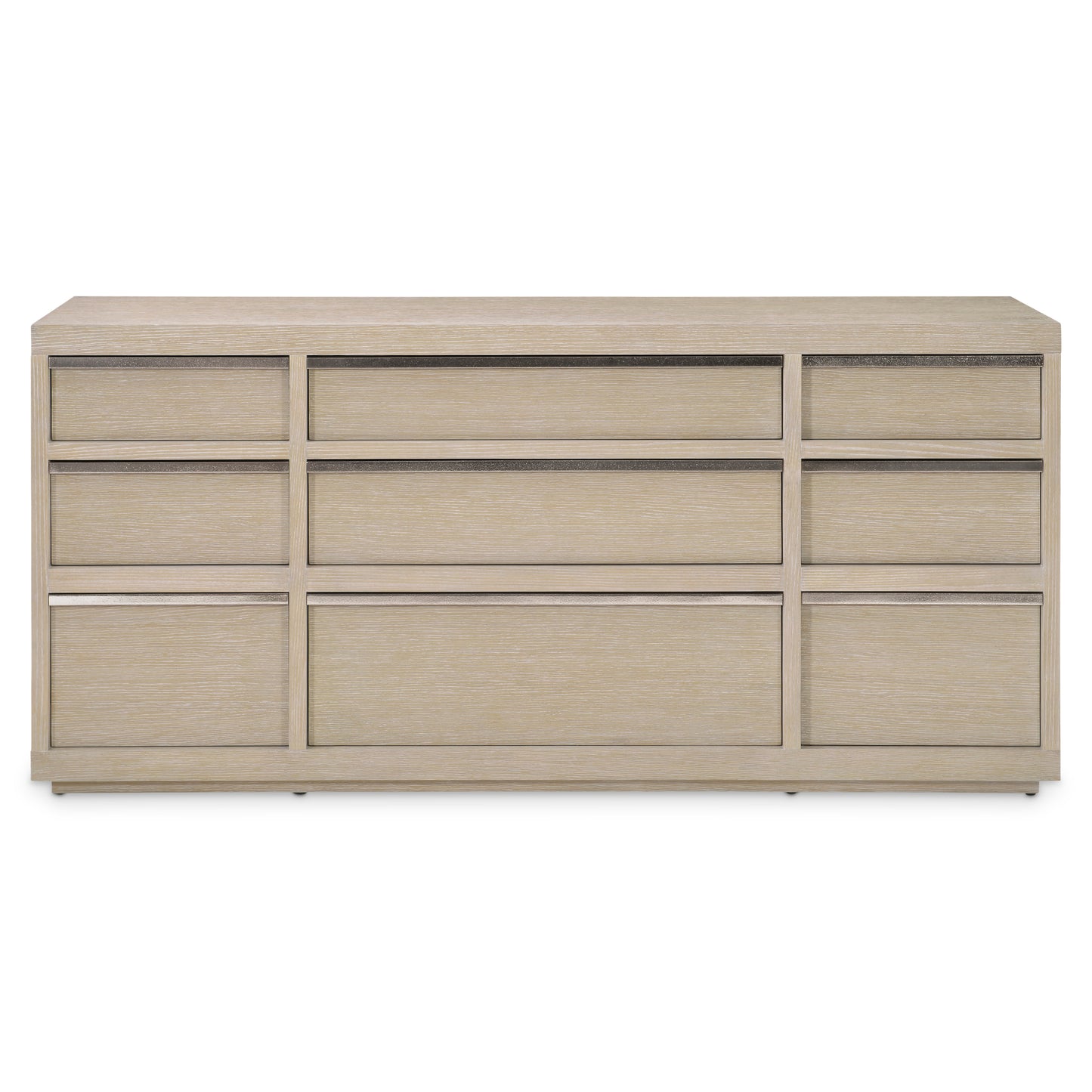 Subtlety defines the Solaria dresser, crafted from ash solids and quartered white oak veneers in a Dune finish. At first glance, it appears to be an all-wood design, but the quiet sheen of the metal finger pulls draws the eye and defines the form. Nine drawers in varying sizes create essential bedroom storage.