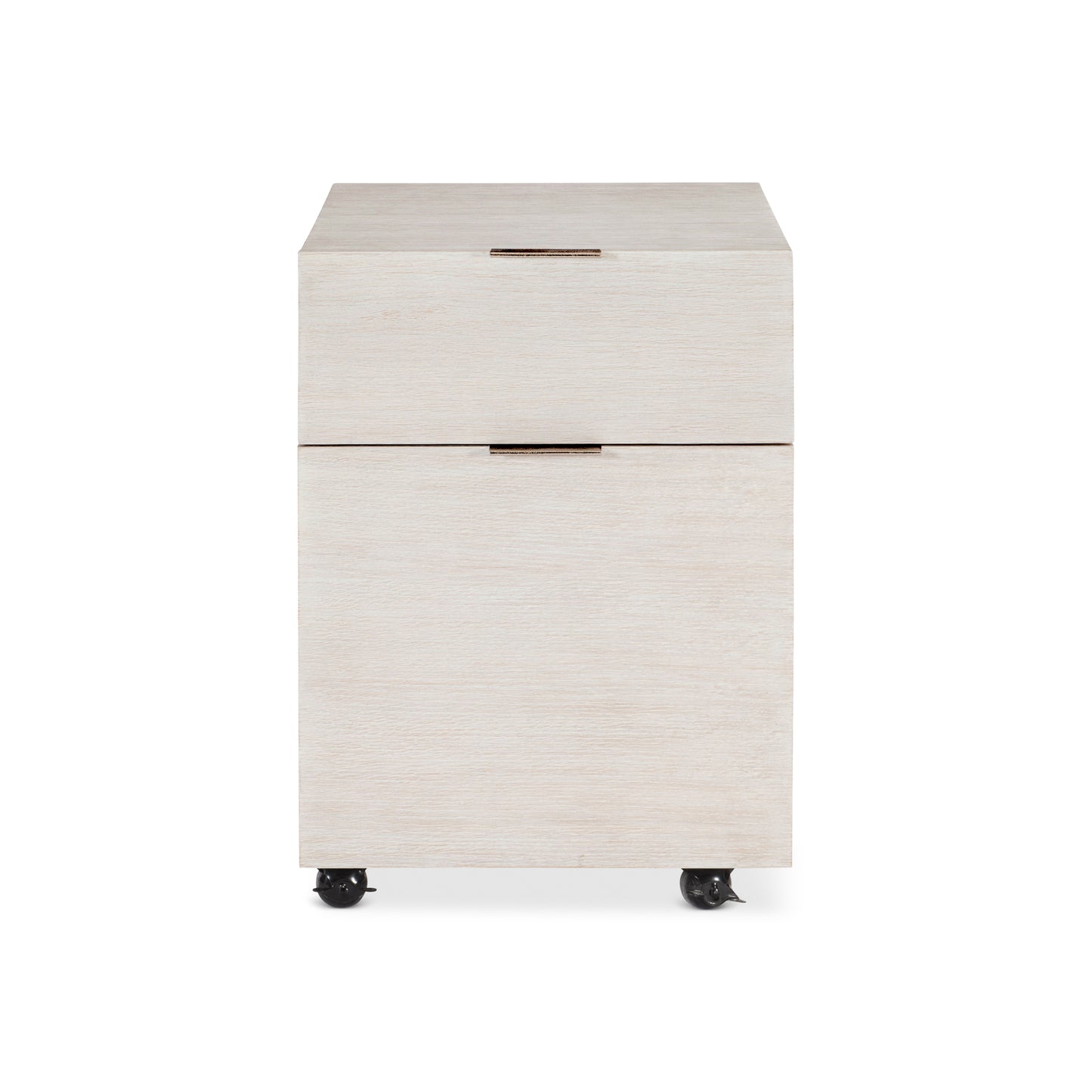 The Solaria file cabinet is clean, simple and essential. Featuring quartered white oak veneers in a Weathered Bone finish, the cabinet houses two office drawers with sleek metal hardware in a shiny nickel finish. The bottom drawer includes removable hanging rods for letter or legal files. Rolling casters create mobility.
