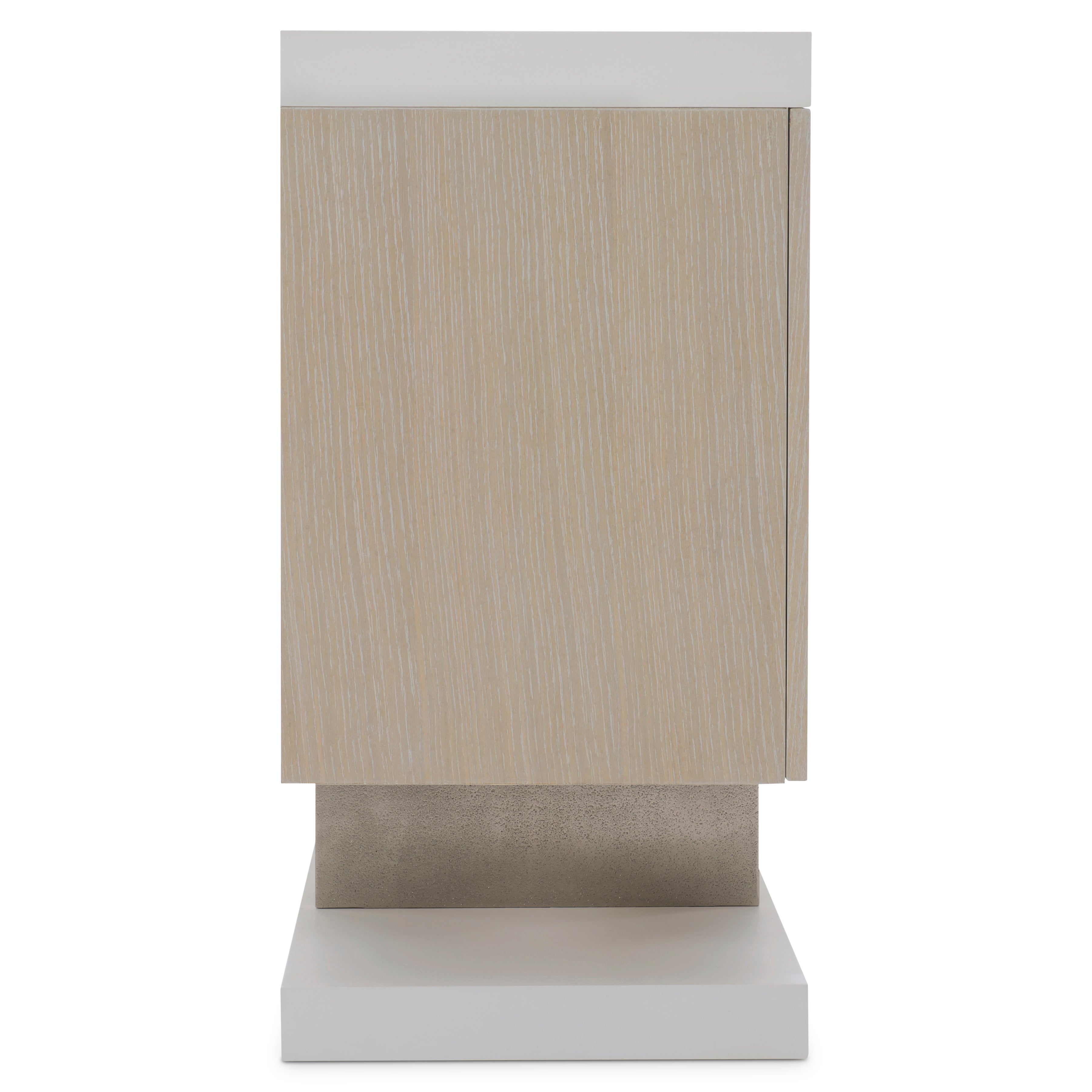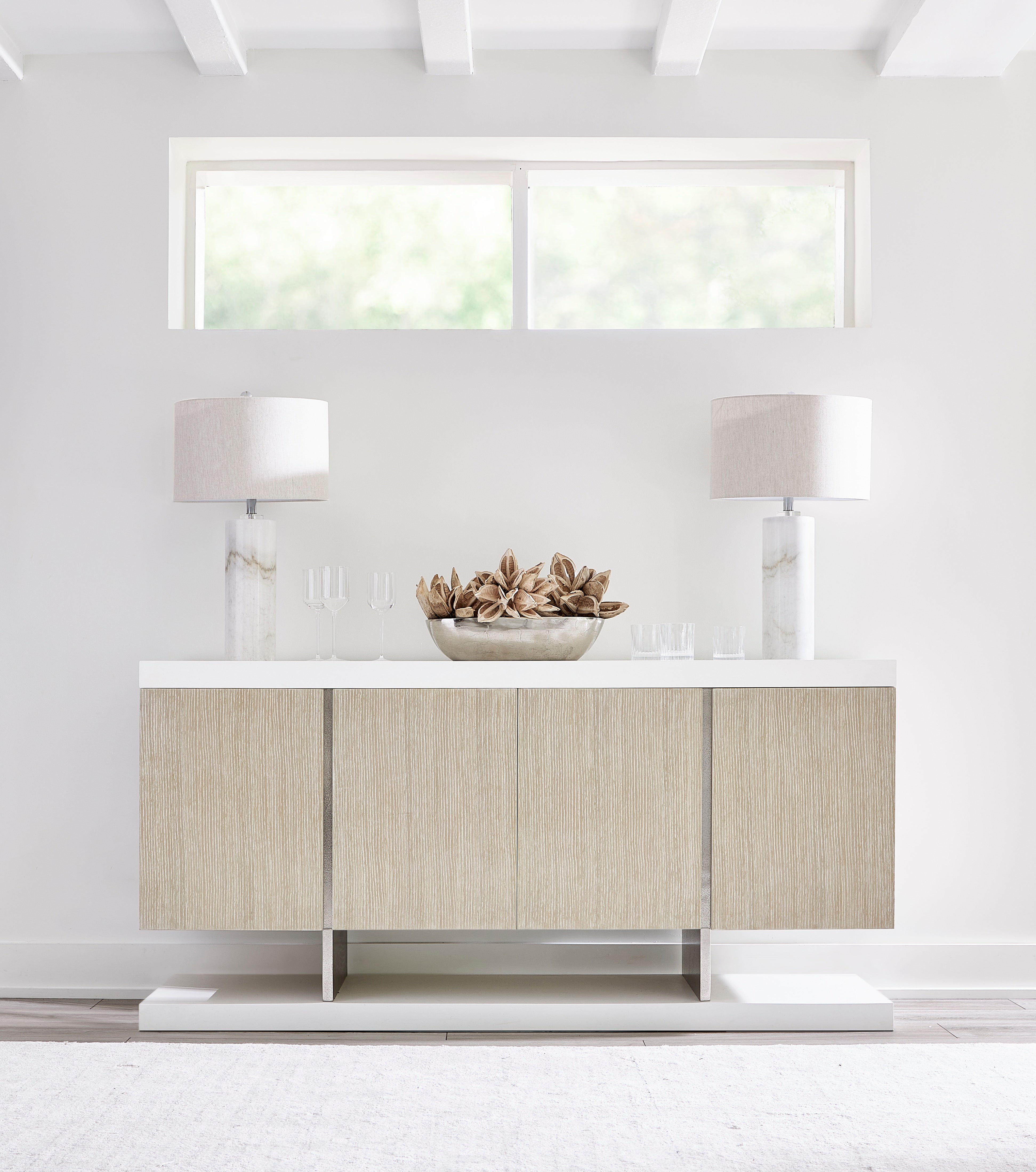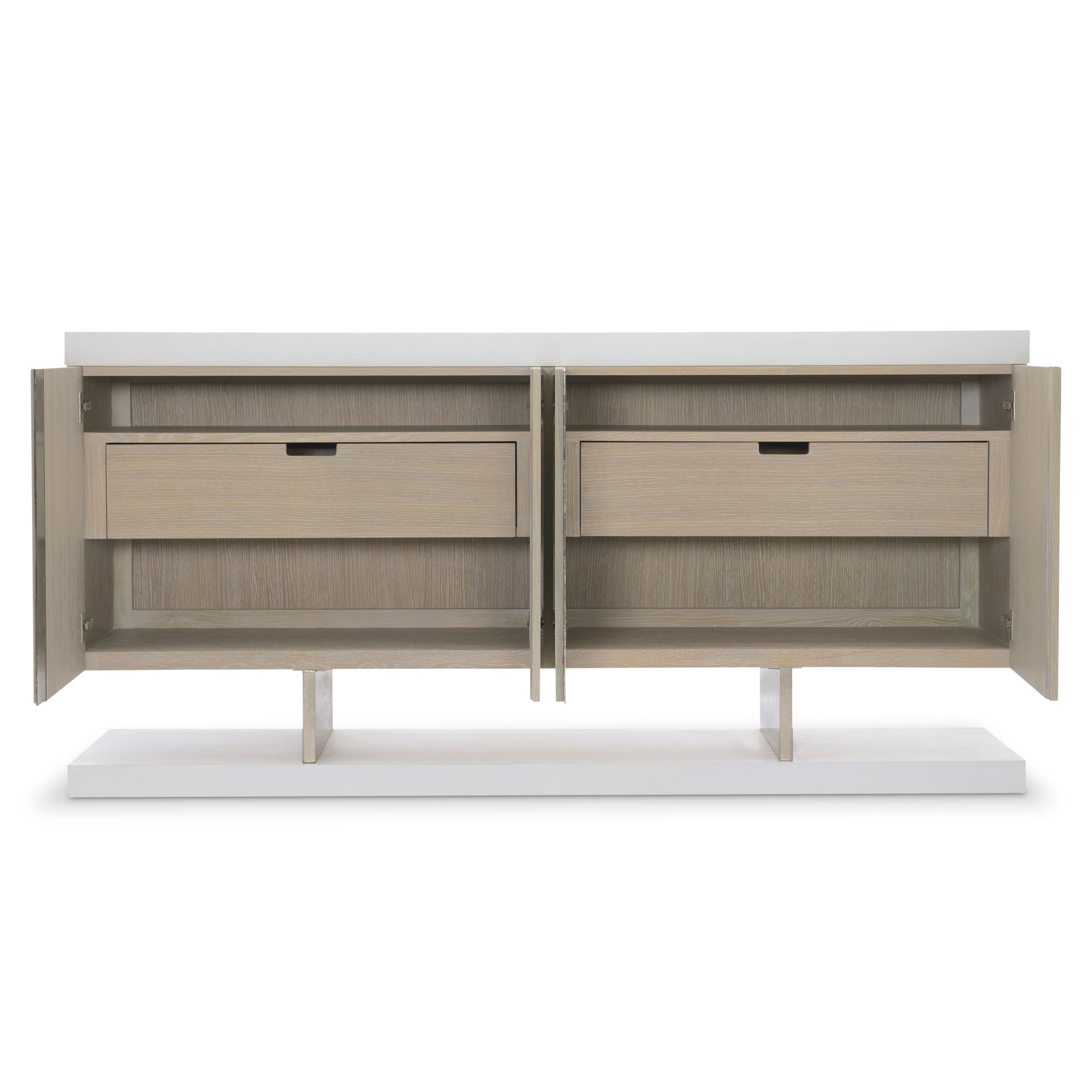 Monolithic panels of cast aluminum in shiny nickel finish create an elemental look on the Solaria sideboard. Featuring quartered white oak veneers in a Dune finish, the wooden case floats above a faux stone base, while a matching top echoes the base. Two hidden, self-closing doors open to reveal storage shelving and drawers.