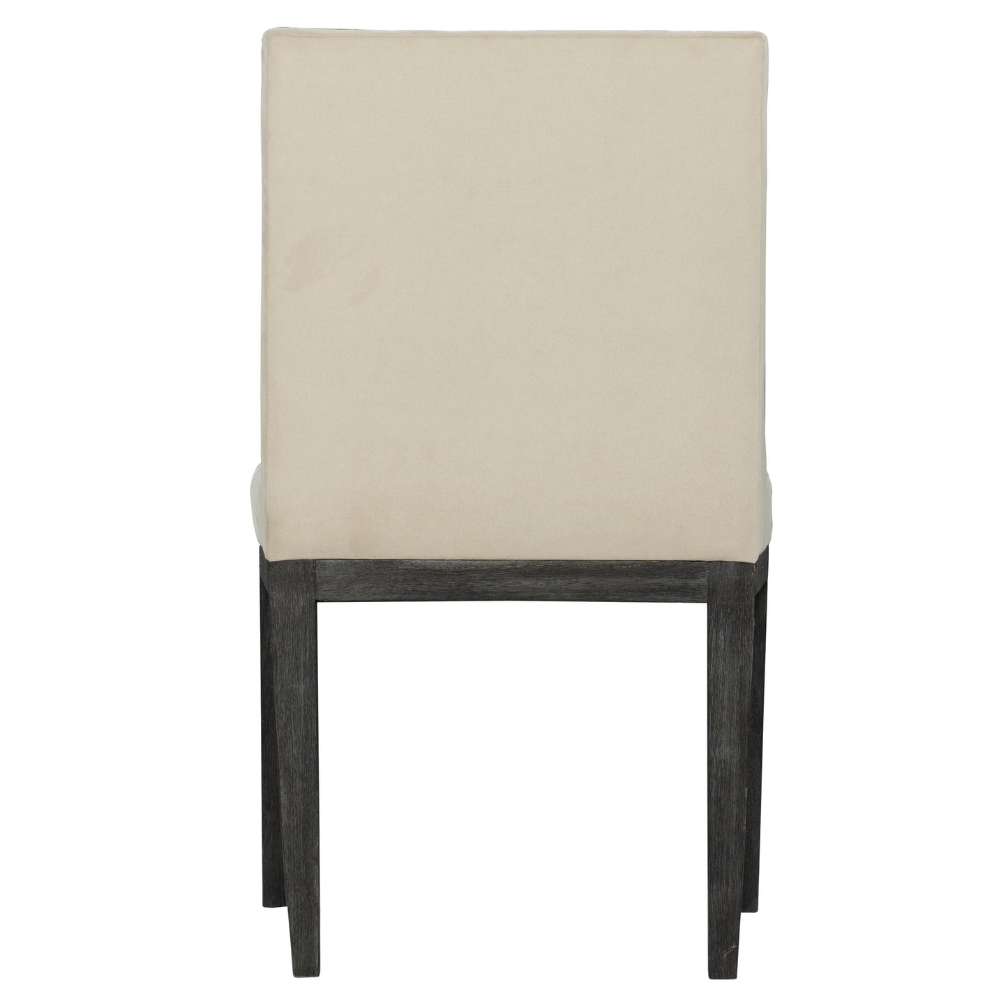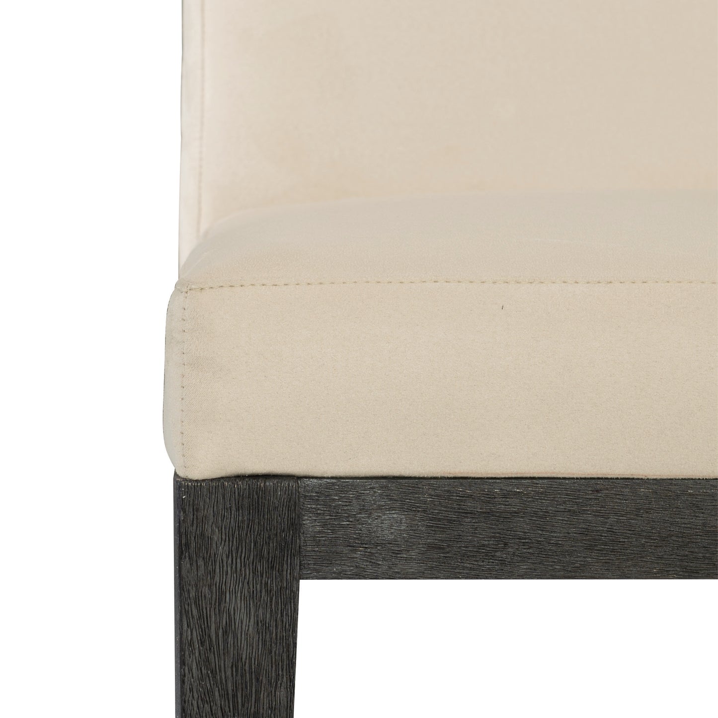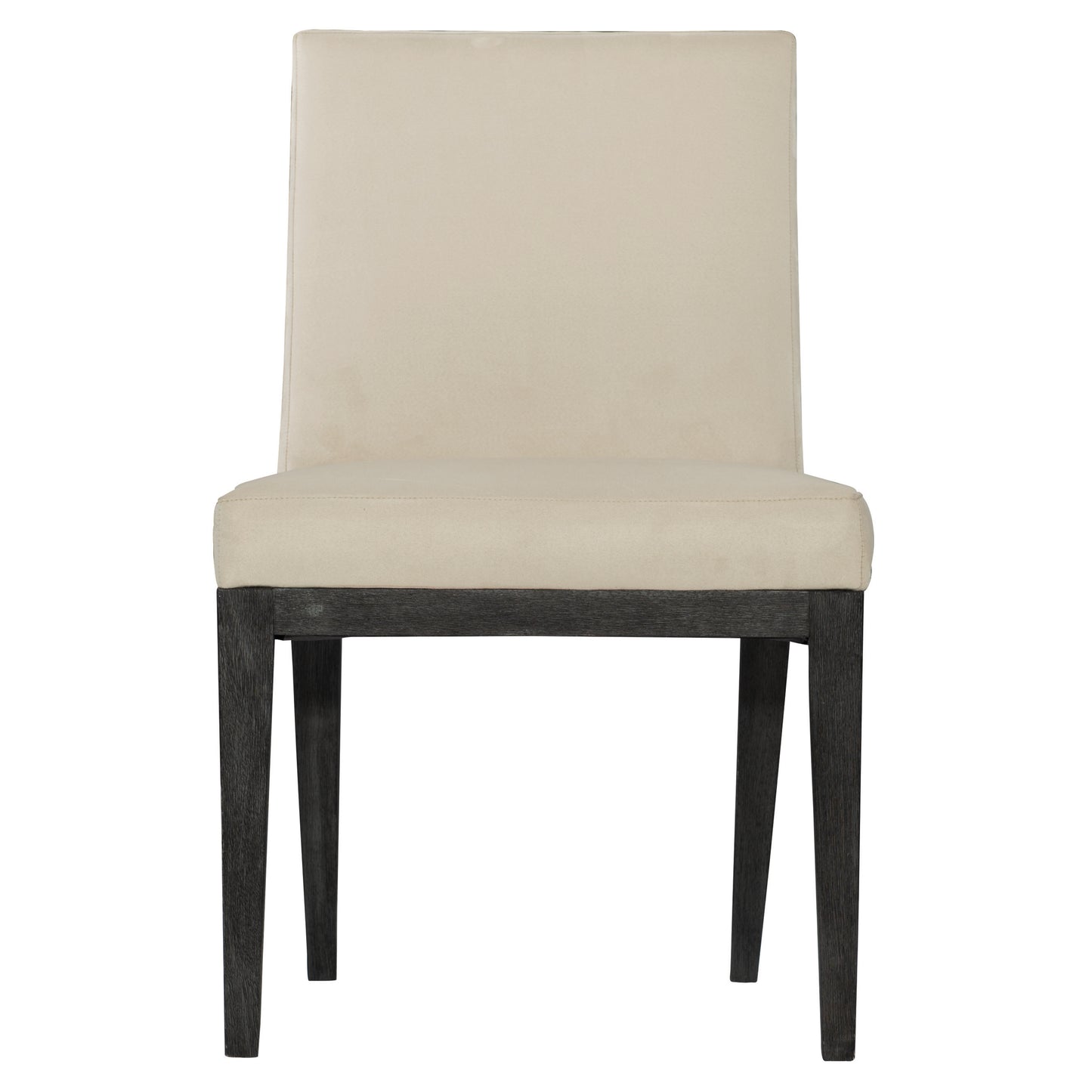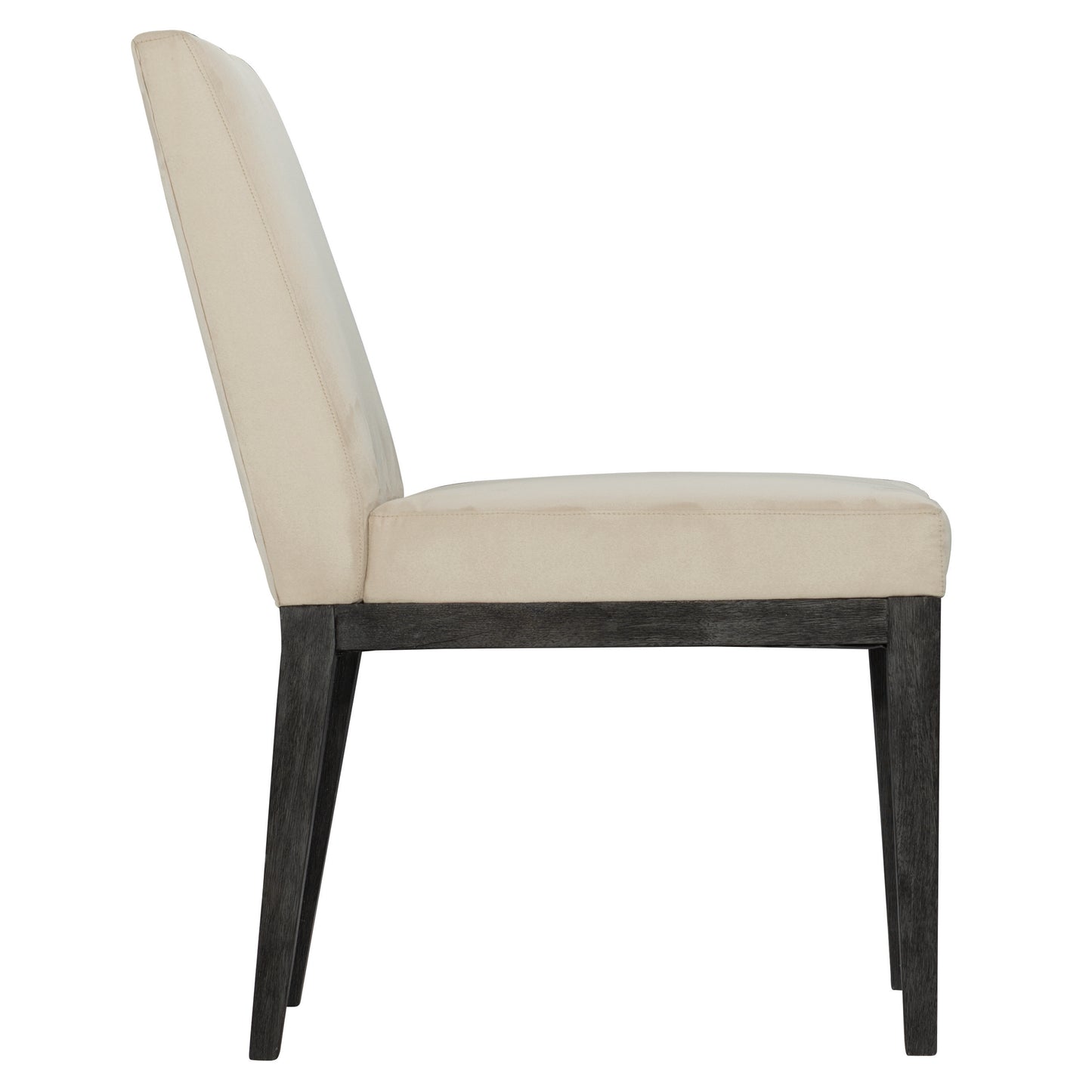 The Staley side chair combines clean, modern lines and geometric shapes to create a timeless, elegant look. The fully upholstered seat and back are available in a variety of fine fabrics. A midnight black finish on the exposed wood legs adds a glamorous finishing touch.