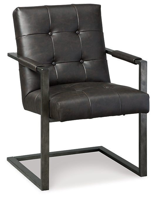 For fans of urban industrial design, this set of 2 chairs steals the show. Its metal C-frame in a blackened gunmetal finish is sleek, sculptural and ultra modern. Crafted for looks and comfort, the tufted box seat, wrapped in a "weathered" faux leather upholstery, is loaded with retro chic flair.