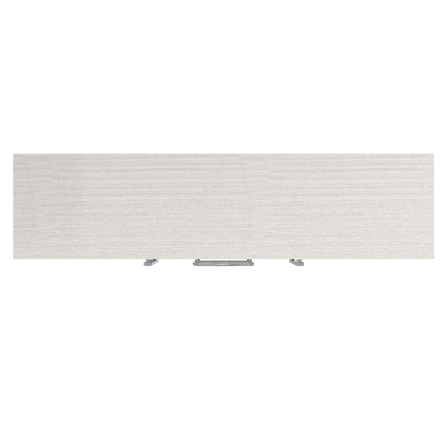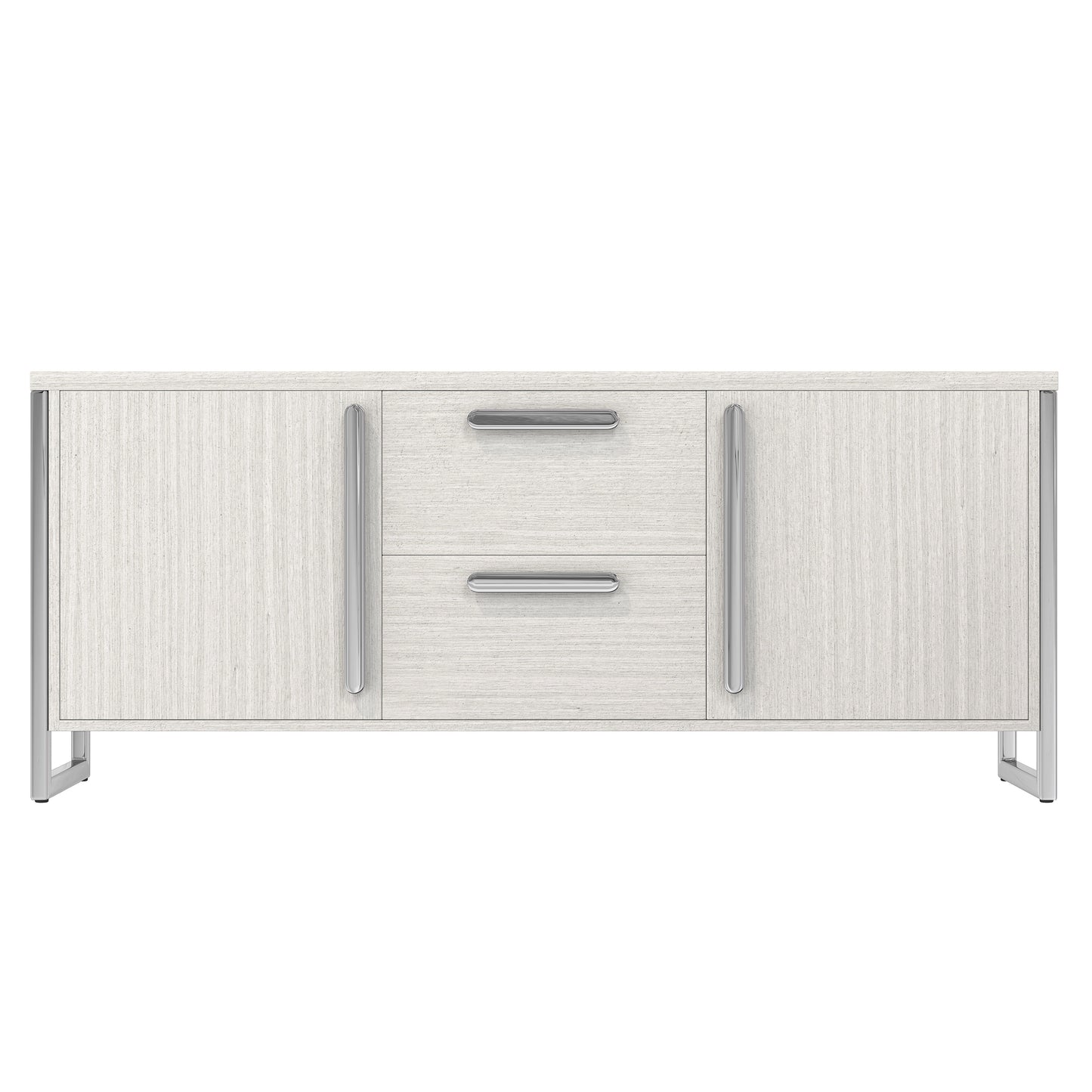 The Stratum buffet offers a hint of glamour with the gleam of polished metal from open end frames and sleek hardware. A beautiful wood grain pattern comes through in the Mist finish. Two soft-close doors and two center drawers provide ample storage.