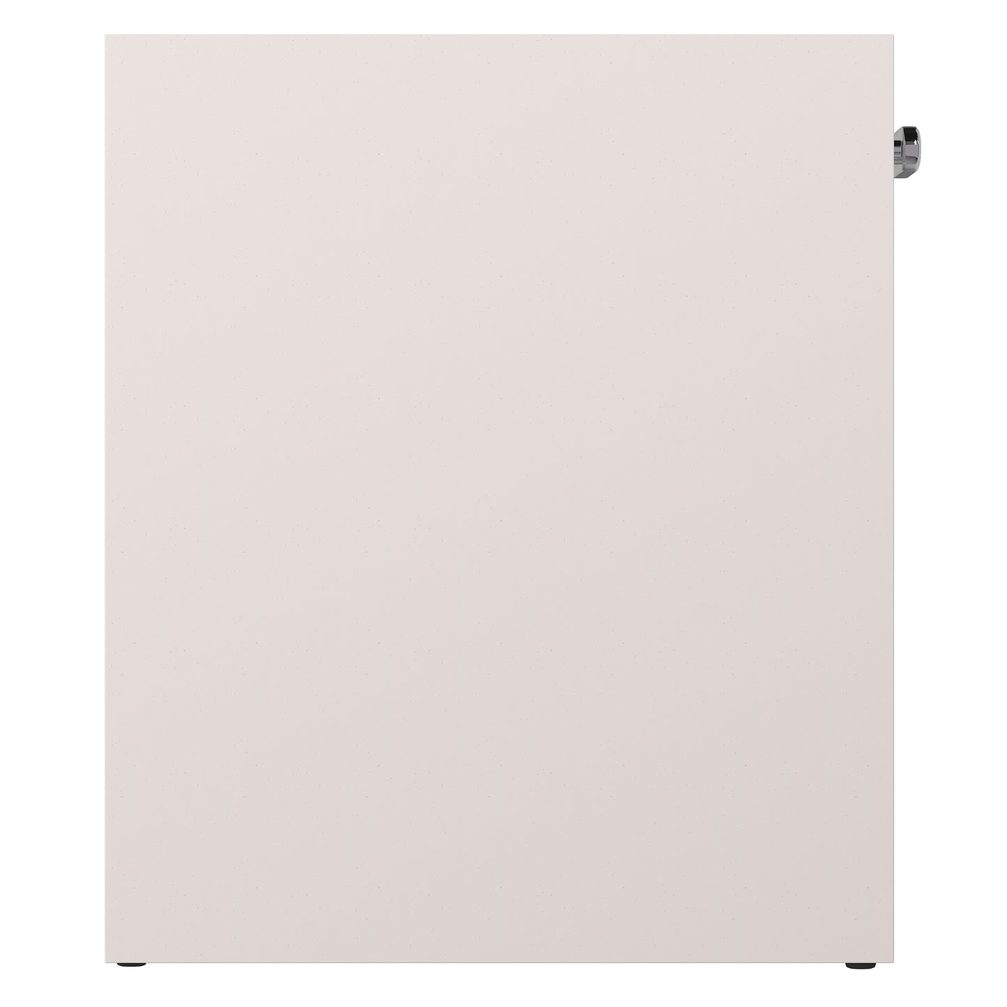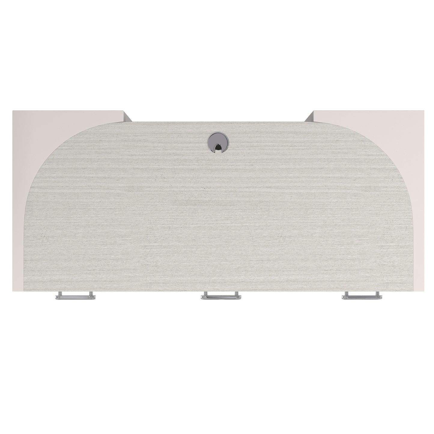 The modern Stratum desk finds its style in a precise geometry of angles and curves. A rectangular top in the Mist finish is supported by two white faux stone end panels that wrap around the back corners of the desk. Three drawers are highlighted with polished metal pulls. Hidden beneath is a power unit with two USB ports and two outlets for extra functionality.