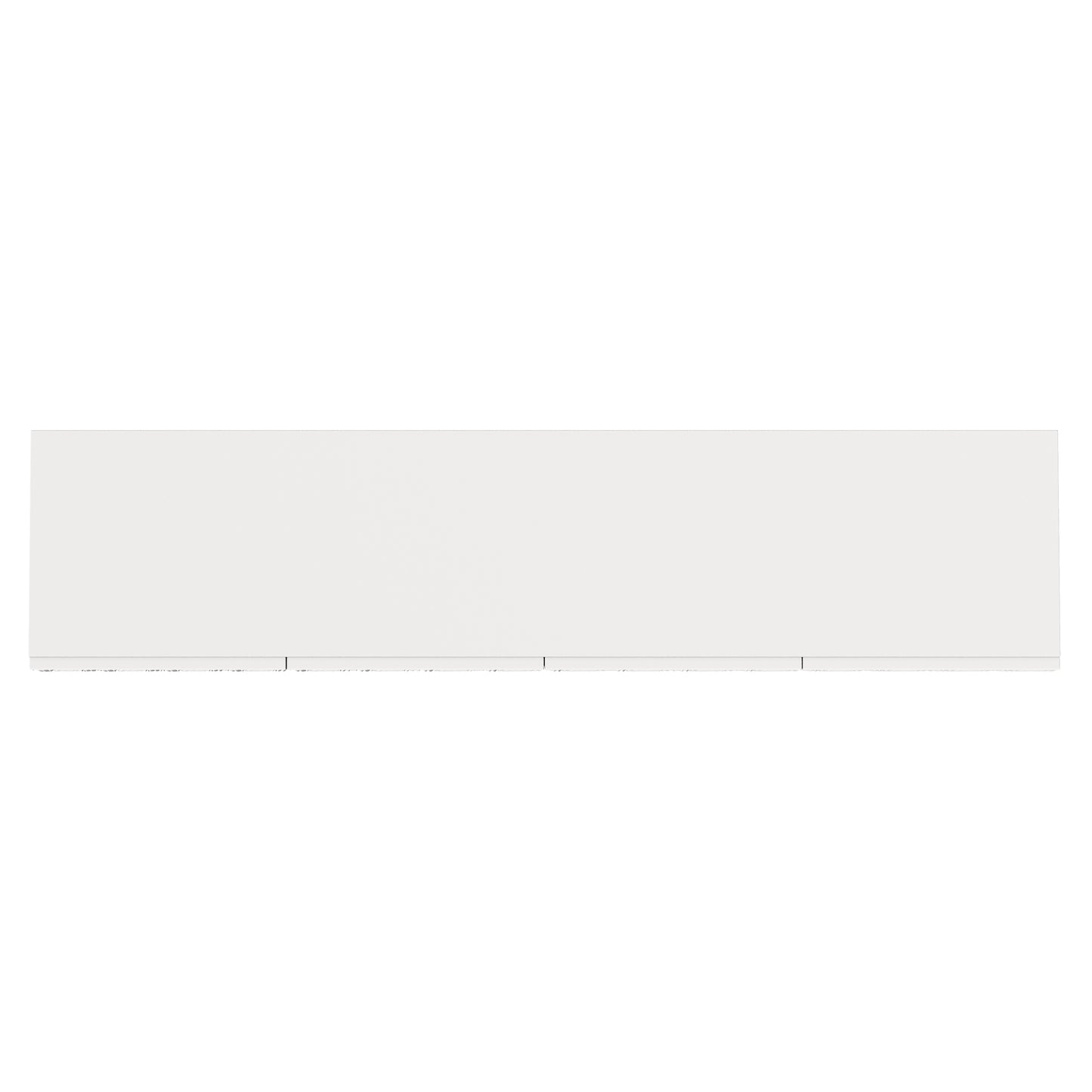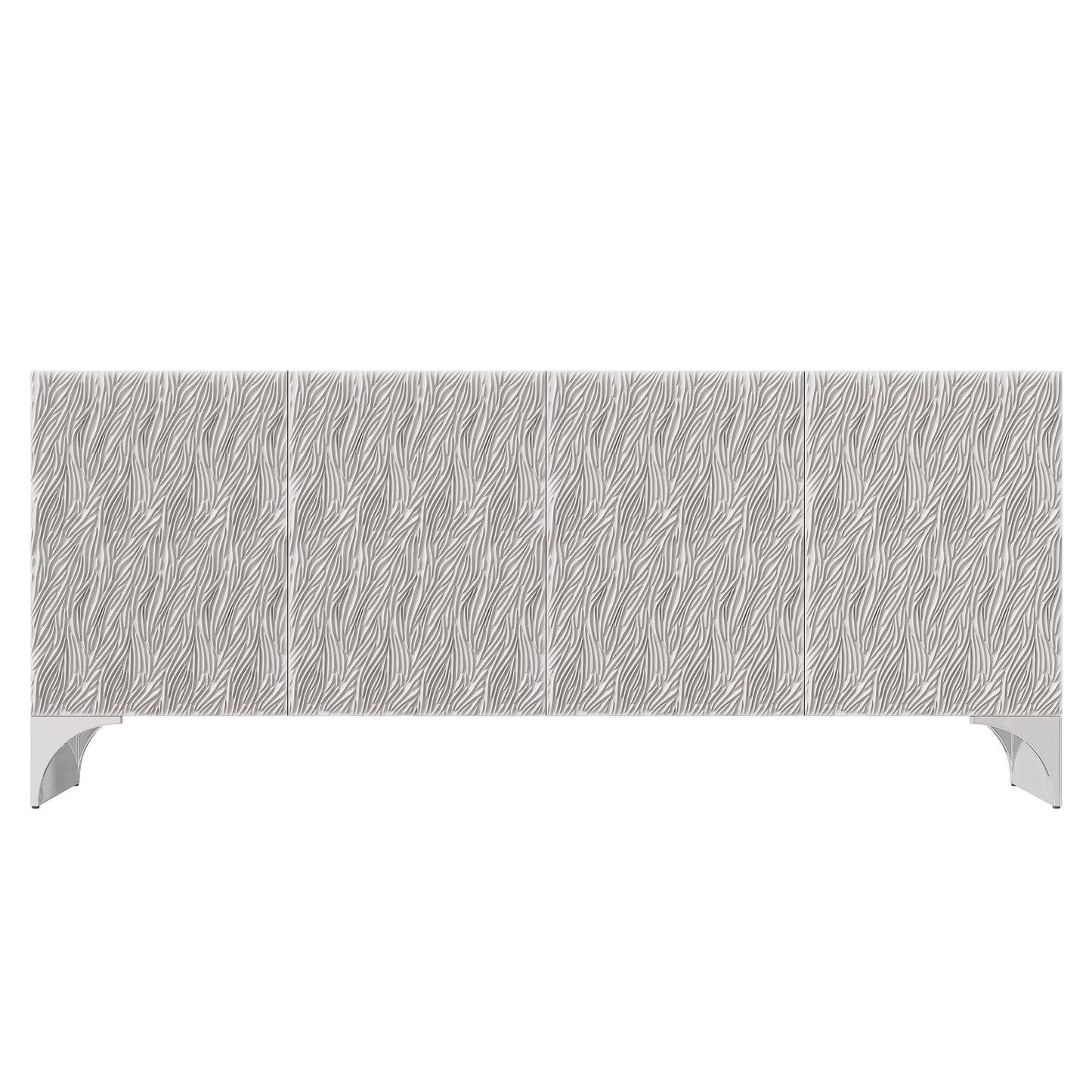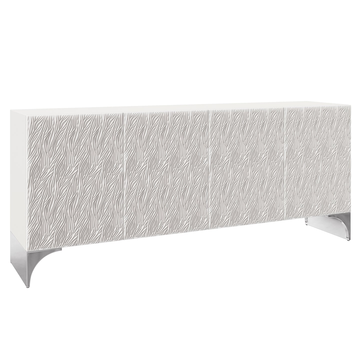 The Stratum entertainment credenza's sculpted cast resin door fronts showcase an intricate pattern inspired by the movement of wheat fields. Behind four pull-to-open, soft-close doors are fixed and adjustable shelves, vent holes and a drawer. The sides and top are finished in a Fossil white faux stone finish, and the base sits on two steel base panels in a Polished Nickel finish.
