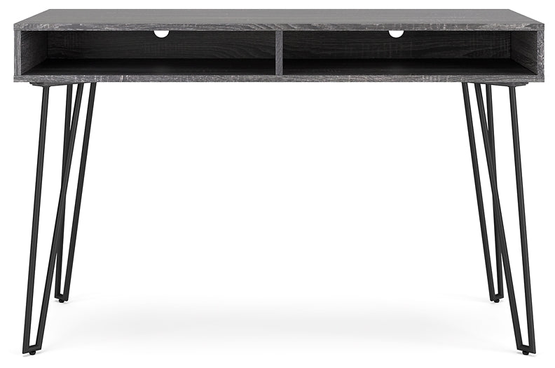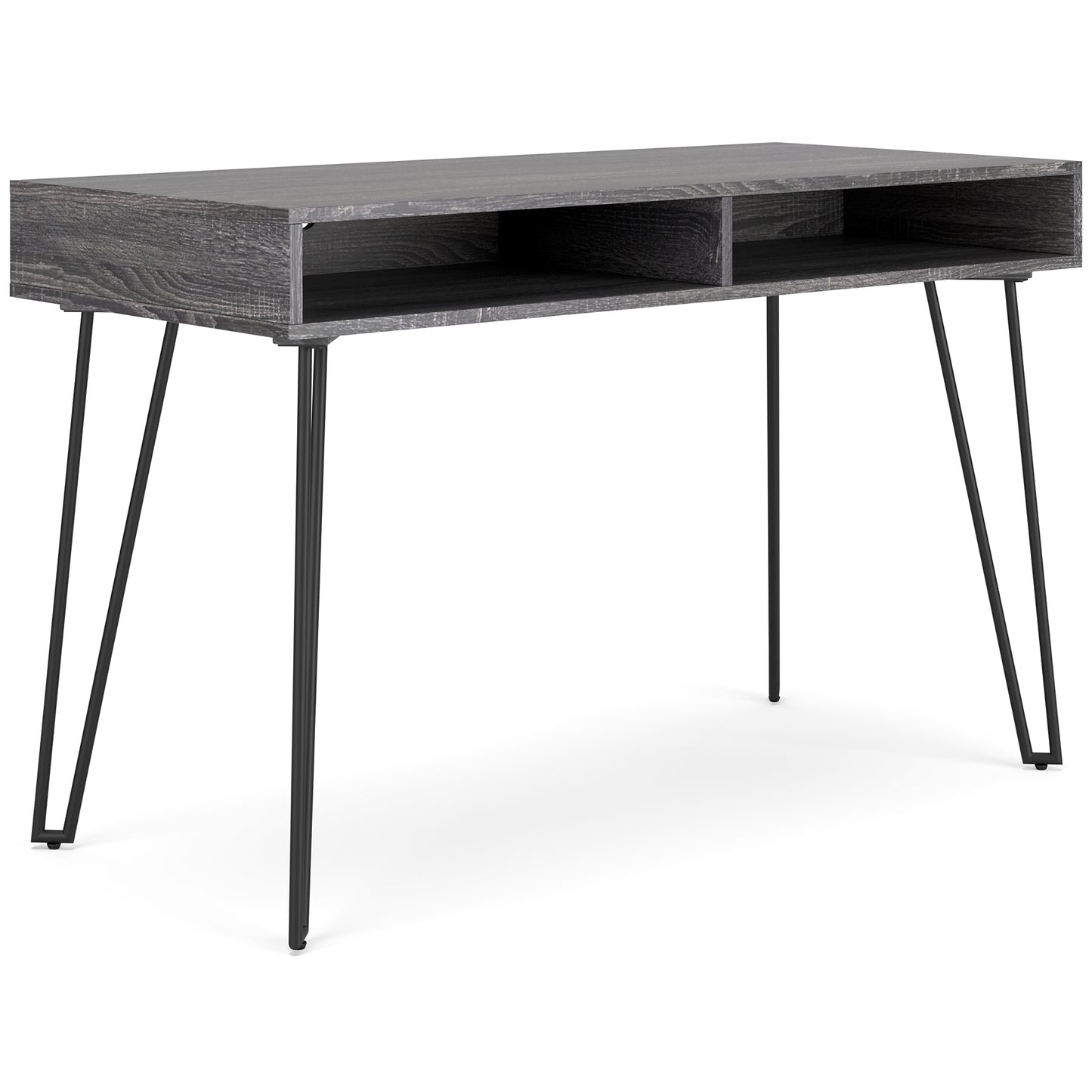 Sporting a sleek and simple profile, this home office desk is casual contemporary at its finest. The desktop is wrapped in a replicated dark charcoal gray wood grain and paired with decidedly mid-century style black legs for a familiar-yet-fresh design. And with two included open storage areas and a cord management raceway, this desk elevates your at-home workspace with both function and fashion.