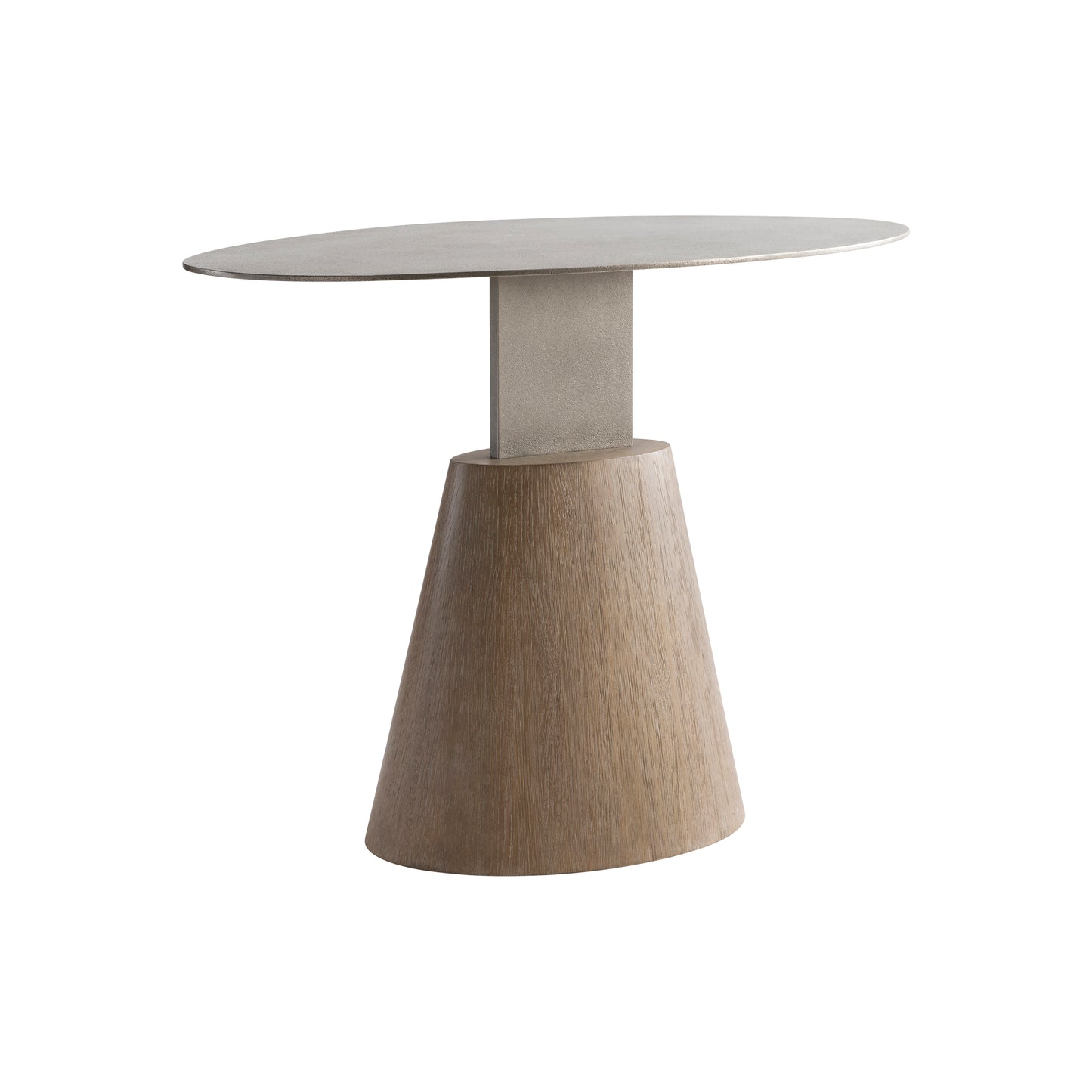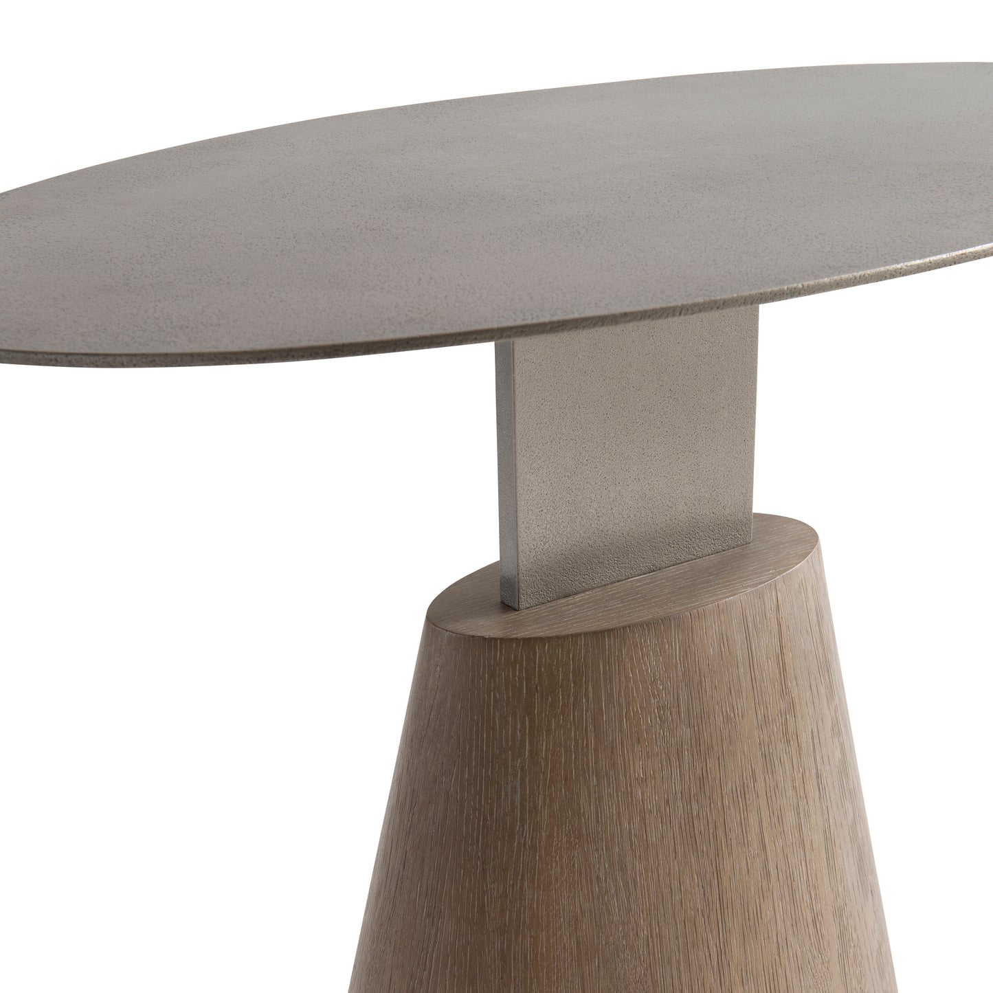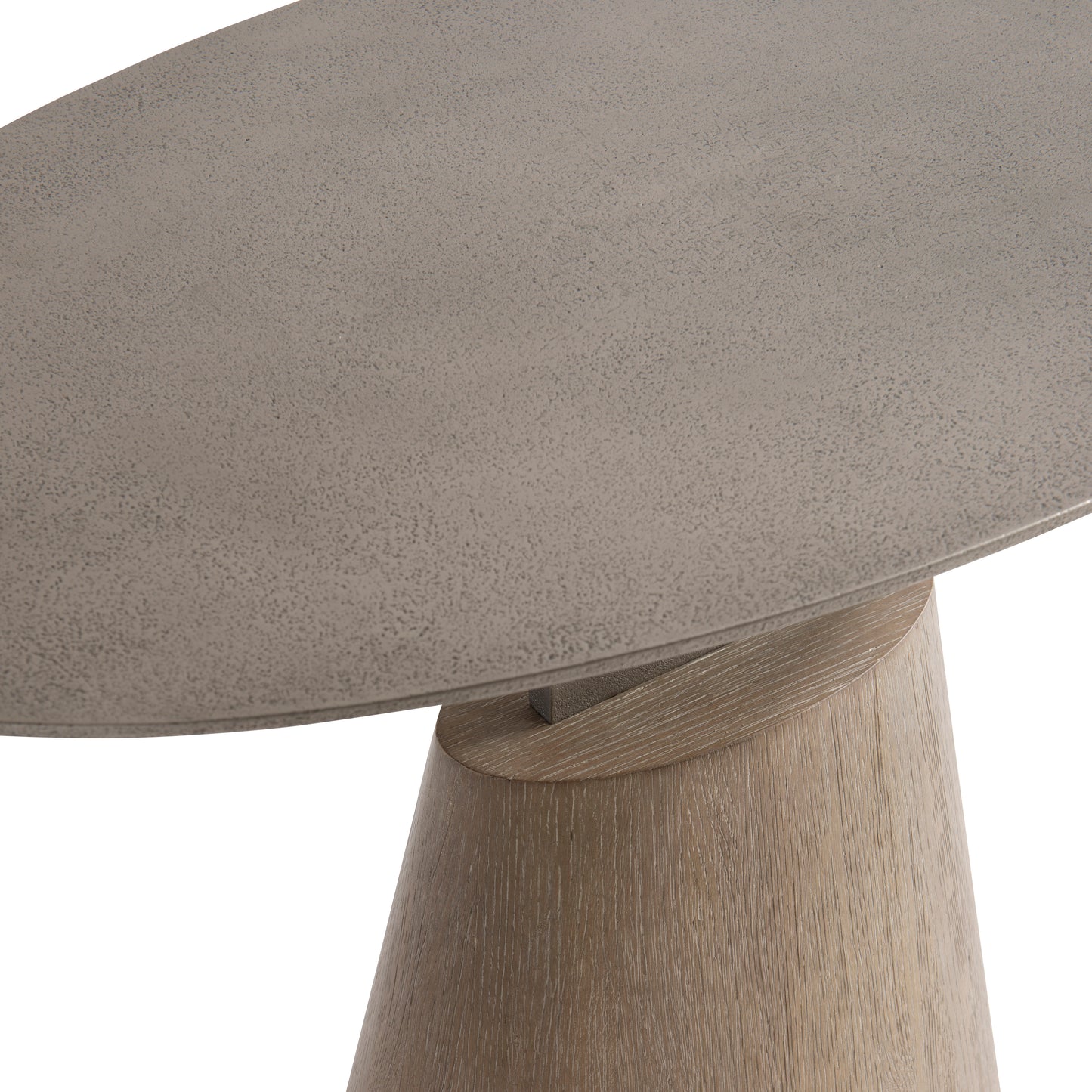 Modern shapes are crafted into a cutting-edge design for the Titus nightstand. A cast aluminum oval top rises from a wood base, held aloft by a cast aluminum rectangular pedestal. The metal is featured in a Graphite finish that perfectly complements the Sandbar finish on the base.