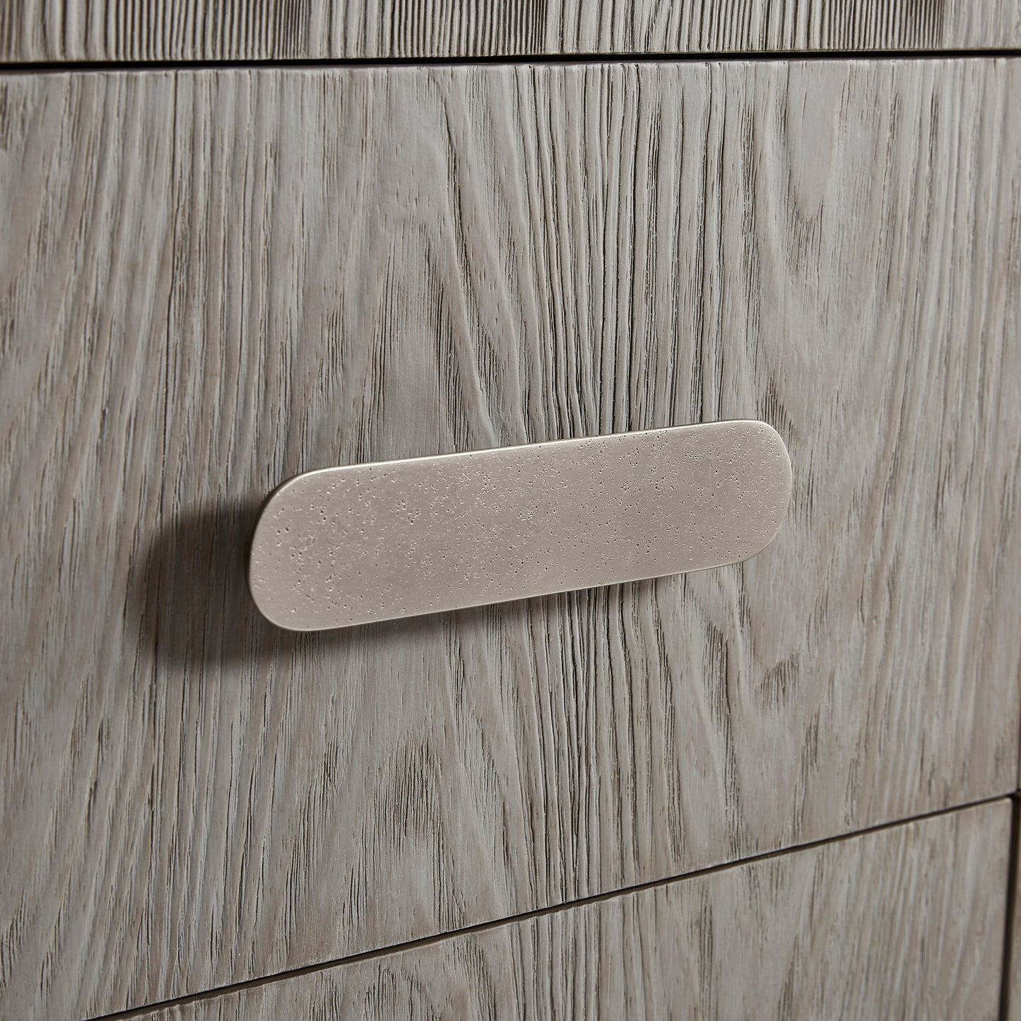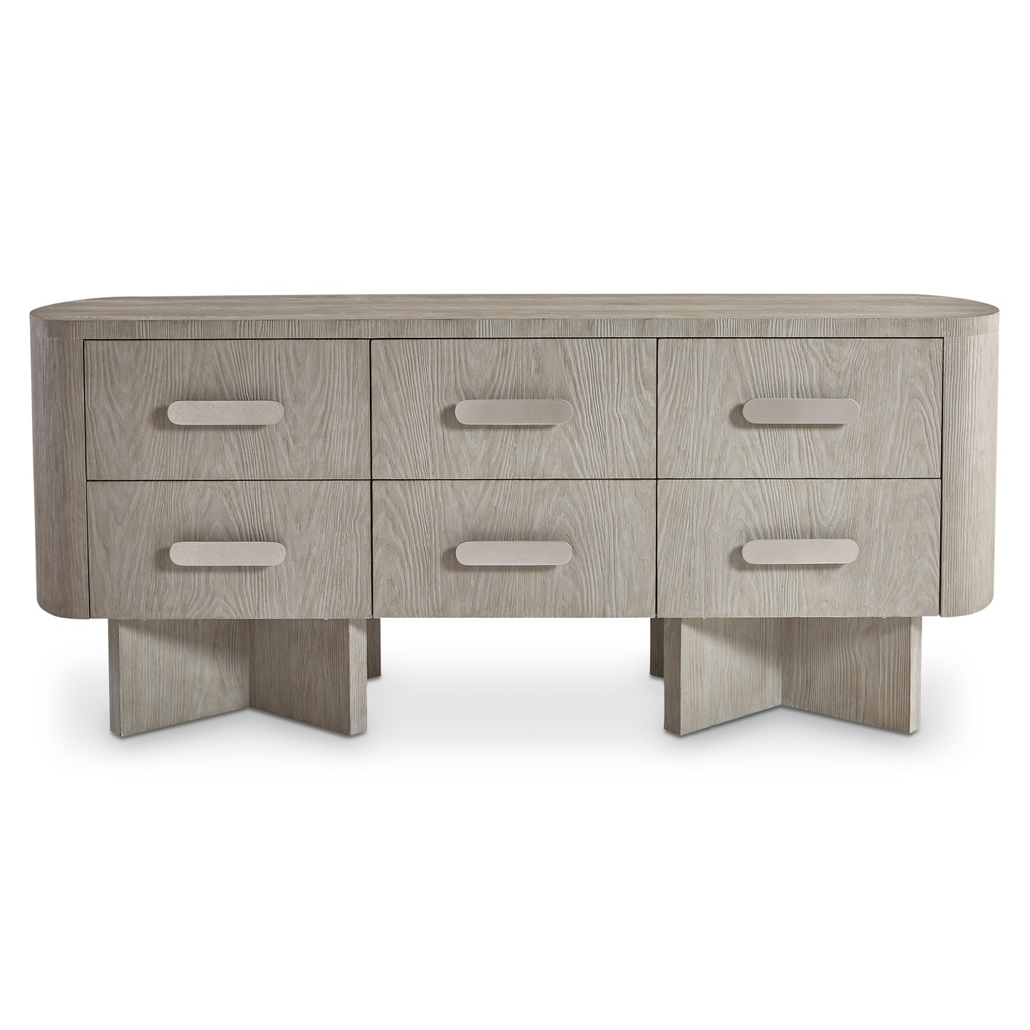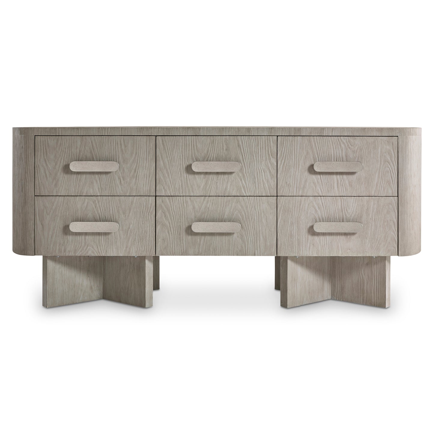 Two distinctive X-shaped pedestal bases give the Trianon dresser a unique design. Rounded ends continue the shaping theme and complement the six rectangular soft-close drawers. Oval hardware in a textured metal provide the perfect finishing touch.