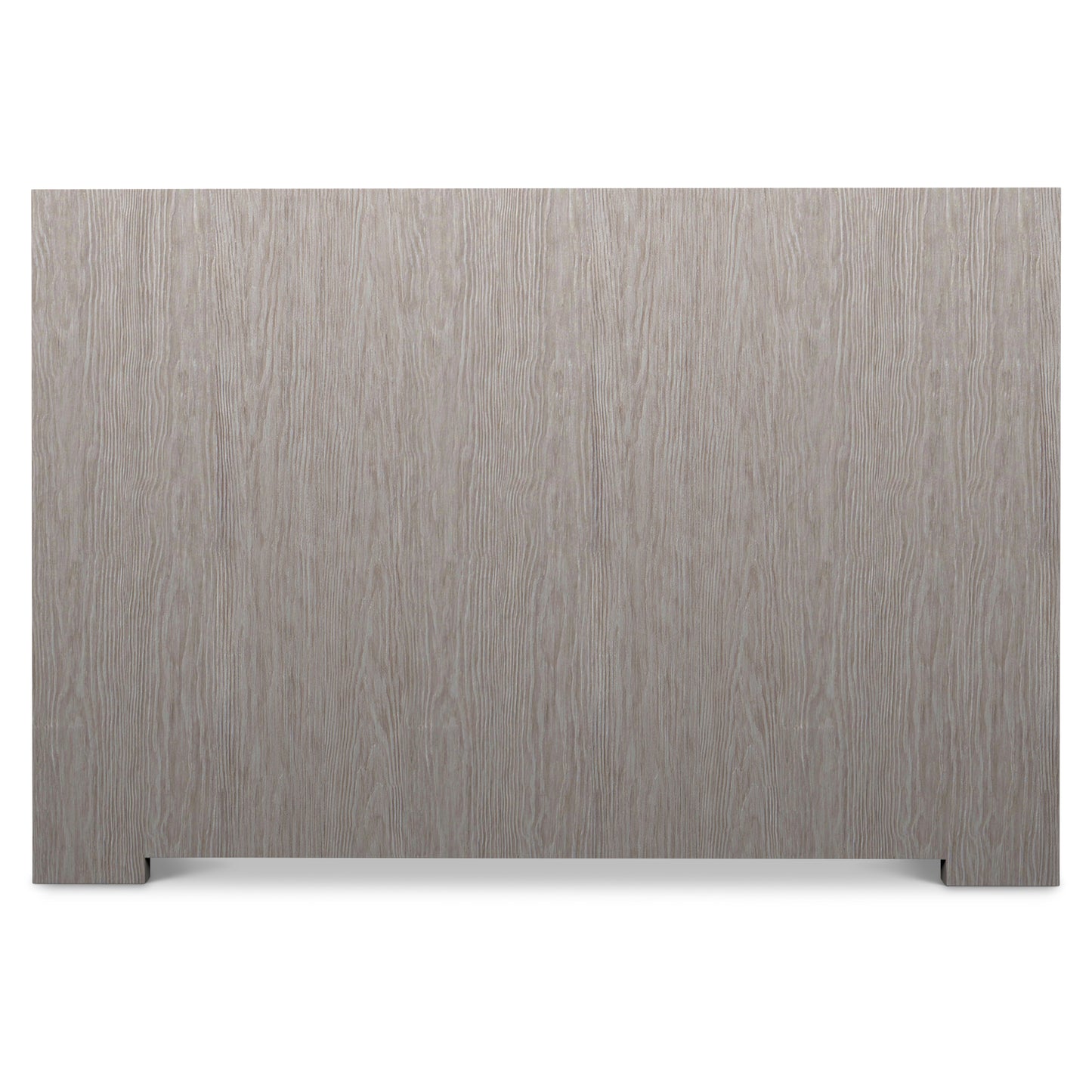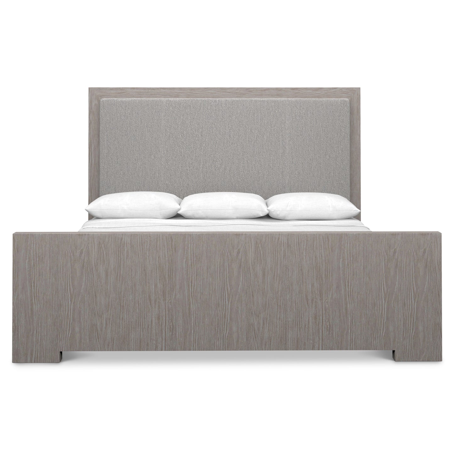 The Trianon panel bed makes a bold and striking statement with a thick-cut, heavily wire-brushed pine frame. The bed is finished in the lighter Gris, including the side panels and impressive footboard. An upholstered inset panel in the headboard adds an element of softness and comfort.
