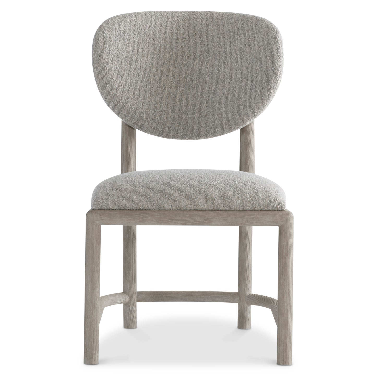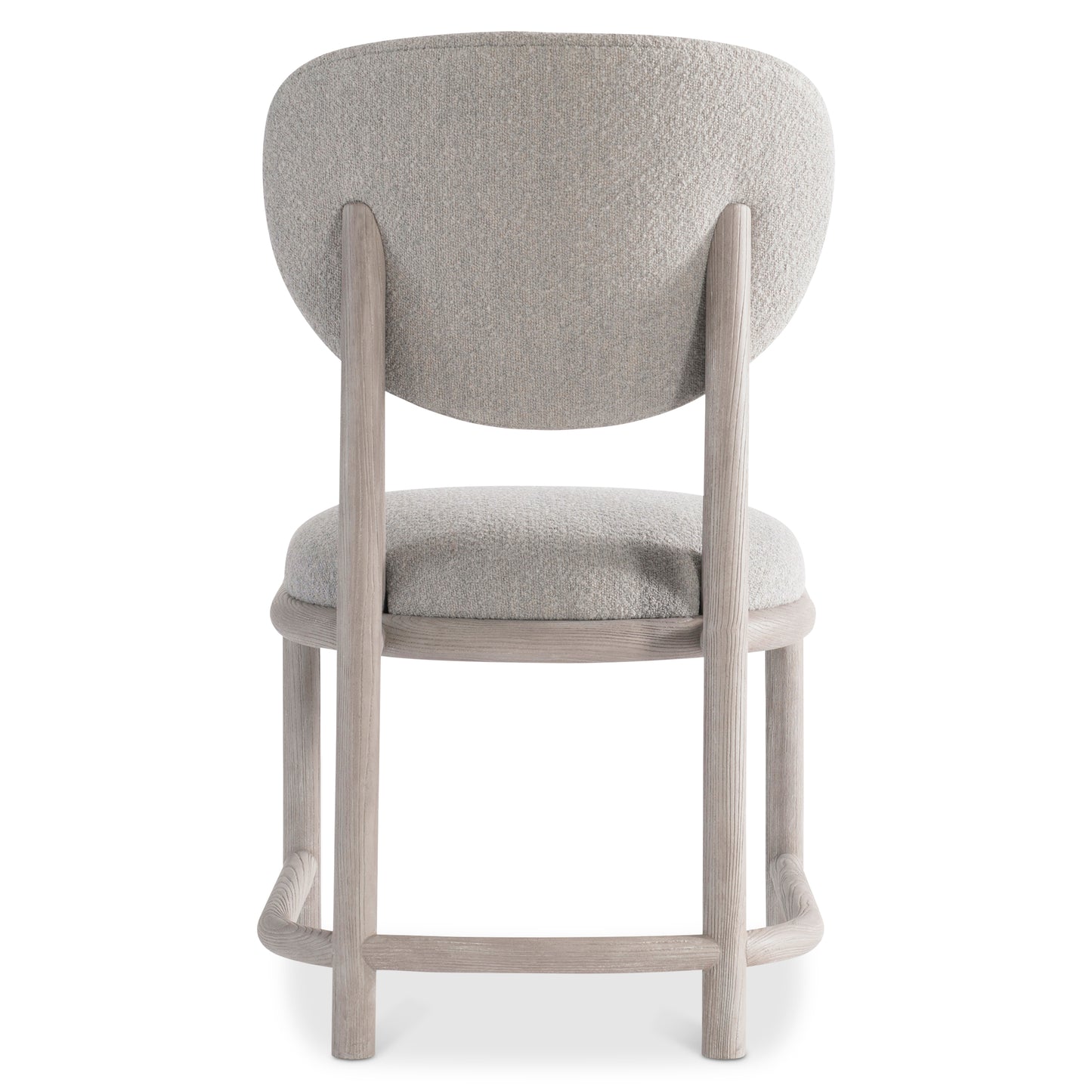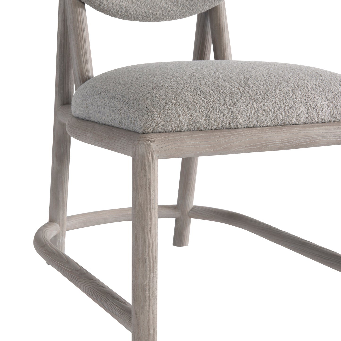A modern organic design gives the Trianon side chair its distinctive look. Open spaces create a sense of lightness within the bold structure of the chair's frame, including angled back legs that stretch up to the curved upholstered back. The exposed wood frame is heavily textured in the Gris finish.