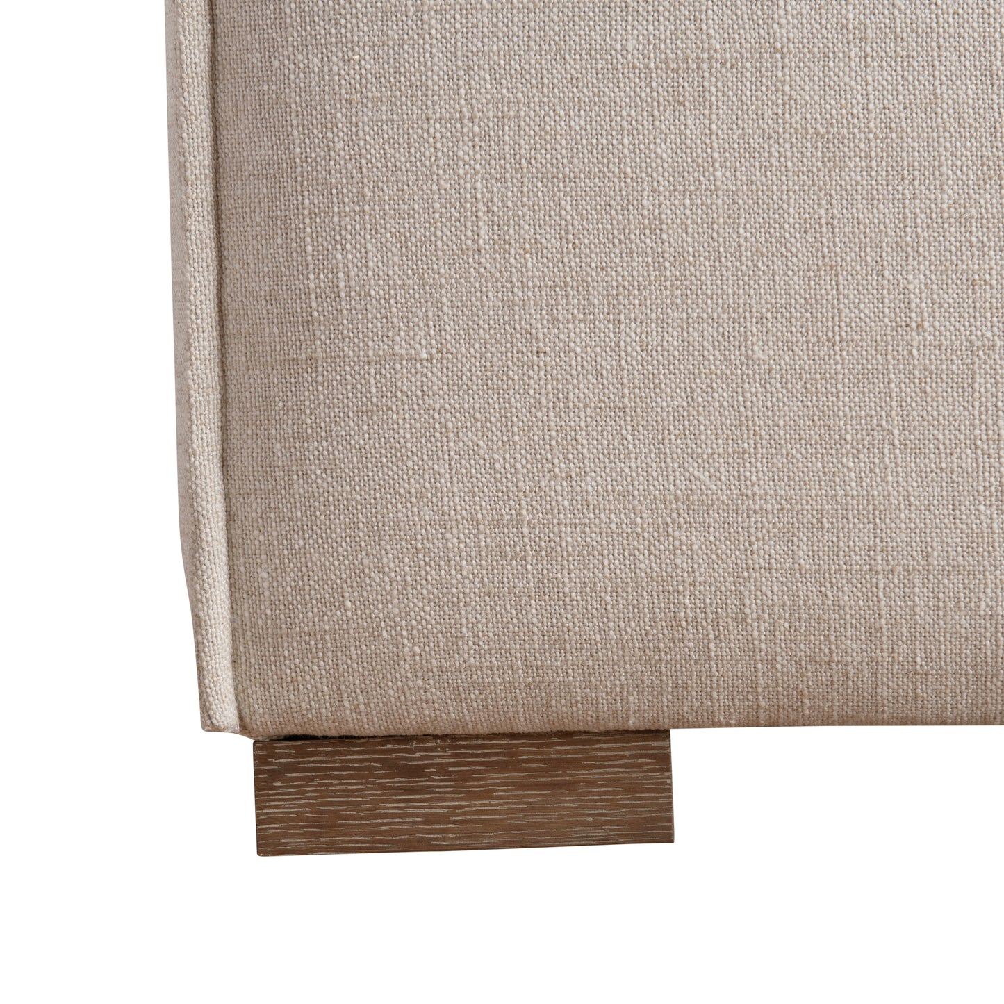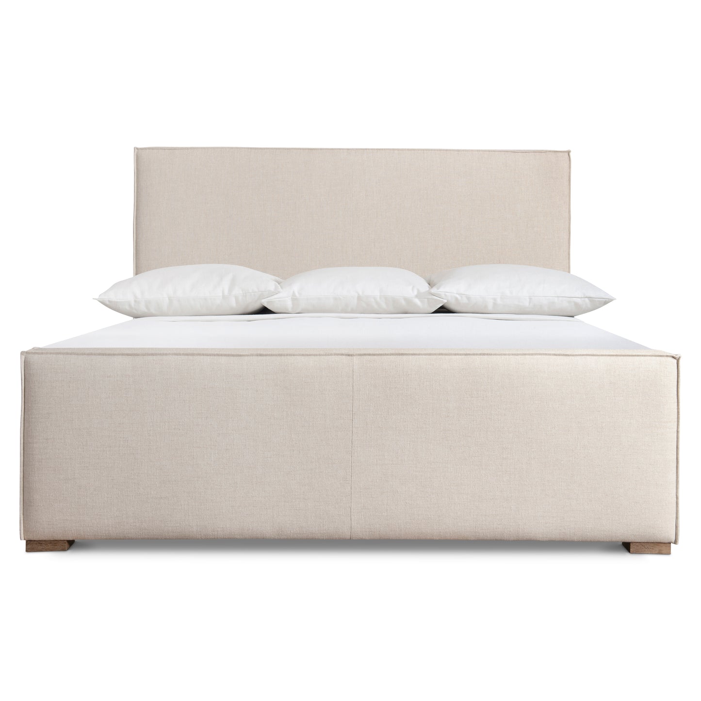 The Tribeca panel bed crafts a modern organic look with an upholstered headboard and footboard that feature unique double welt flanges. The side rails are also upholstered, softening the sleek straight lines of the design. Four wood feet are finished in Aurum.