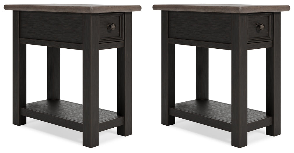 Quality crafted and richly styled, this rectangular chairside end table set is sure to charm. Its two-tone aesthetic pairs a weathered grayish brown tabletop with a textured wire-brushed base in black with rub-through effect. The built-in shelf offers handy display space, while an integrated 110V power supply with dual USB charging ports makes it so easy to keep your personal devices powered up.