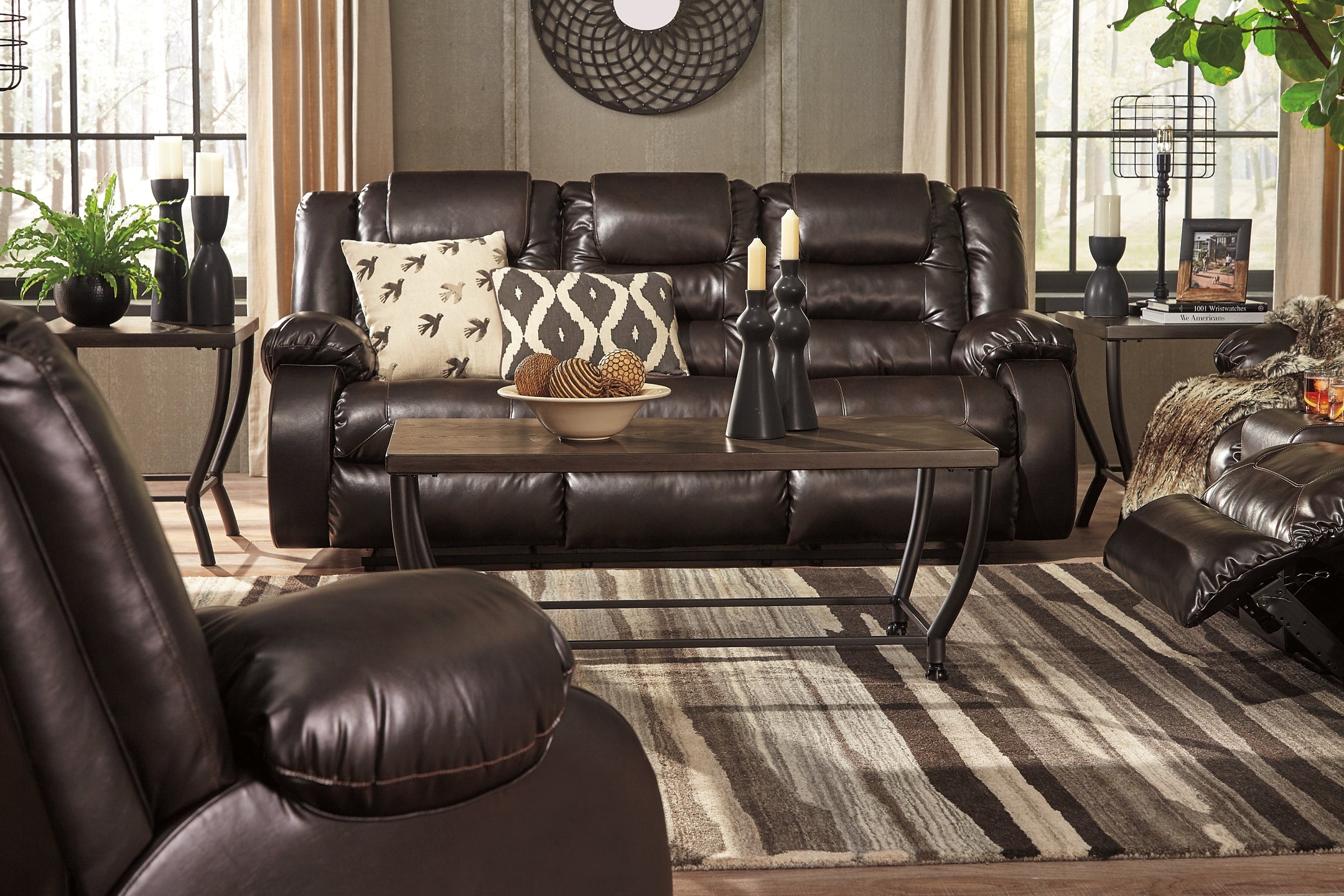 When it comes to comfort, style and value, this faux leather reclining sofa in chocolate brown rocks. Tailored for feel-good flair, its fashion-forward bustle back design is enhanced with sculpted padding on the headrest for cradling support. Channel cushioning along the sides flows into thick, wrapped pillow top armrests that are truly over the top. And while it might look like you broke the bank, a sumptuously soft leather-like fabric keeps indulgence well within budget.