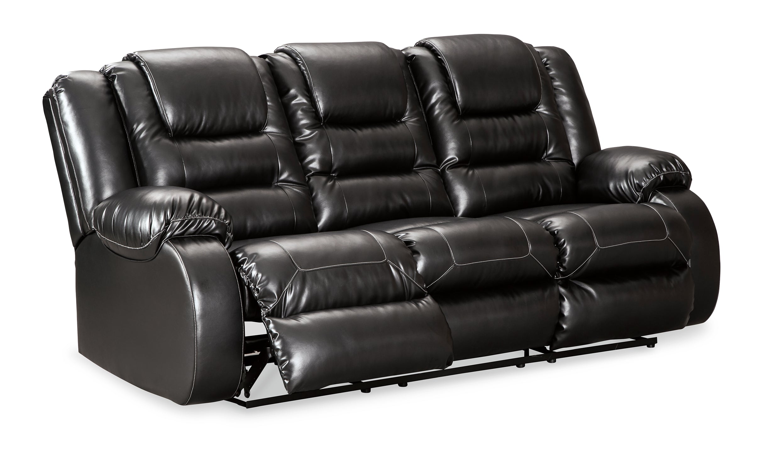 When it comes to comfort, style and value, this faux leather reclining sofa in black rocks. Tailored for feel-good flair, its fashion-forward bustle back design is enhanced with sculpted padding on the headrest for cradling support. Channel cushioning along the sides flows into thick, wrapped pillowtop armrests that are truly over the top. And while it might look like you broke the bank, a sumptuously soft leather-like fabric keeps indulgence well within budget.