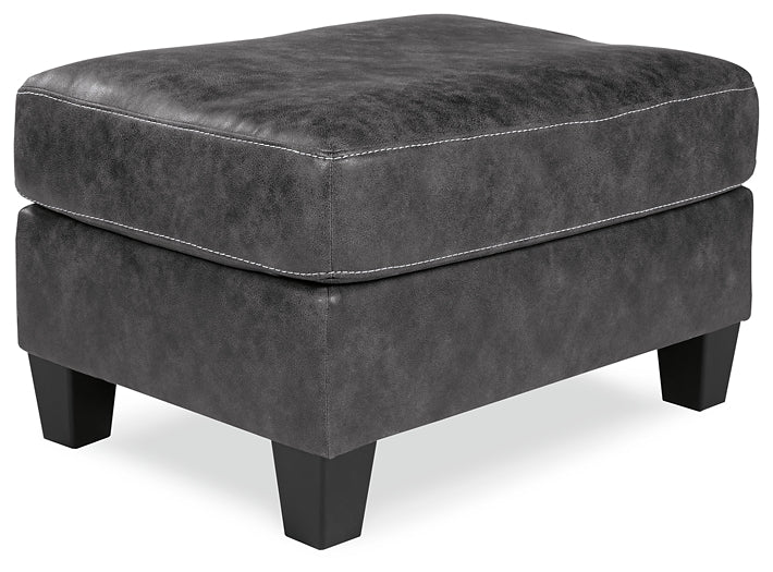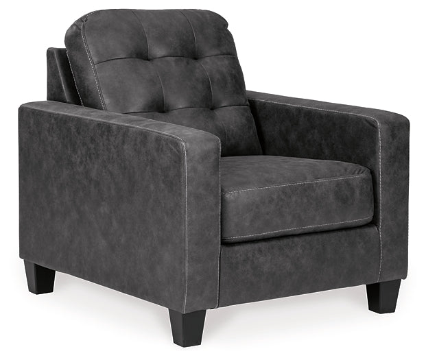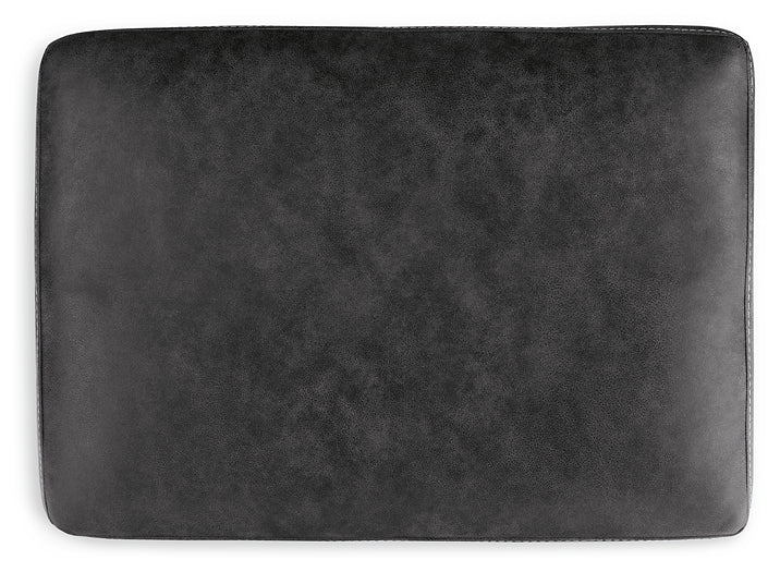 This ultra-contemporary sofa chaise, chair and ottoman set invites you to kick out and make yourself comfortable. Linear track arms offer a clean, sleek aesthetic, while tufted box cushions are a nod to mid-century design. Gunmetal gray faux leather offers the cool, weathered look you love and touchably soft feel you crave. Simply flip the cushion and slide the ottoman to reverse the chaise for customized comfort.