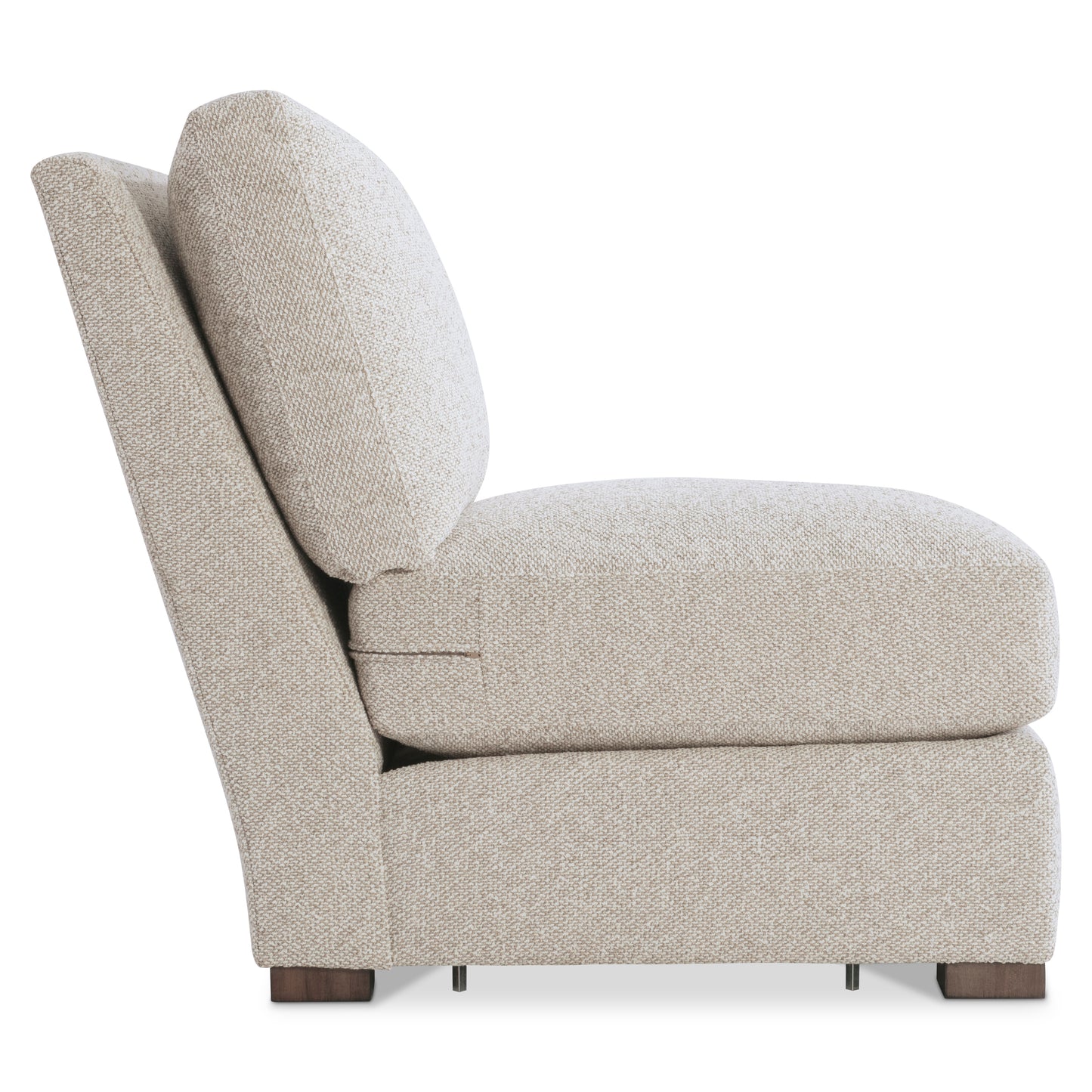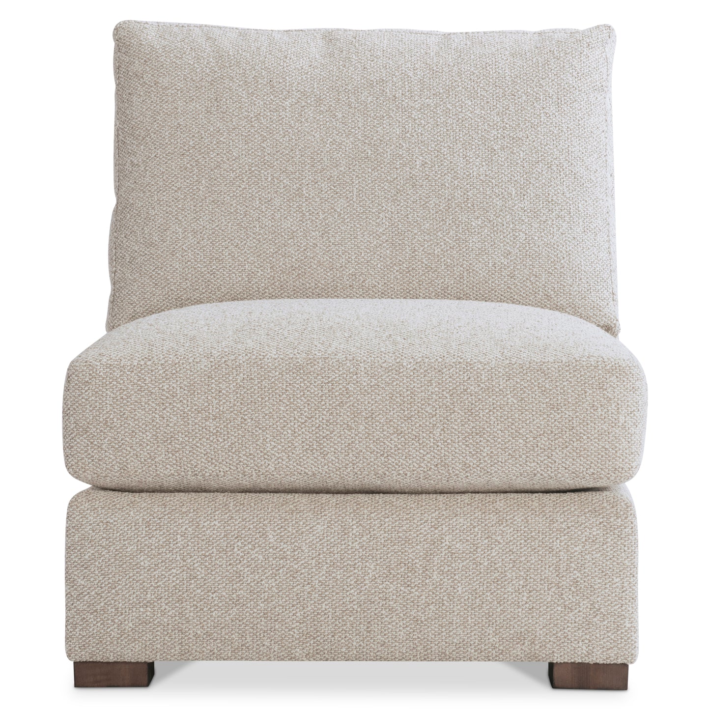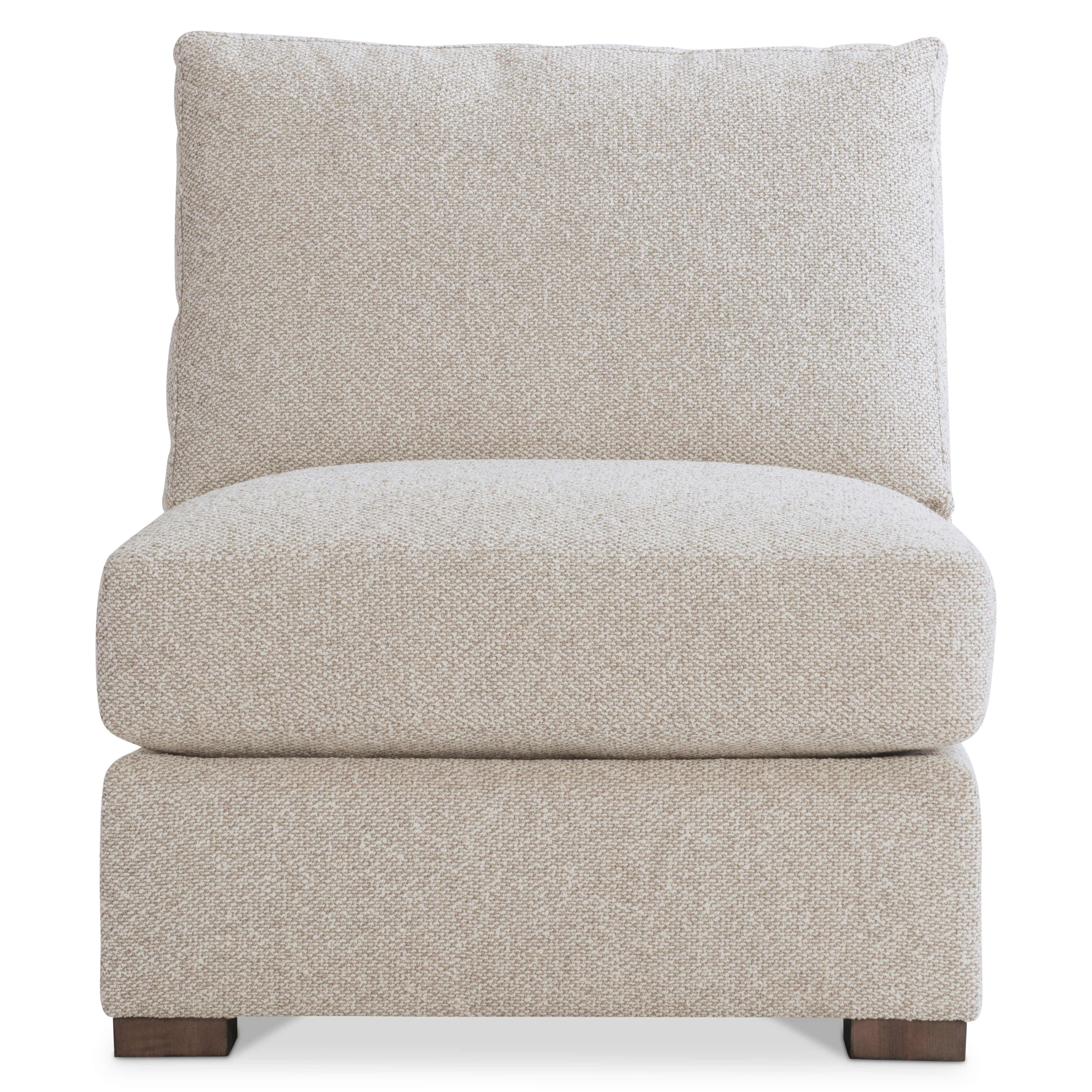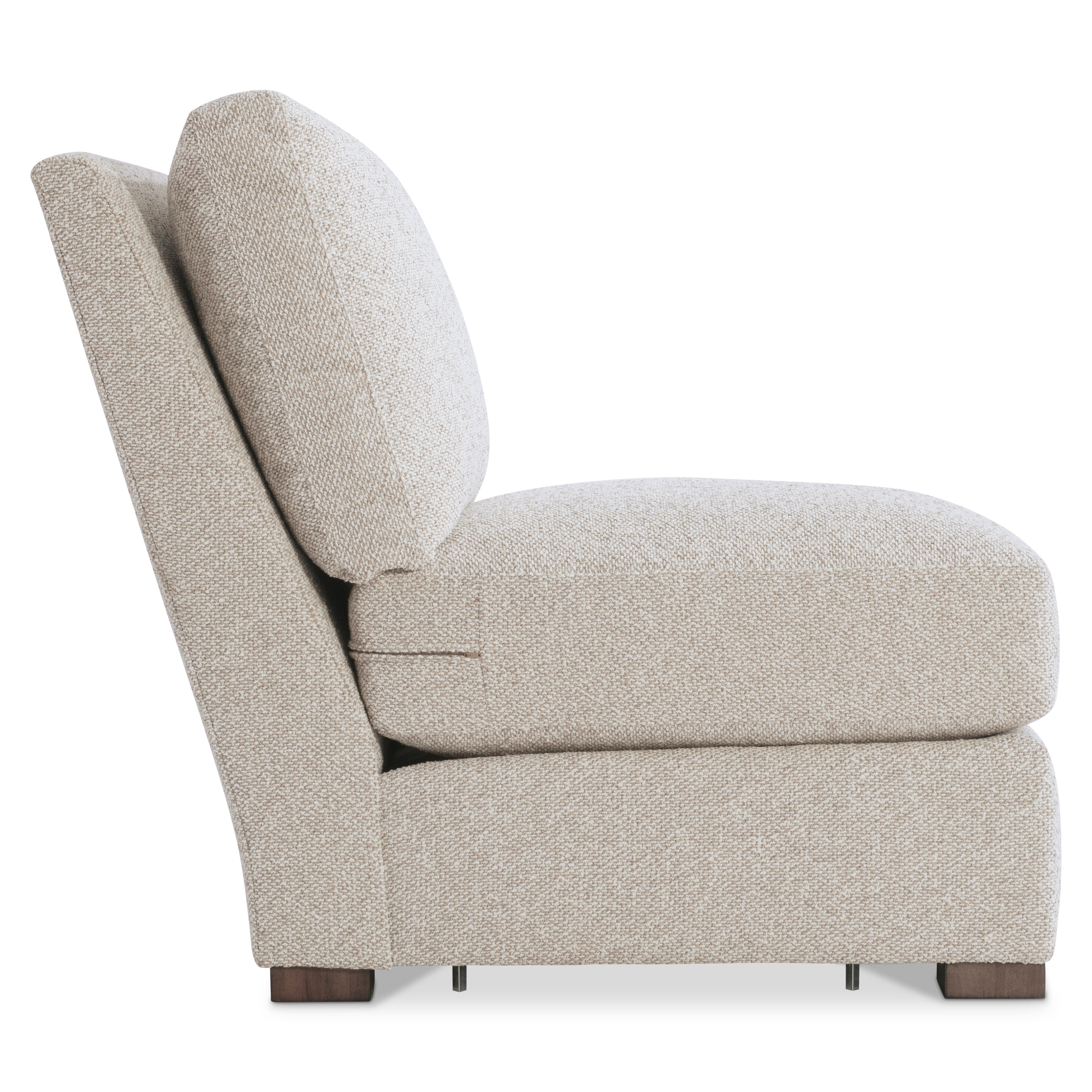 Clean lines and deep cushions blend modern and traditional shaping on the Ventura armless chair. A tall back takes an angled line to the base with low-profile feet. A plush seat cushion and box-edge bordered back pillow provide the ultimate in comfort. This chair can stand alone or be used as part of the Ventura sectional.
