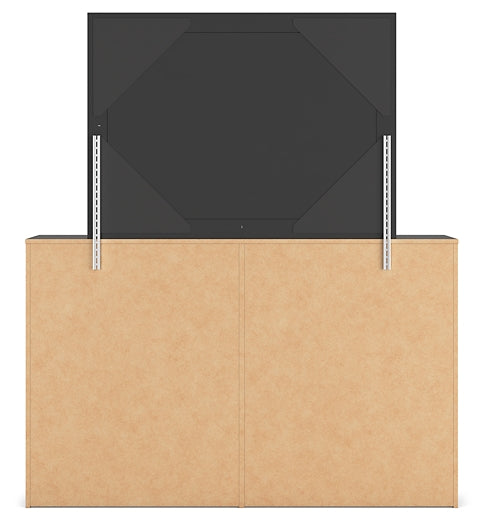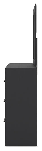 Relaxed yet striking, this dresser and mirror set brings casual beauty and function to your dream destination. The dresser's delightful two-tone treatment blends a fresh replicated walnut grain with a matte black finish. You'll look fabulous in the unadorned simplicity of the mirror, which lends a contemporary touch while you dress for work or play.