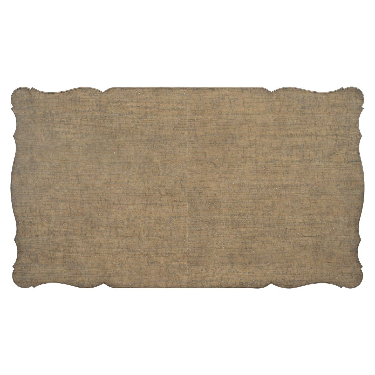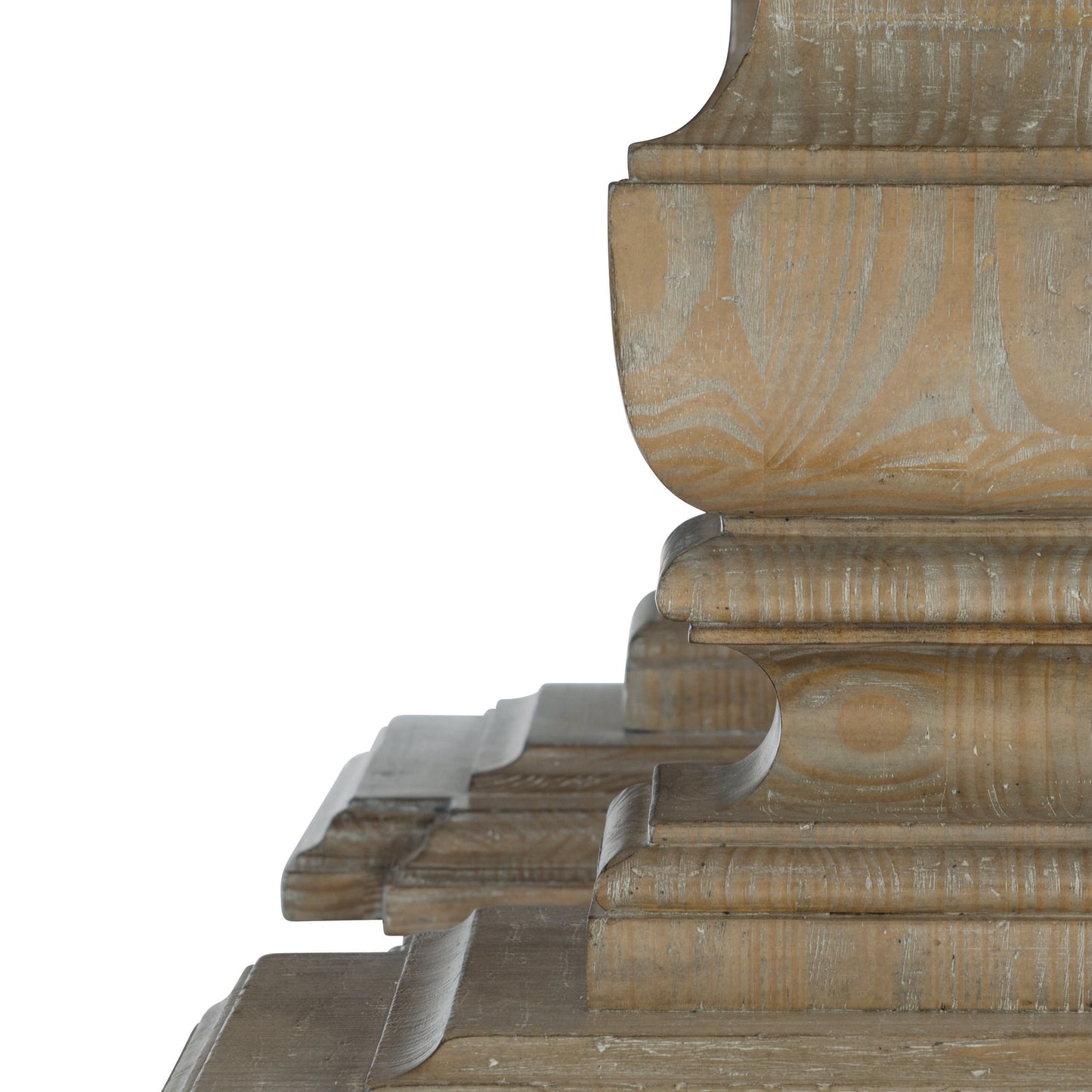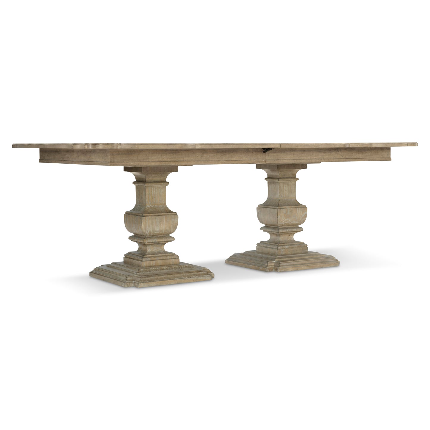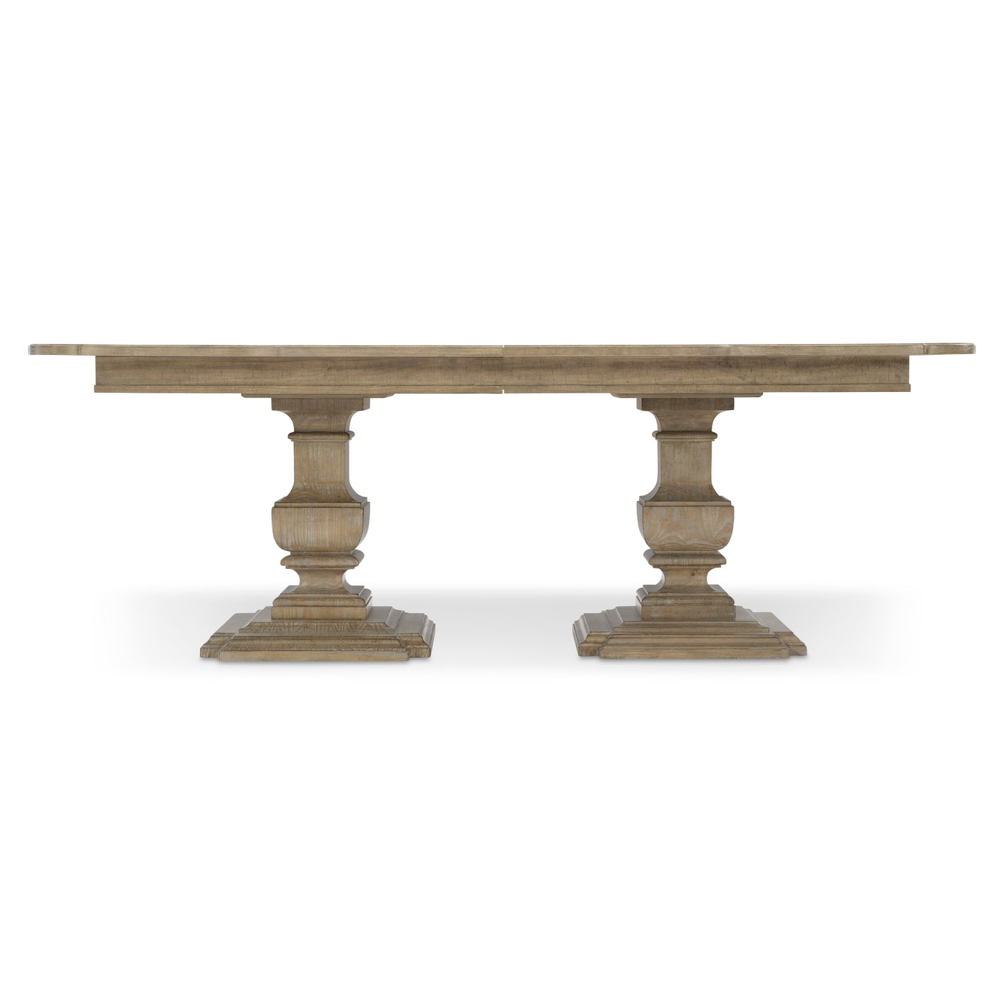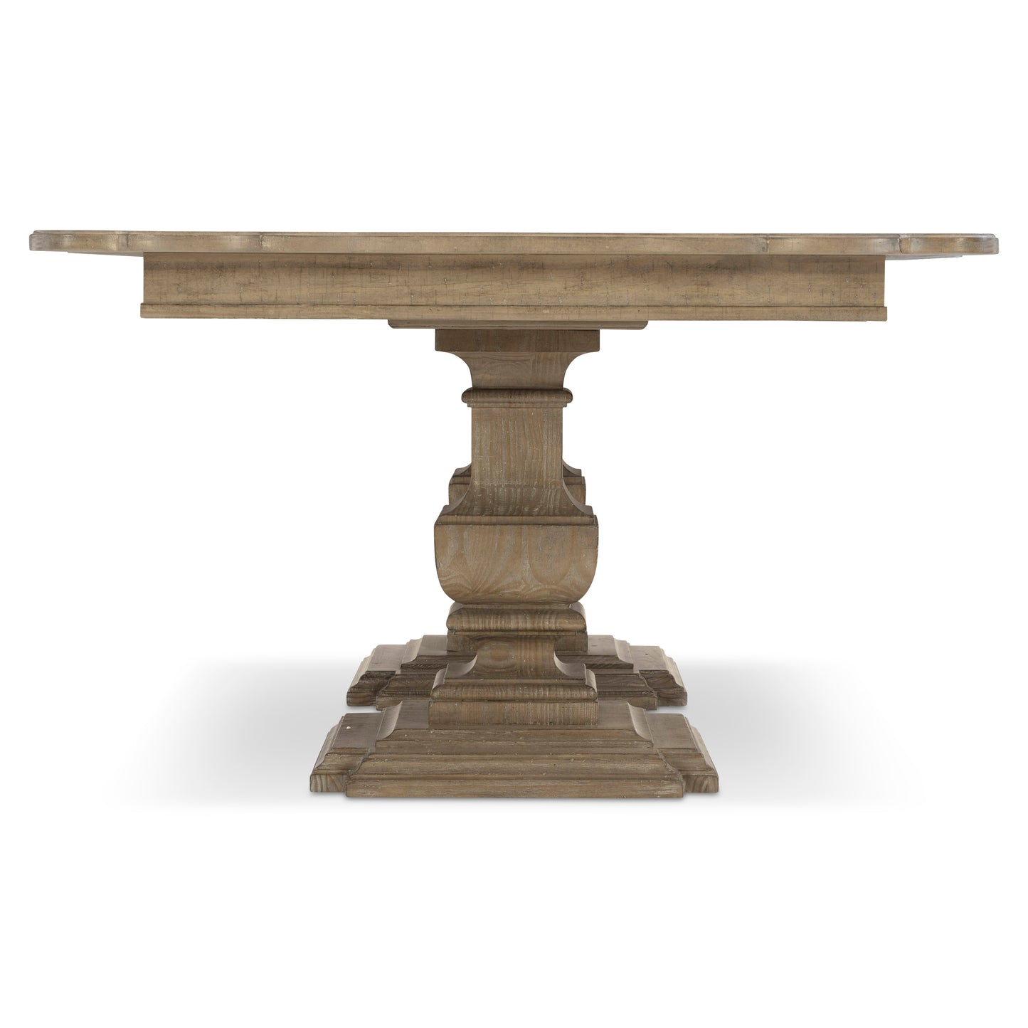 Designed on a grand scale, the Villa Toscana dining table combines the romance of traditional Italian styling with the rustic beauty of a highly distressed Criollo finish on its pine solids and veneers. Visible rifting, scratches and knots in the wood finish add an old-world sentiment and a slightly relaxed mood. Ornately carved, the shaped rectangular top and cast resin pedestals lend a hint of Renaissance splendor to this classic silhouette. With its authentic, timeworn character, this piece fills a room with presence and warmth as if it’s been there forever.